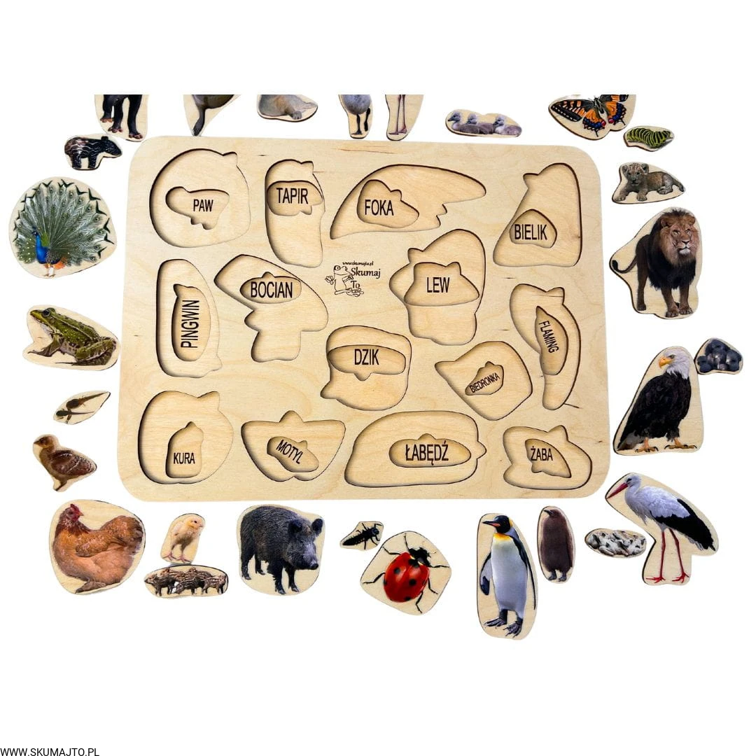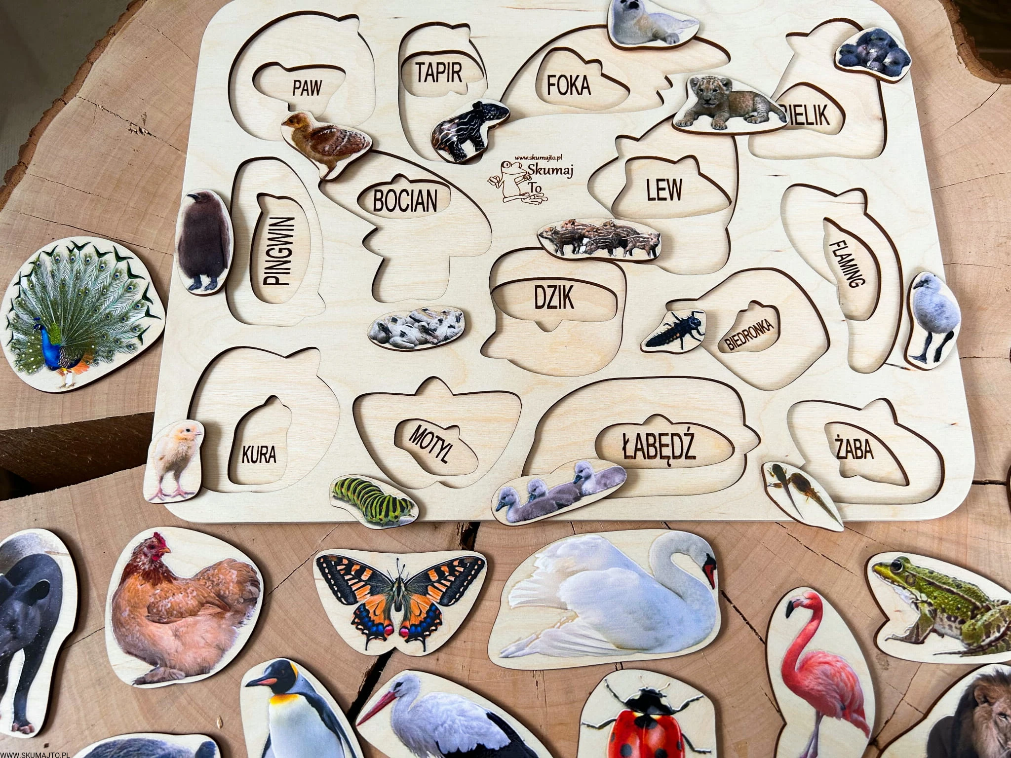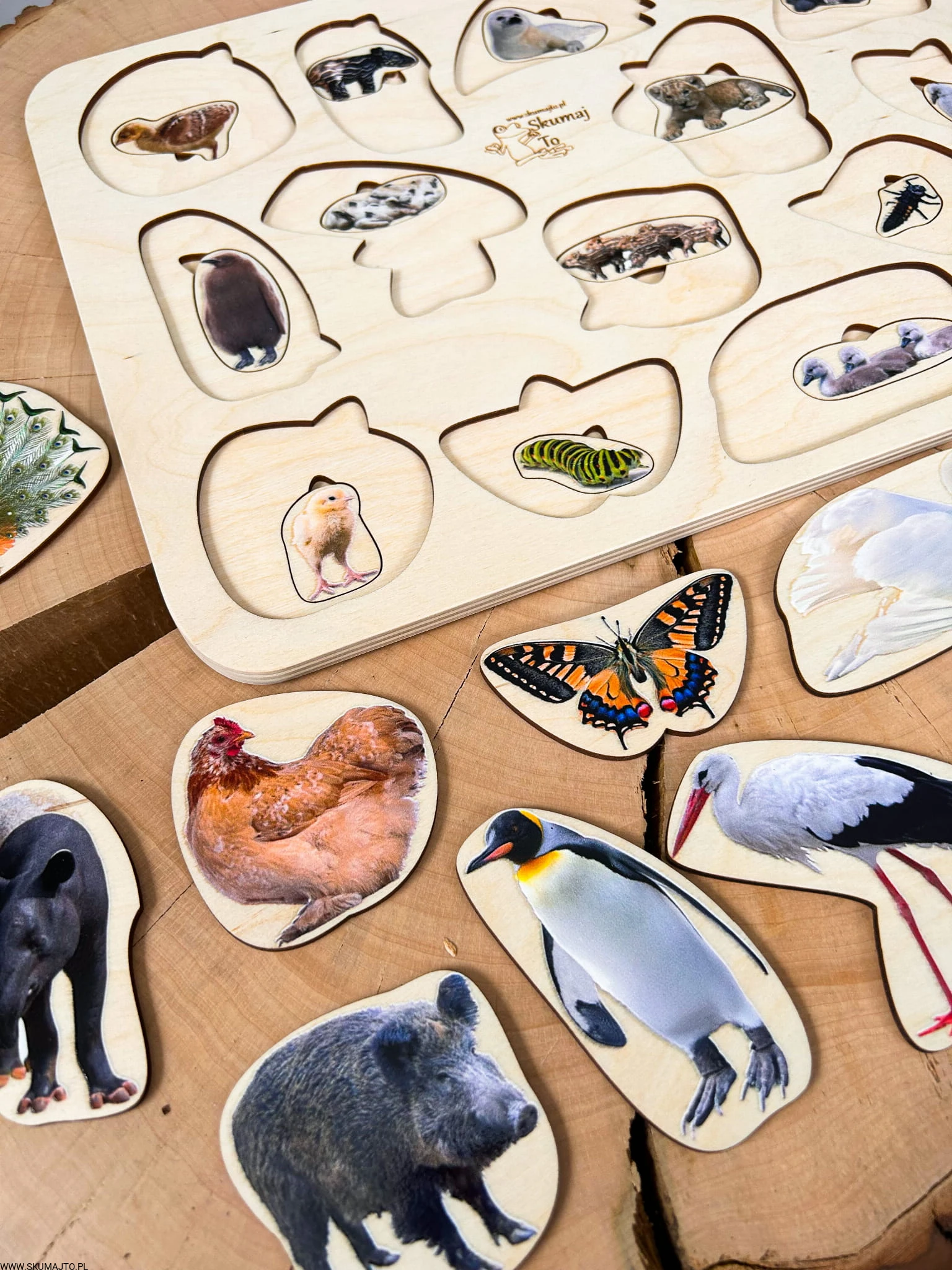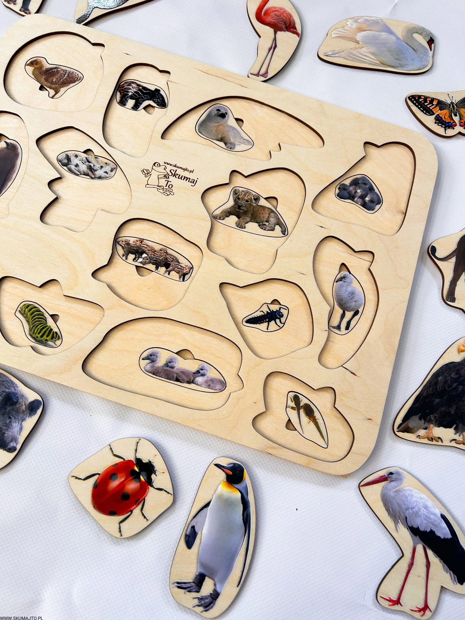 Dzieci zwierząt, drewniana układanka warstwowa, zwierzęta i ich dzieci, nauka zwierząt