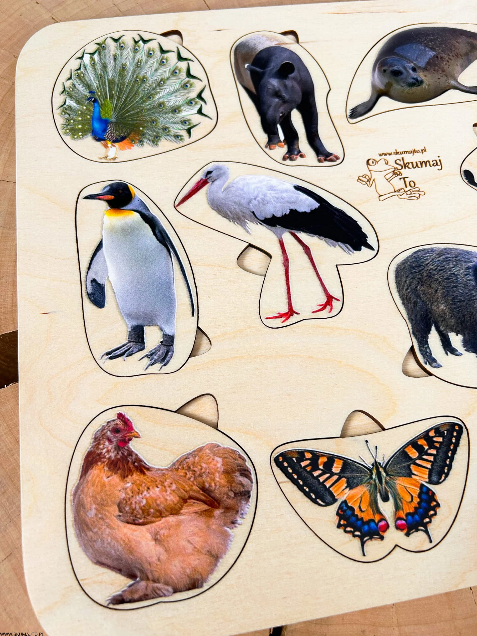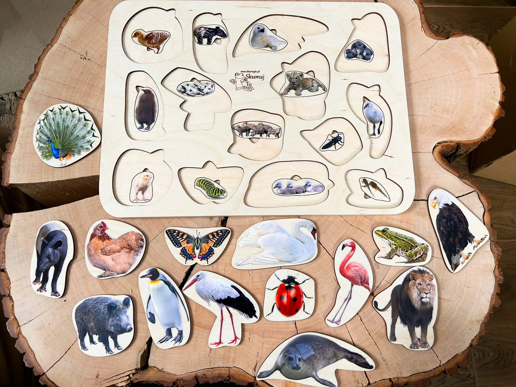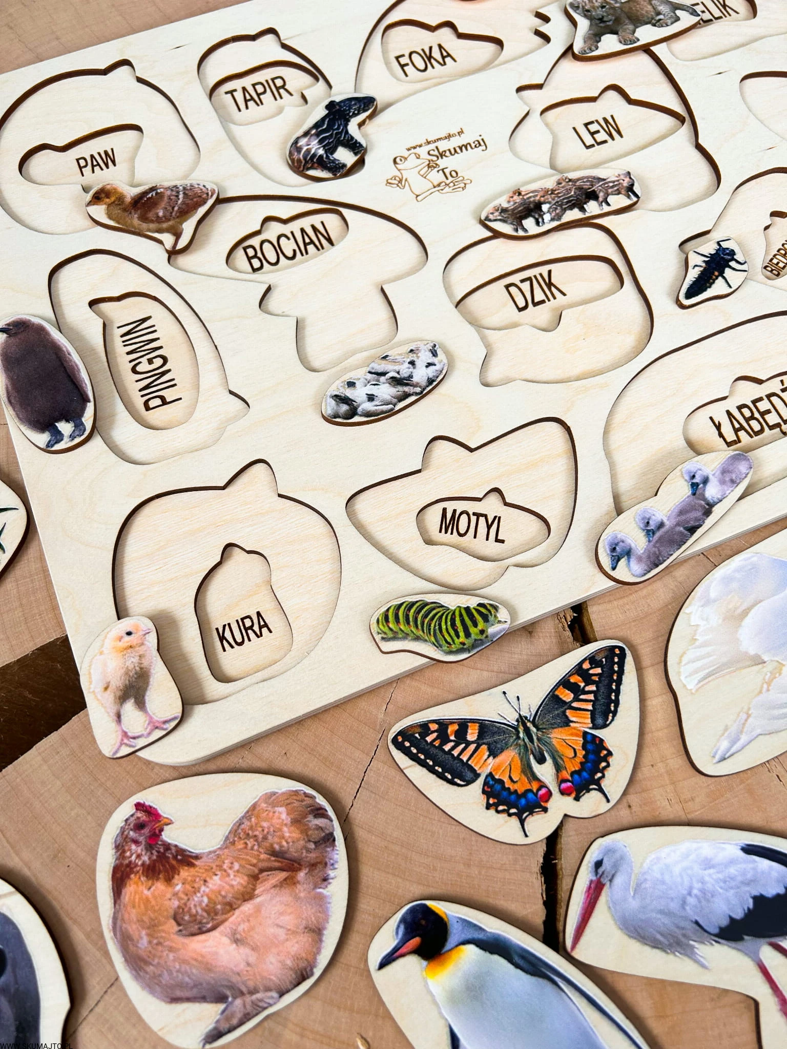 Dzieci zwierząt, drewniana układanka warstwowa, zwierzęta i ich dzieci, nauka zwierząt