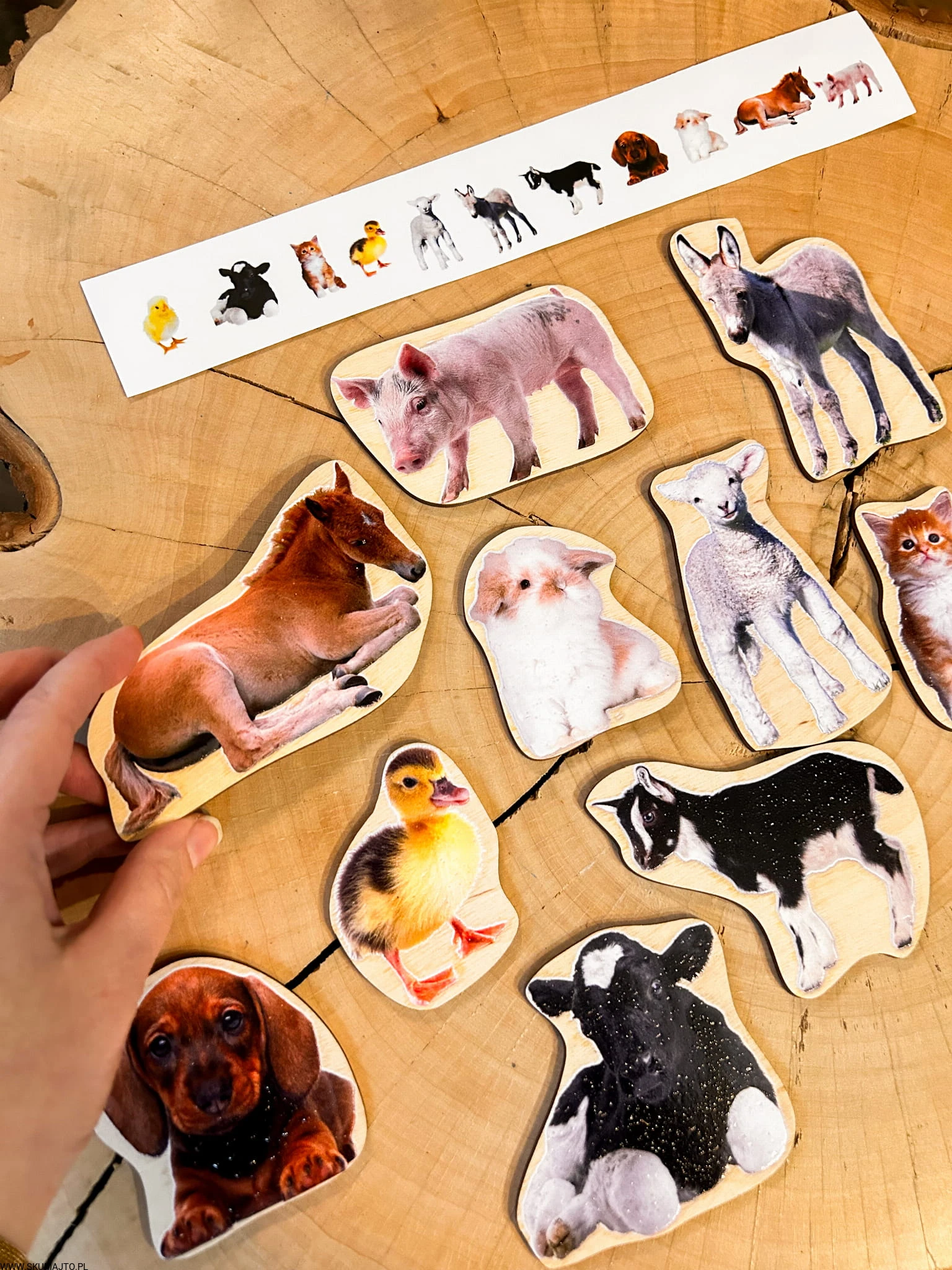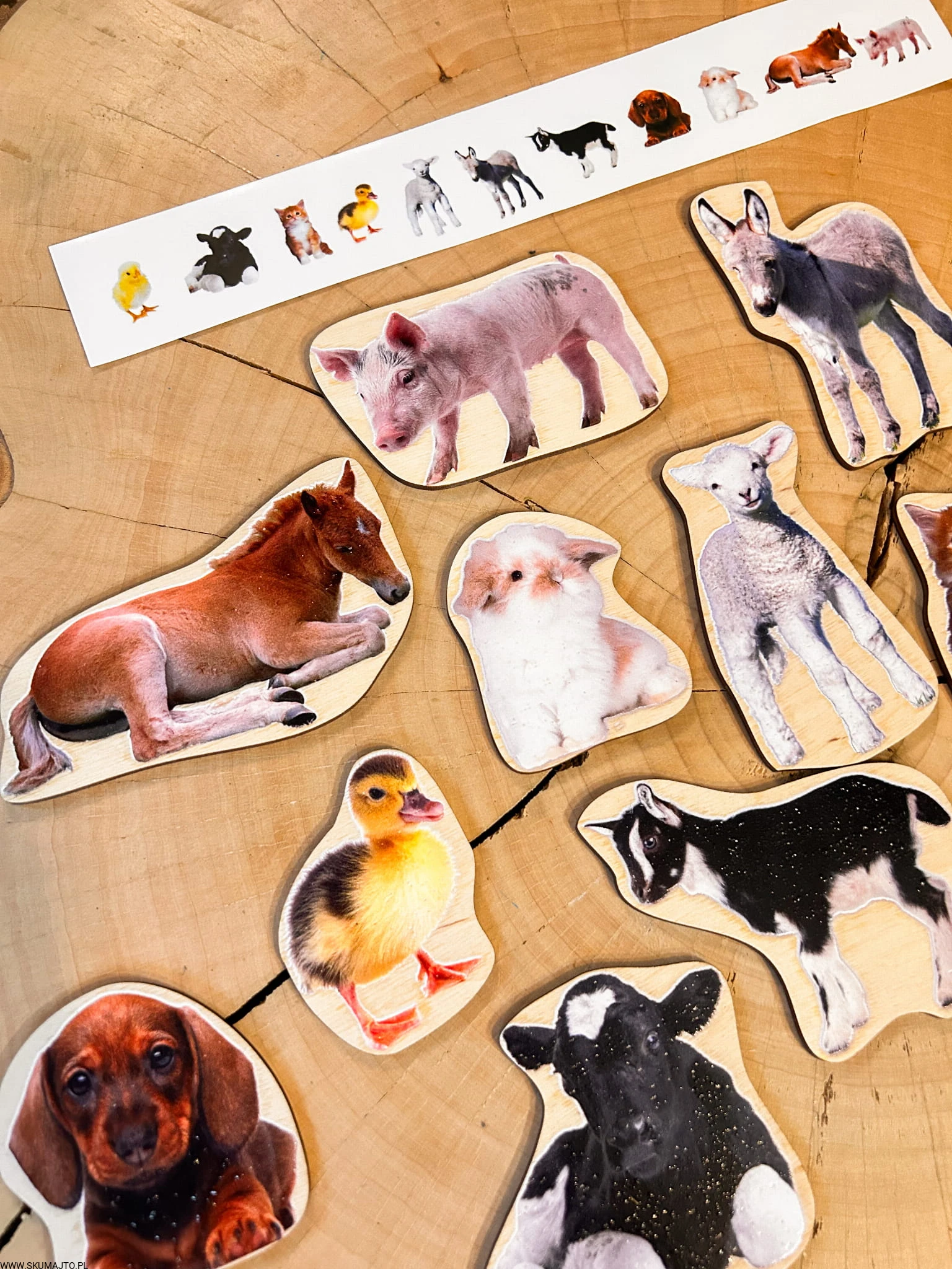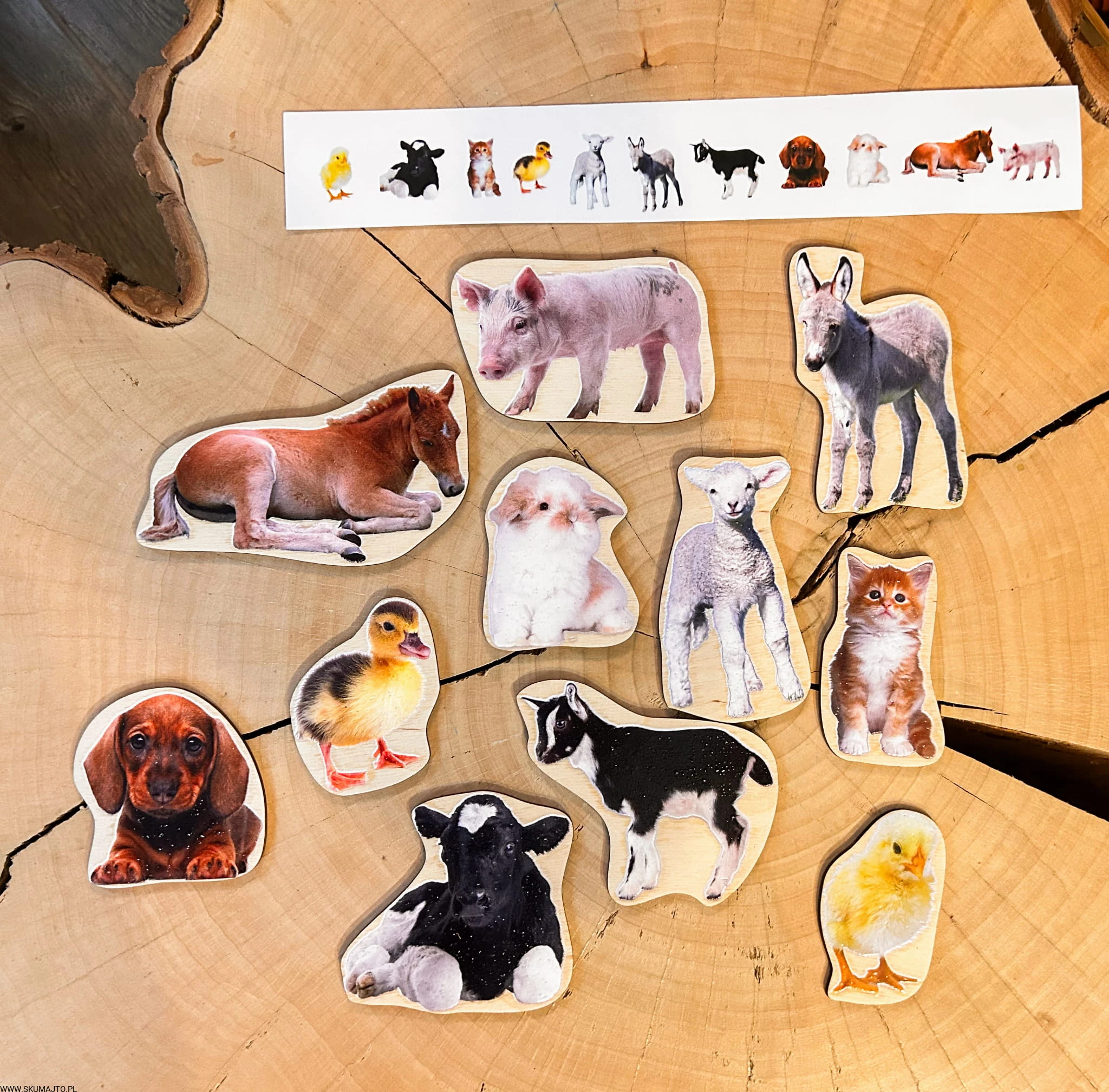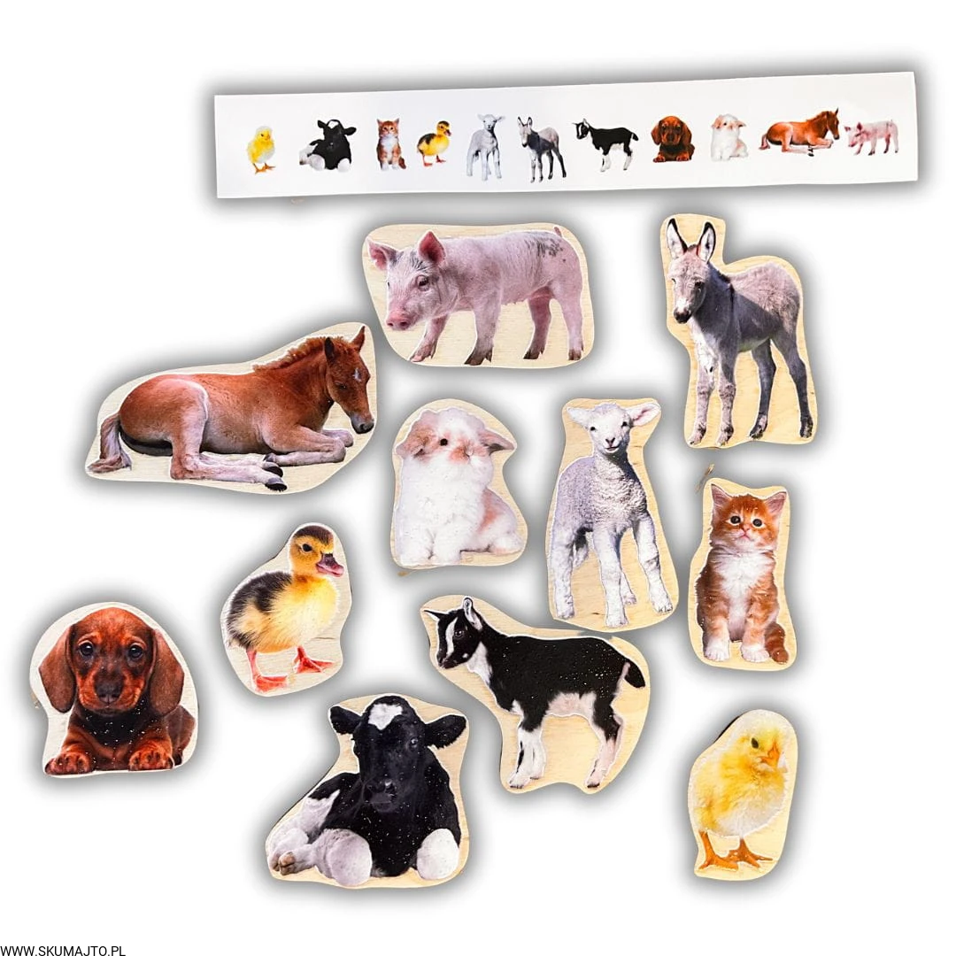 Dzieci zwierząt wiejskich, drewniana układanka do odwzorowywania