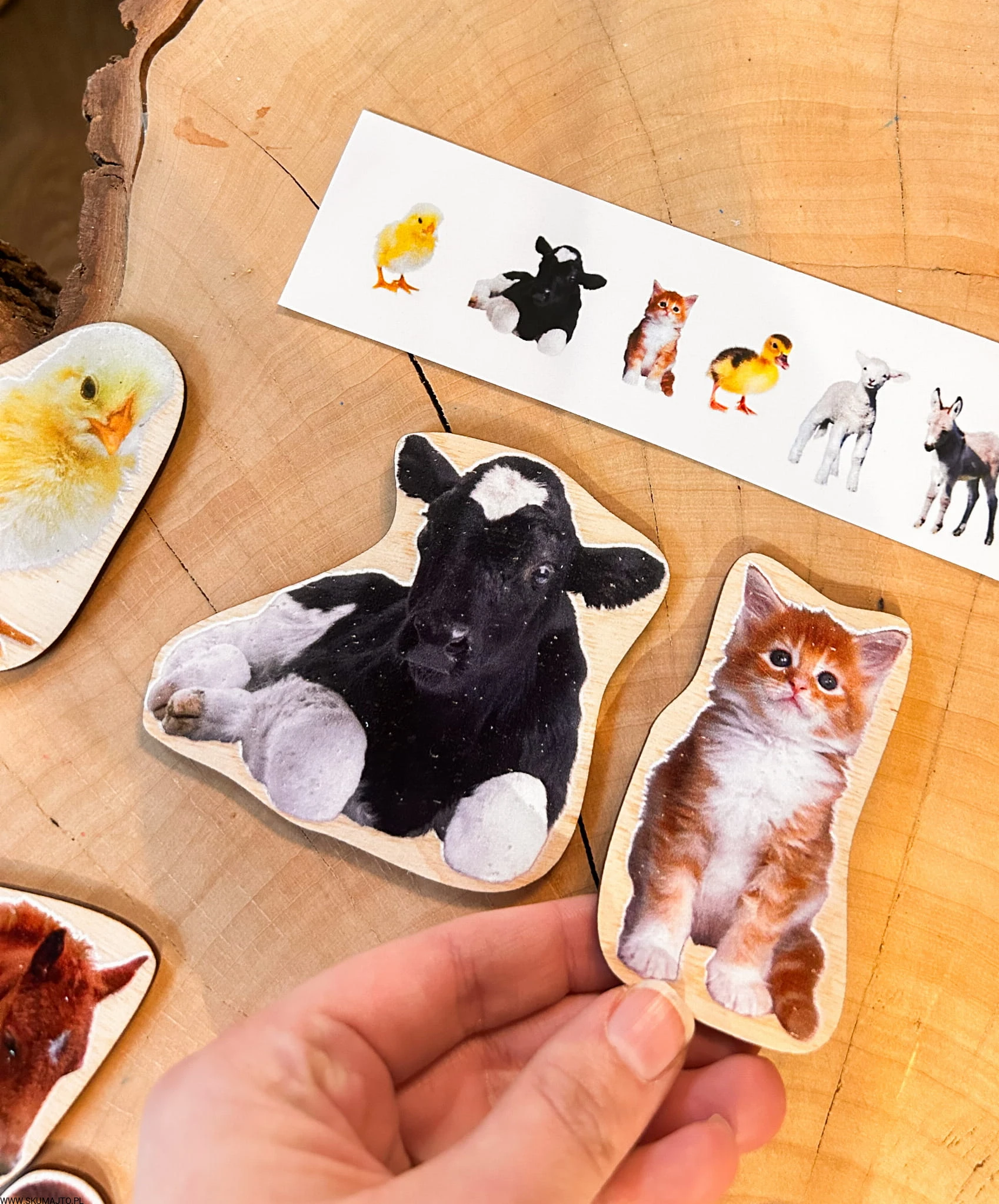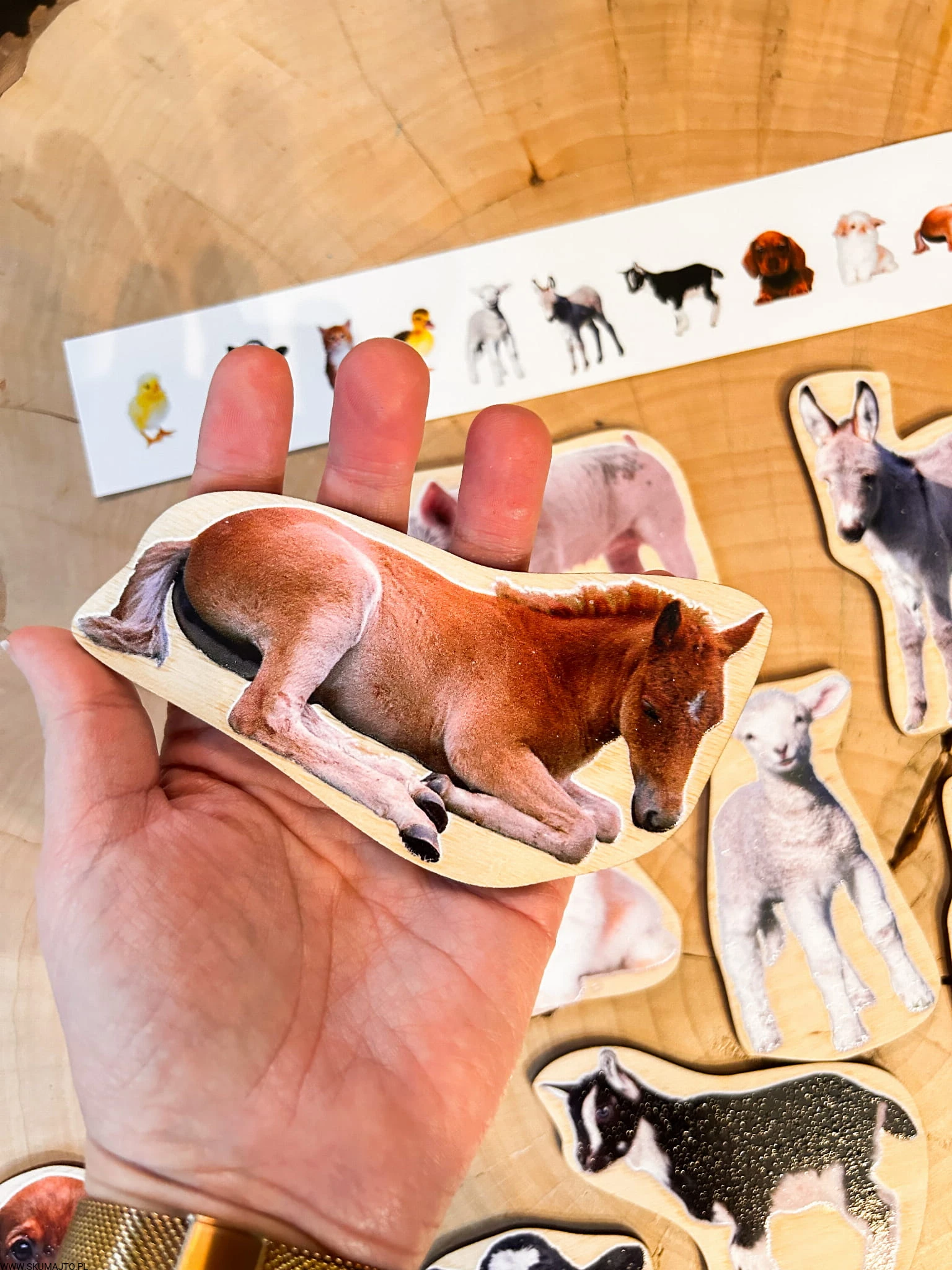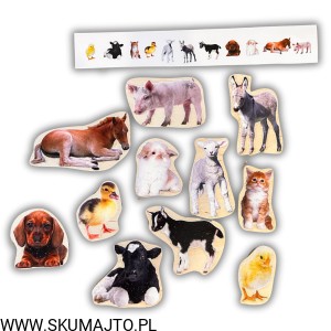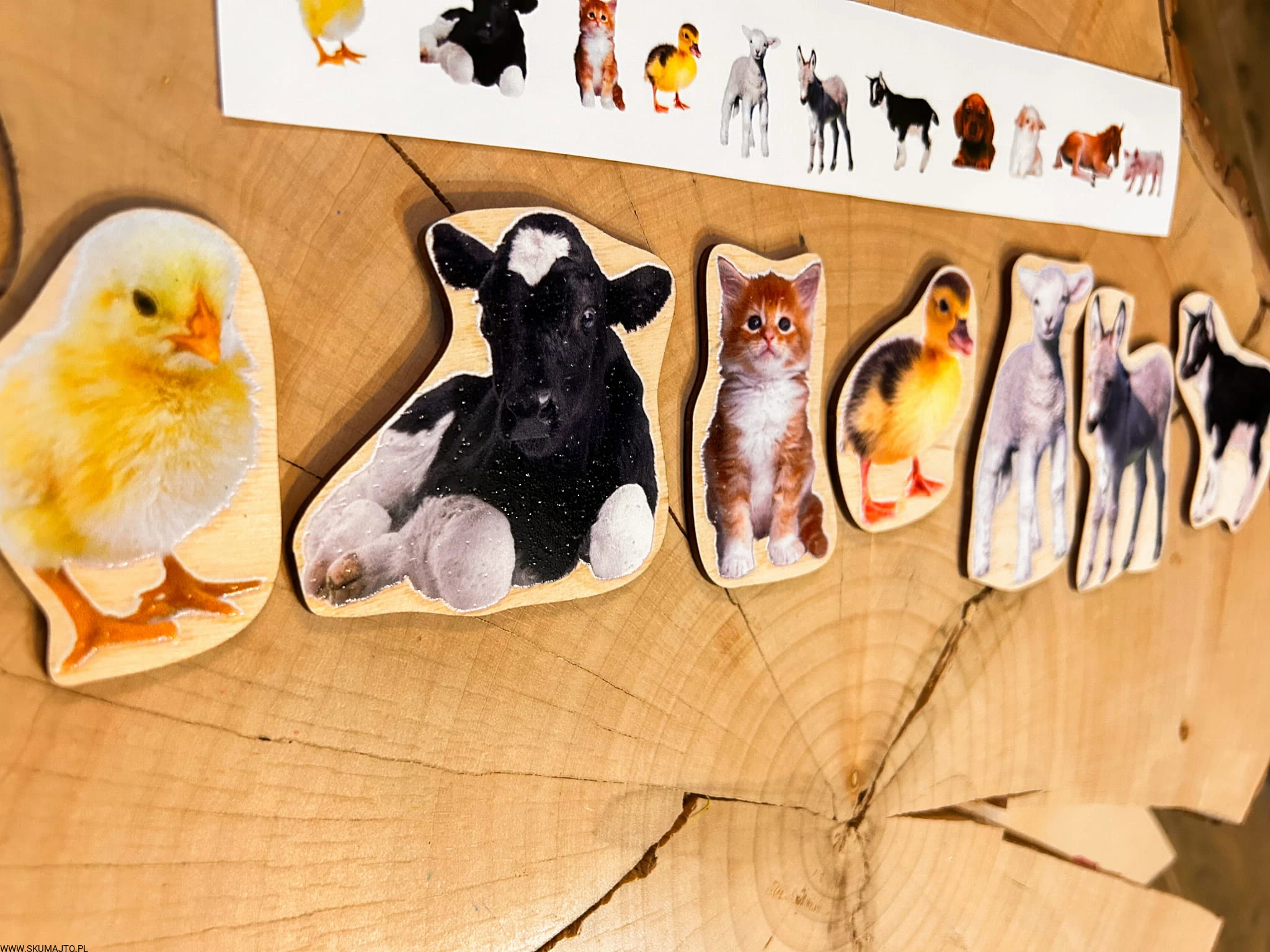 Dzieci zwierząt wiejskich, drewniana układanka do odwzorowywania