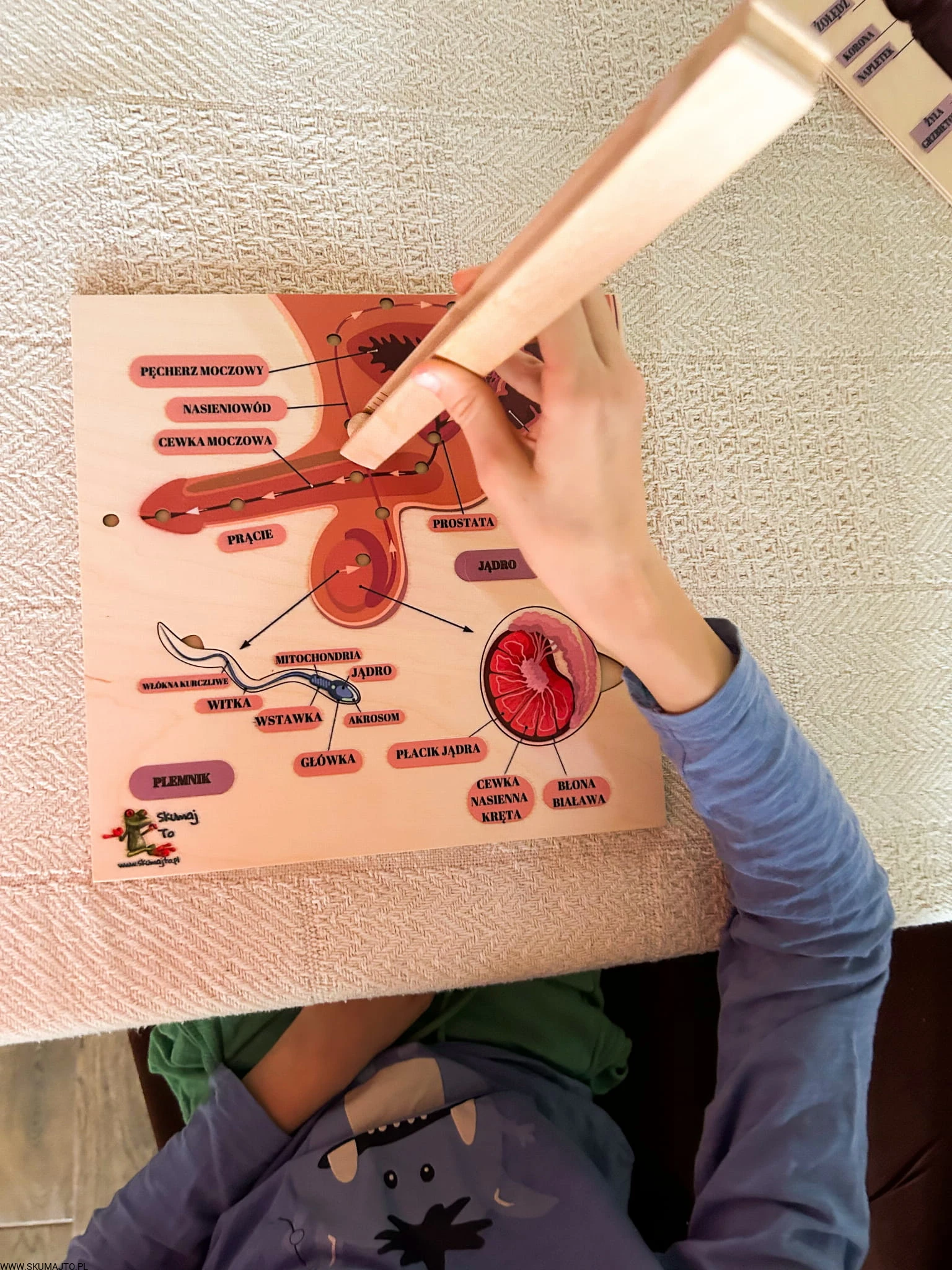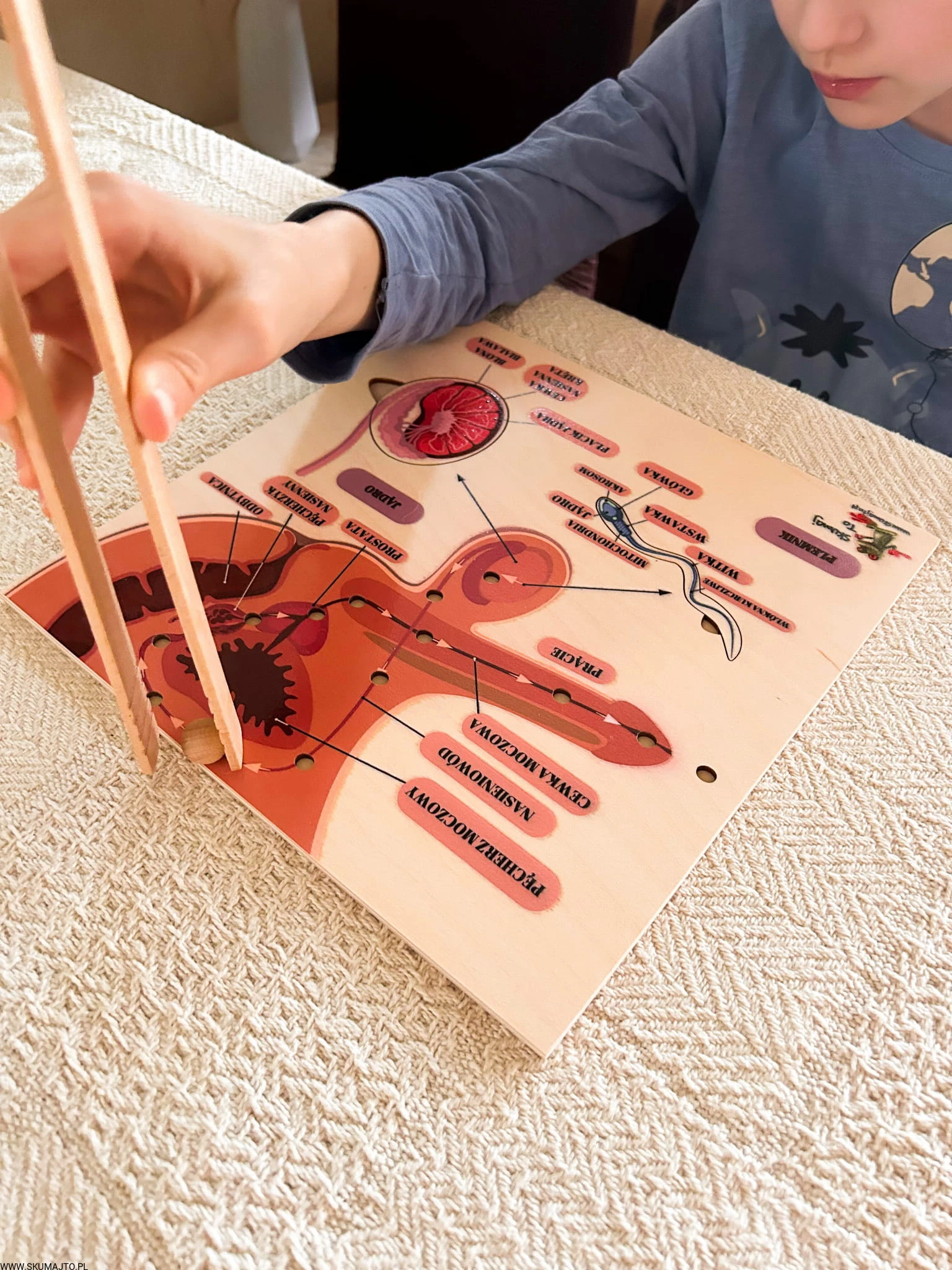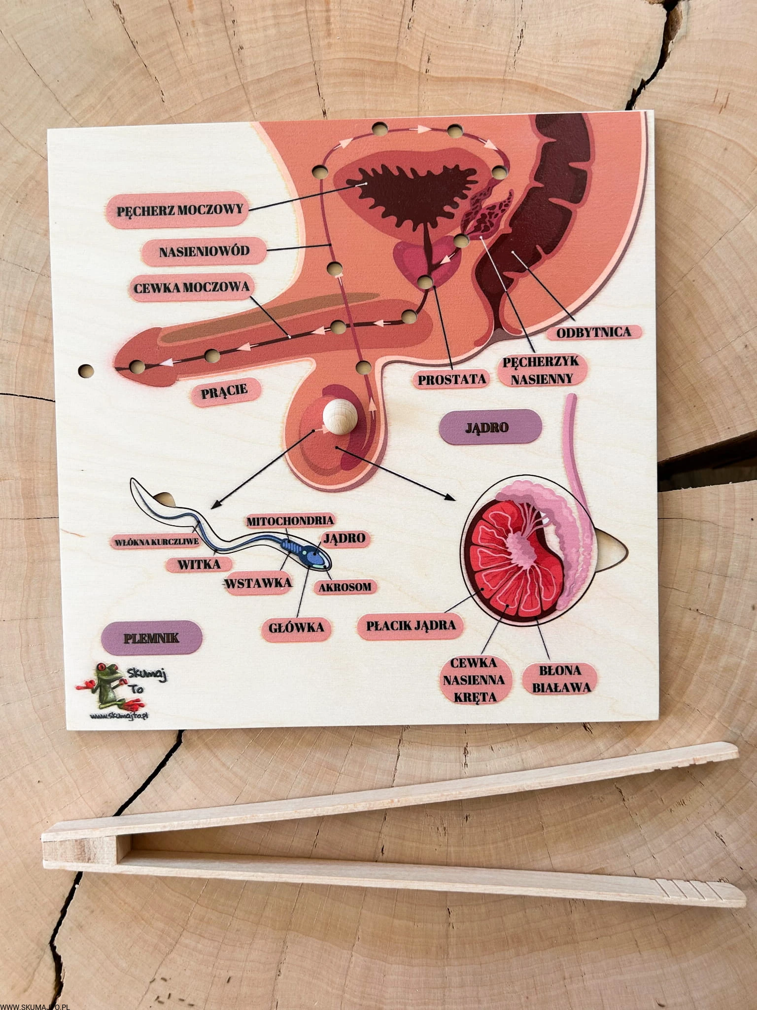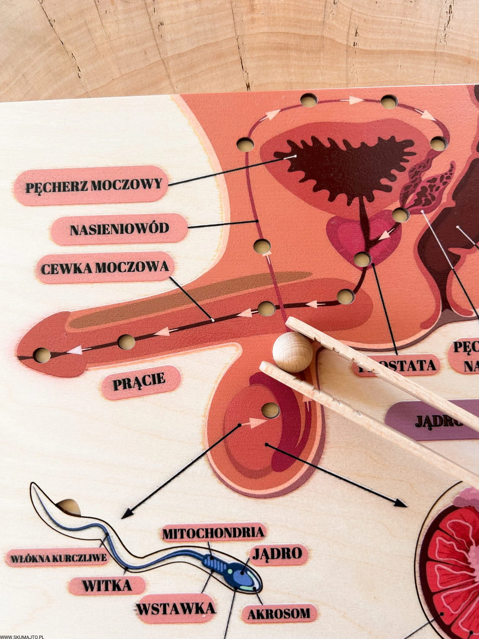 W zestawie jest kulka i szczypce- dziecko może poznać drogę nasienia z jądra do cewki moczowej.