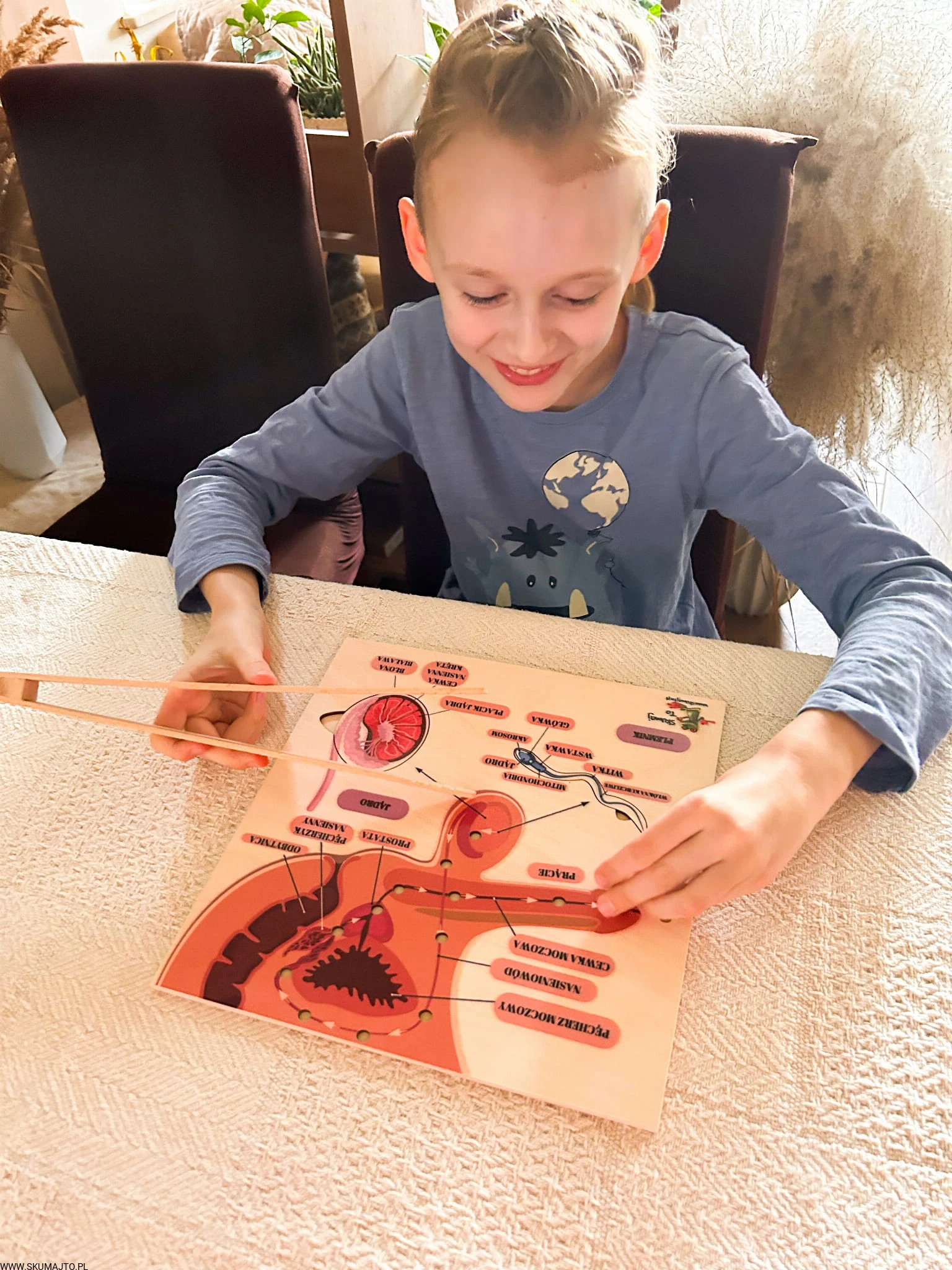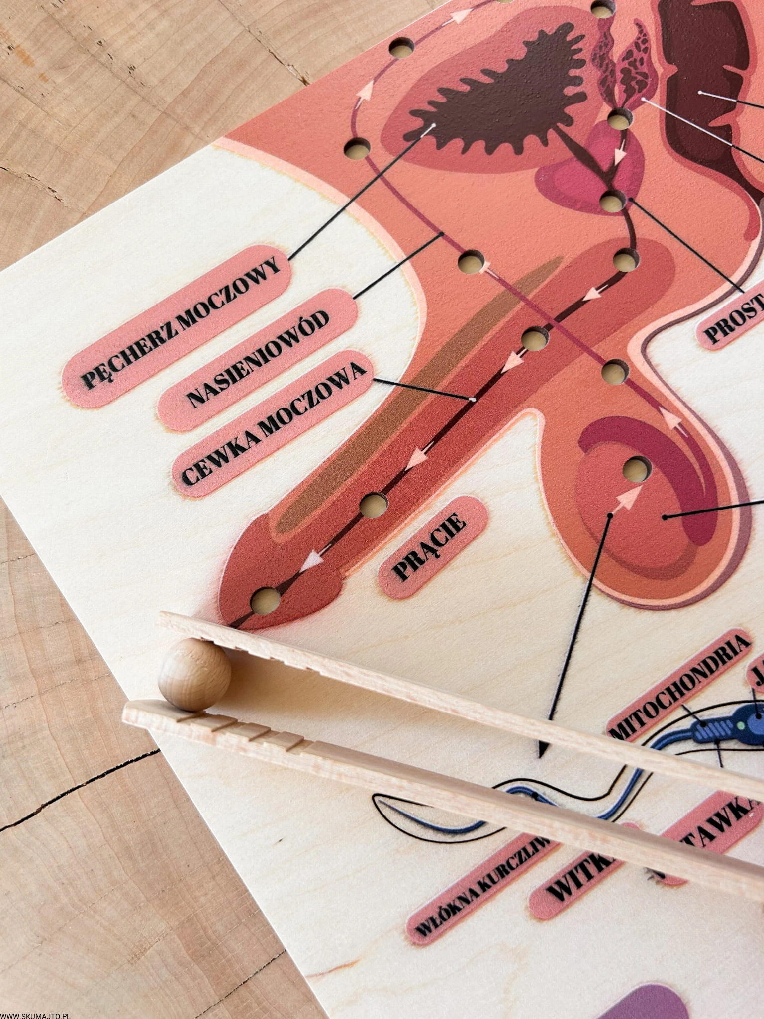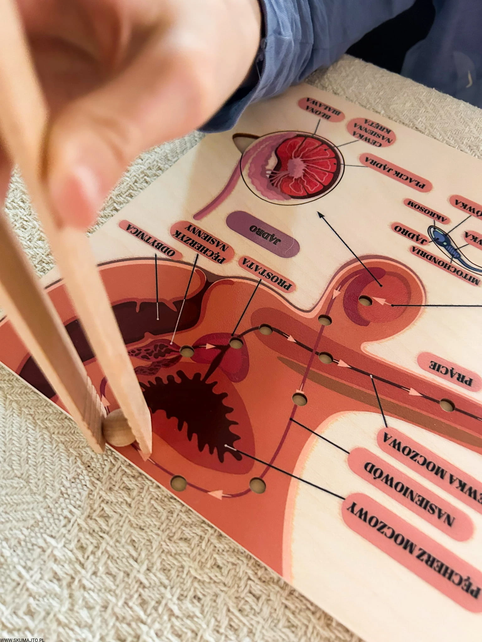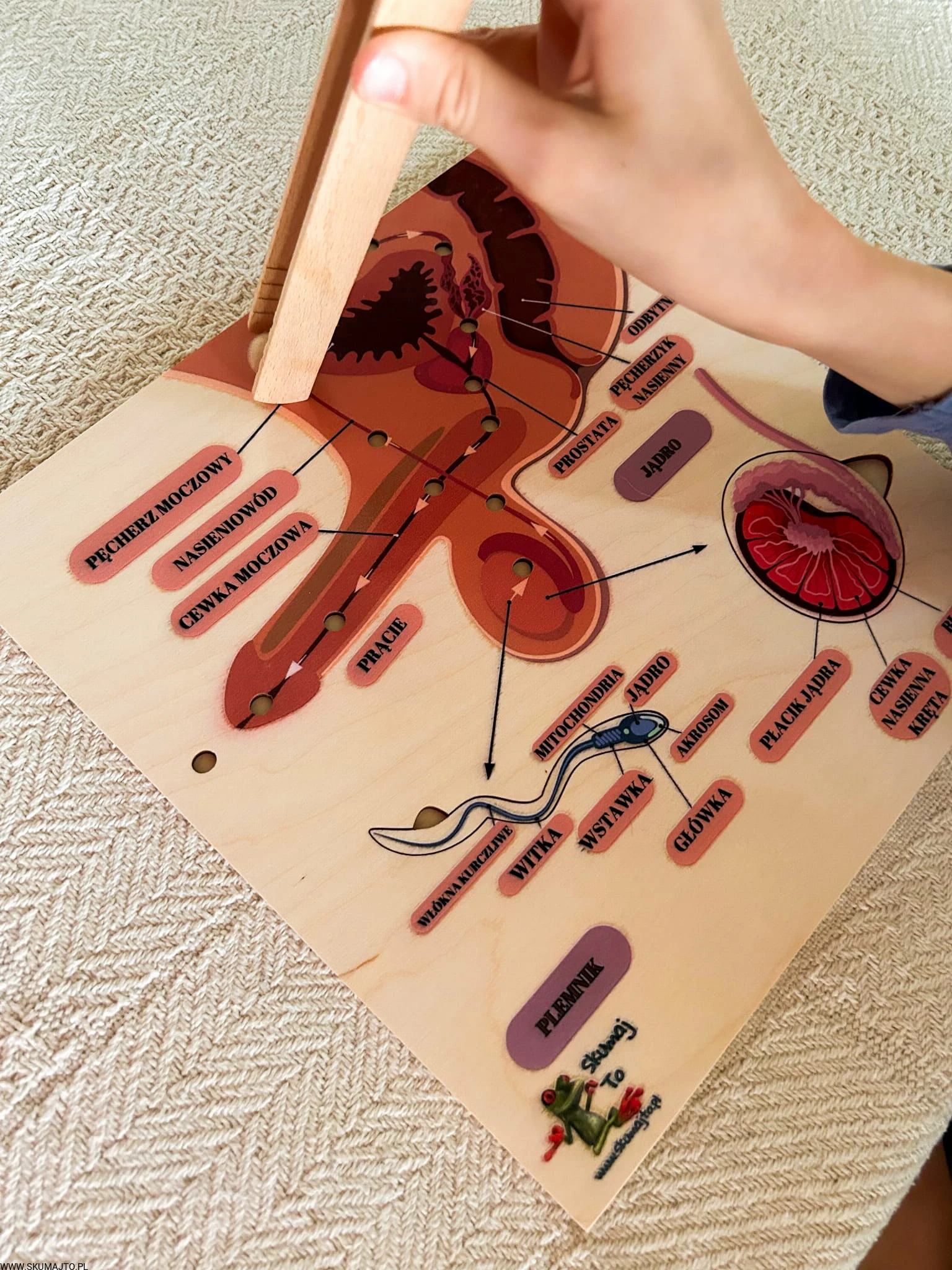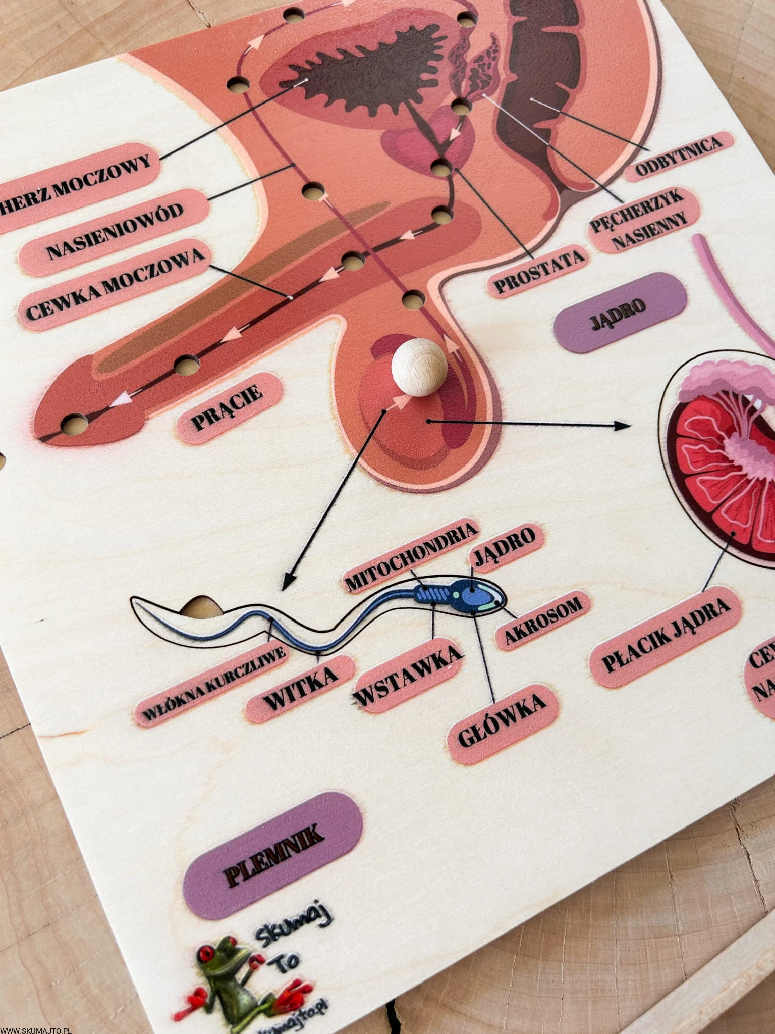 W zestawie jest kulka i szczypce- dziecko może poznać drogę nasienia z jądra do cewki moczowej.