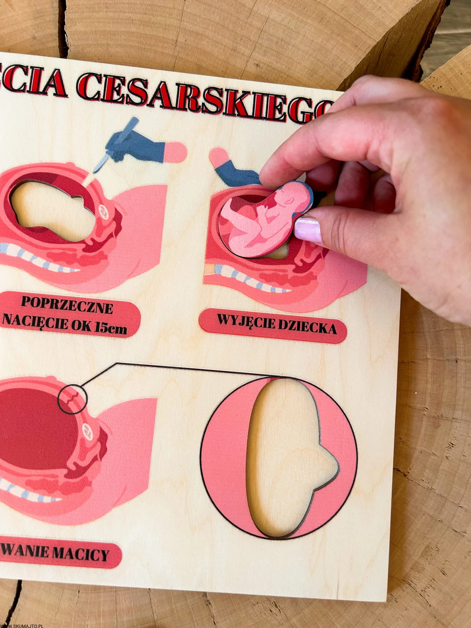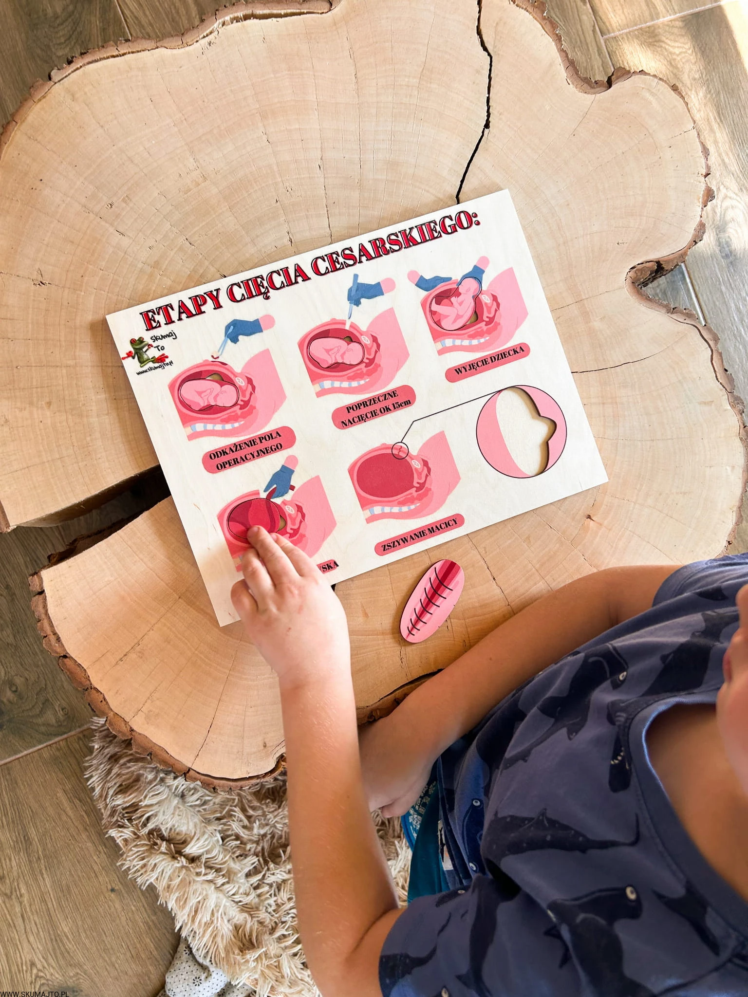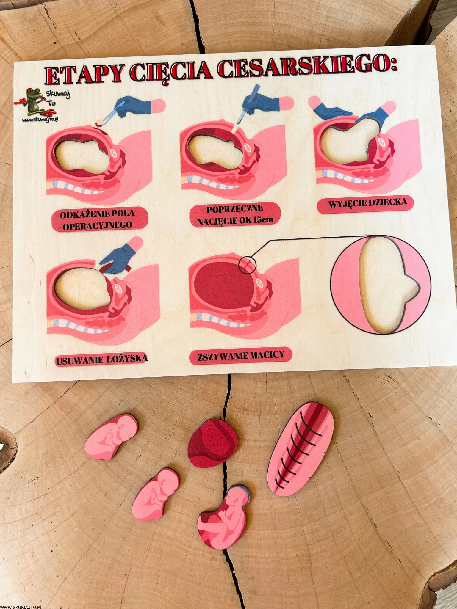 Etapy cięcia cesarskiego układanka drewniana, poród, ciąża