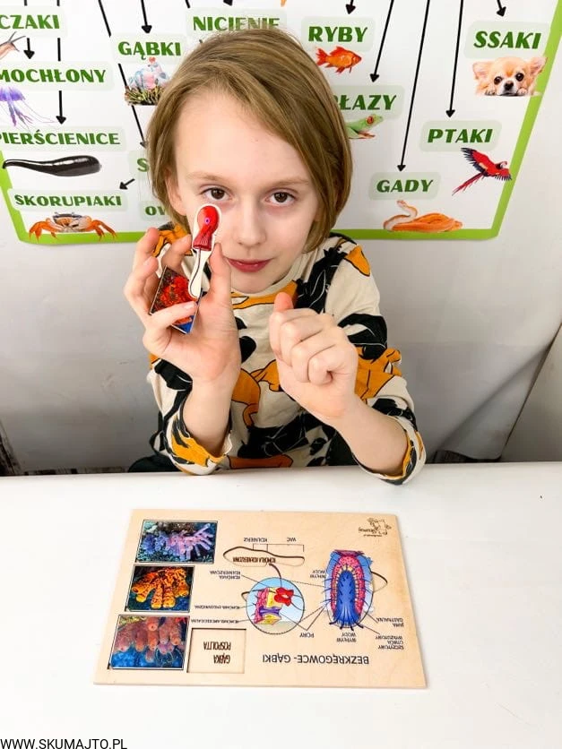 Poznaj fascynujący świat gąbek dzięki naszej edukacyjnej układance! Ta pomoc dydaktyczna została stworzona, aby w przystępny sposób przybliżyć dzieciom budowę anatomiczną gąbek oraz ich różnorodność gatunkową.