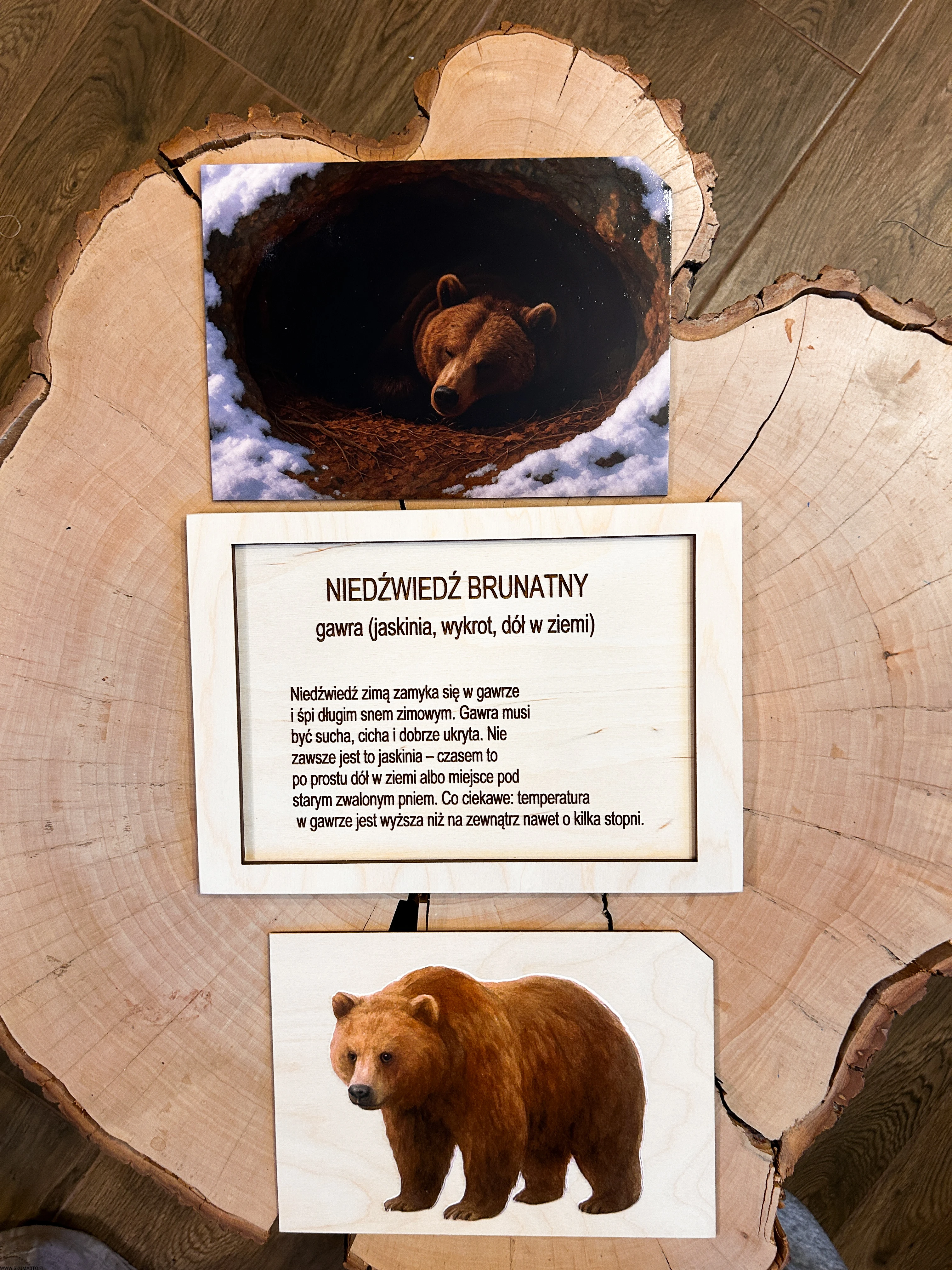 Środkowa: plansza z opisem gawry i zwyczajów snu zimowego niedźwiedzia