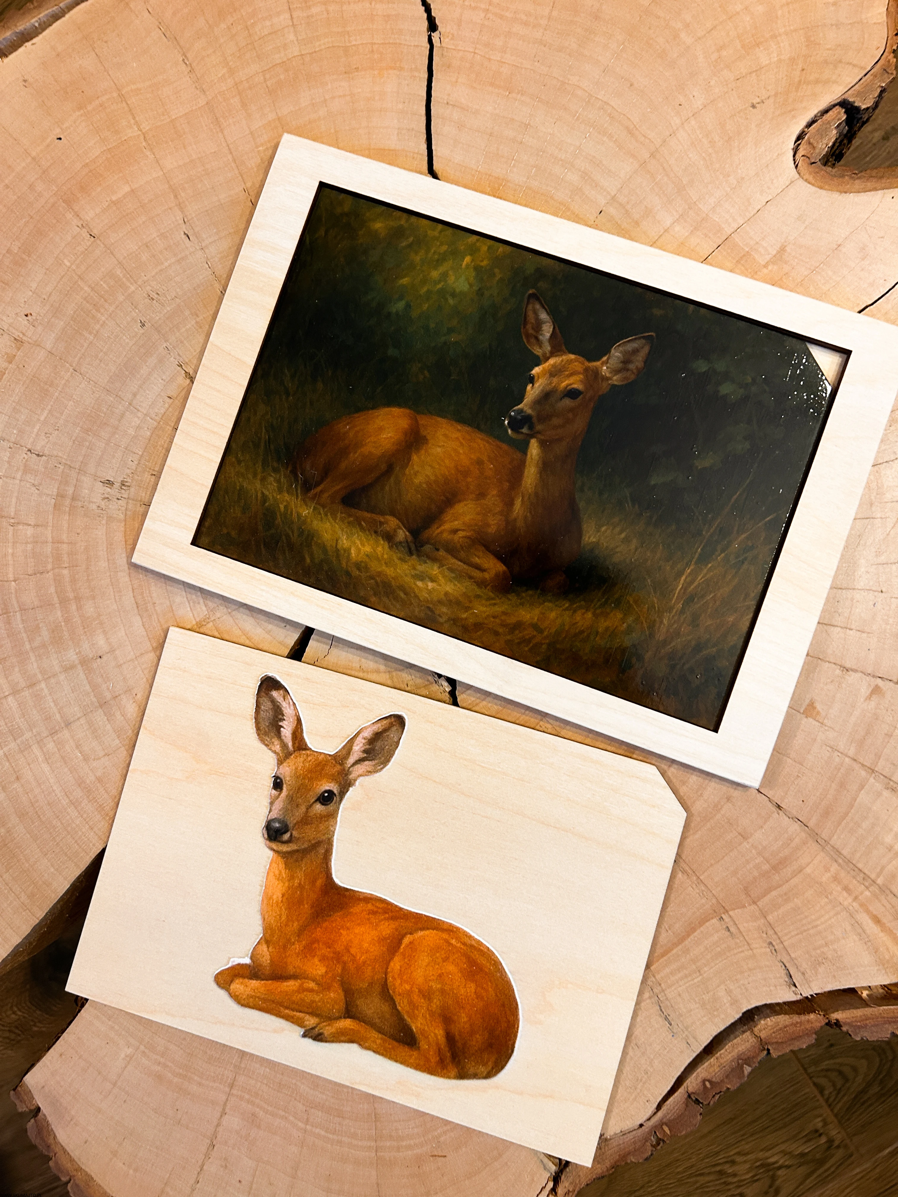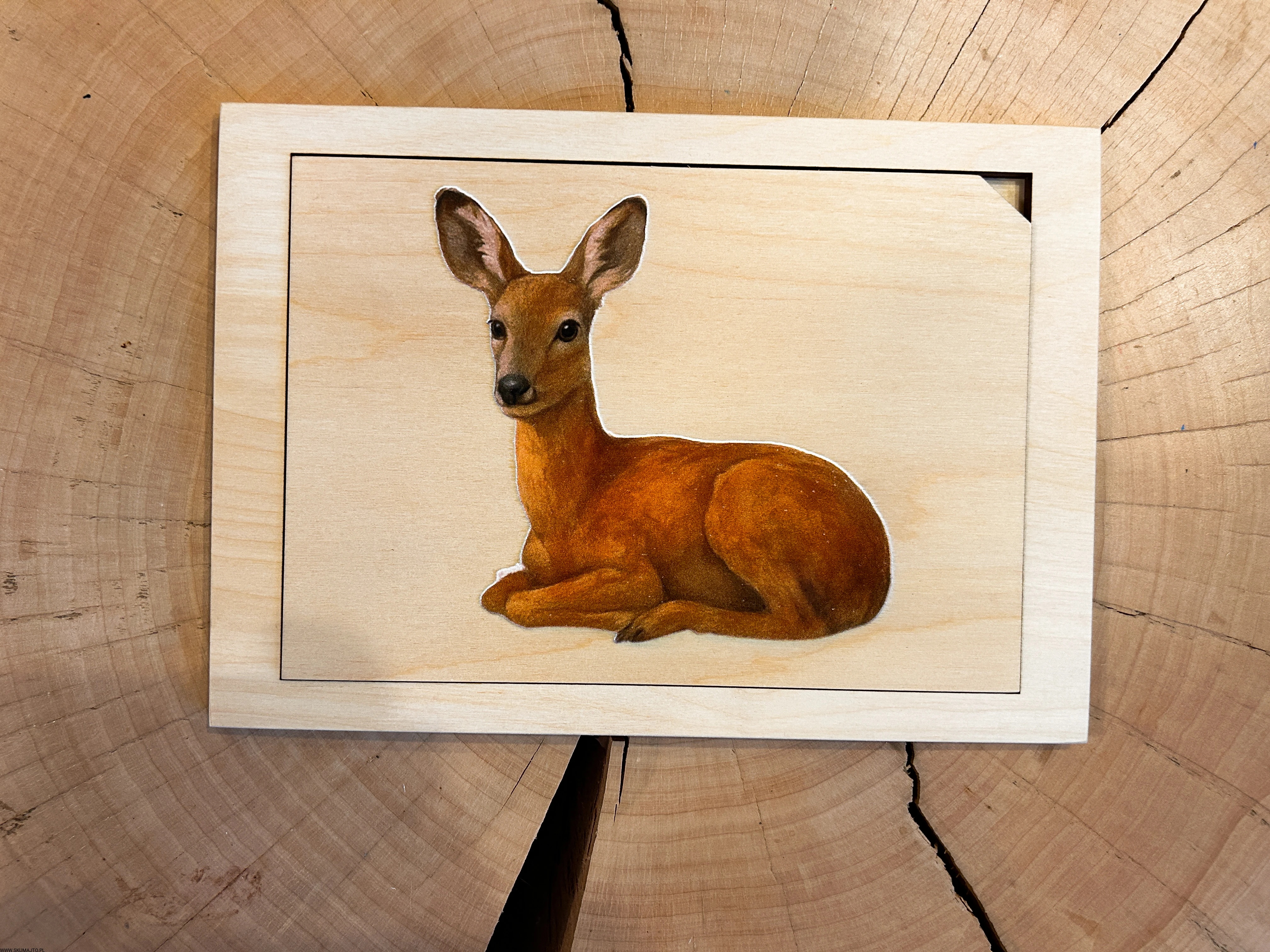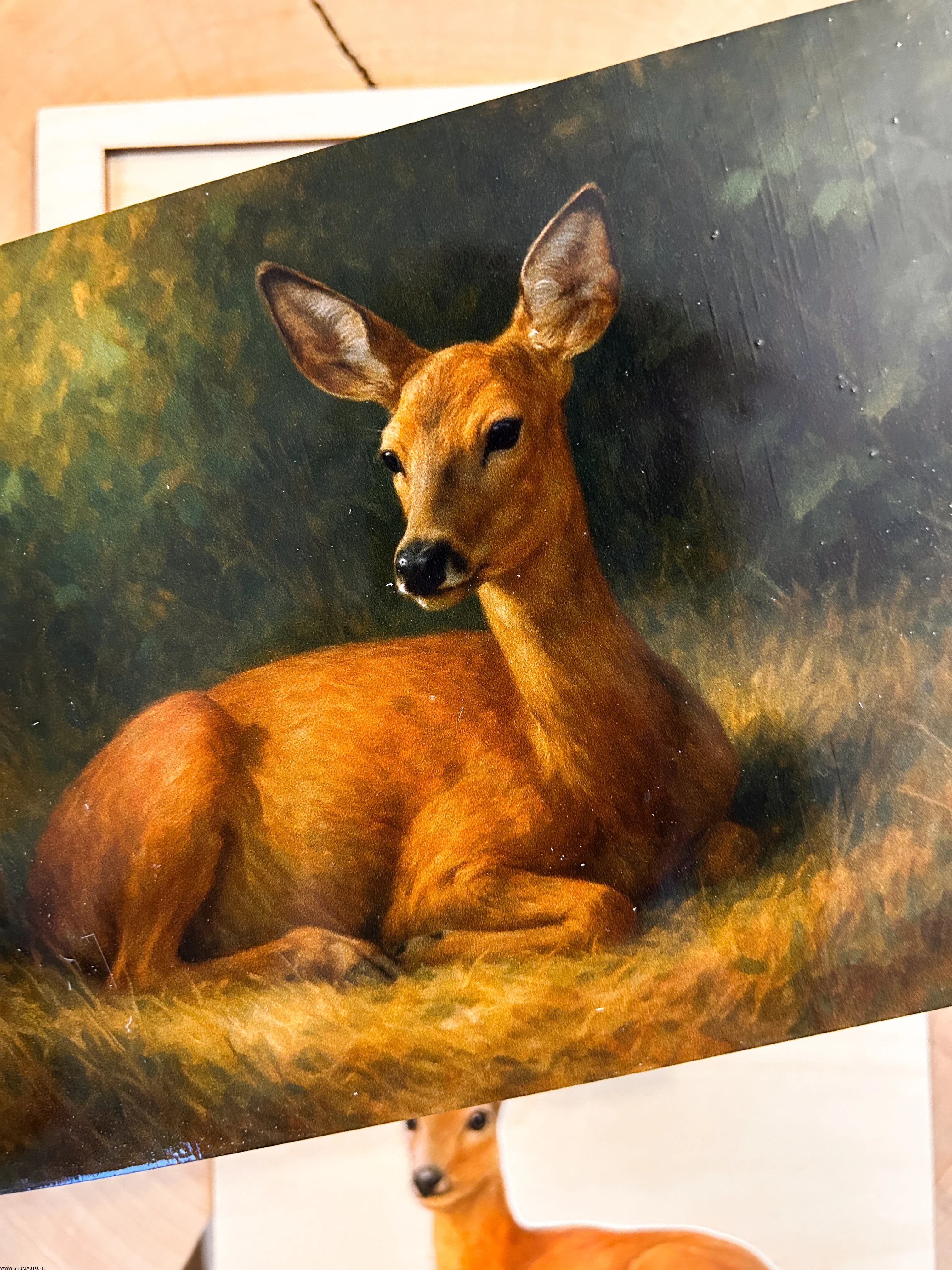 Górna warstwa: realistyczna ilustracja sarny w pozycji stojącej