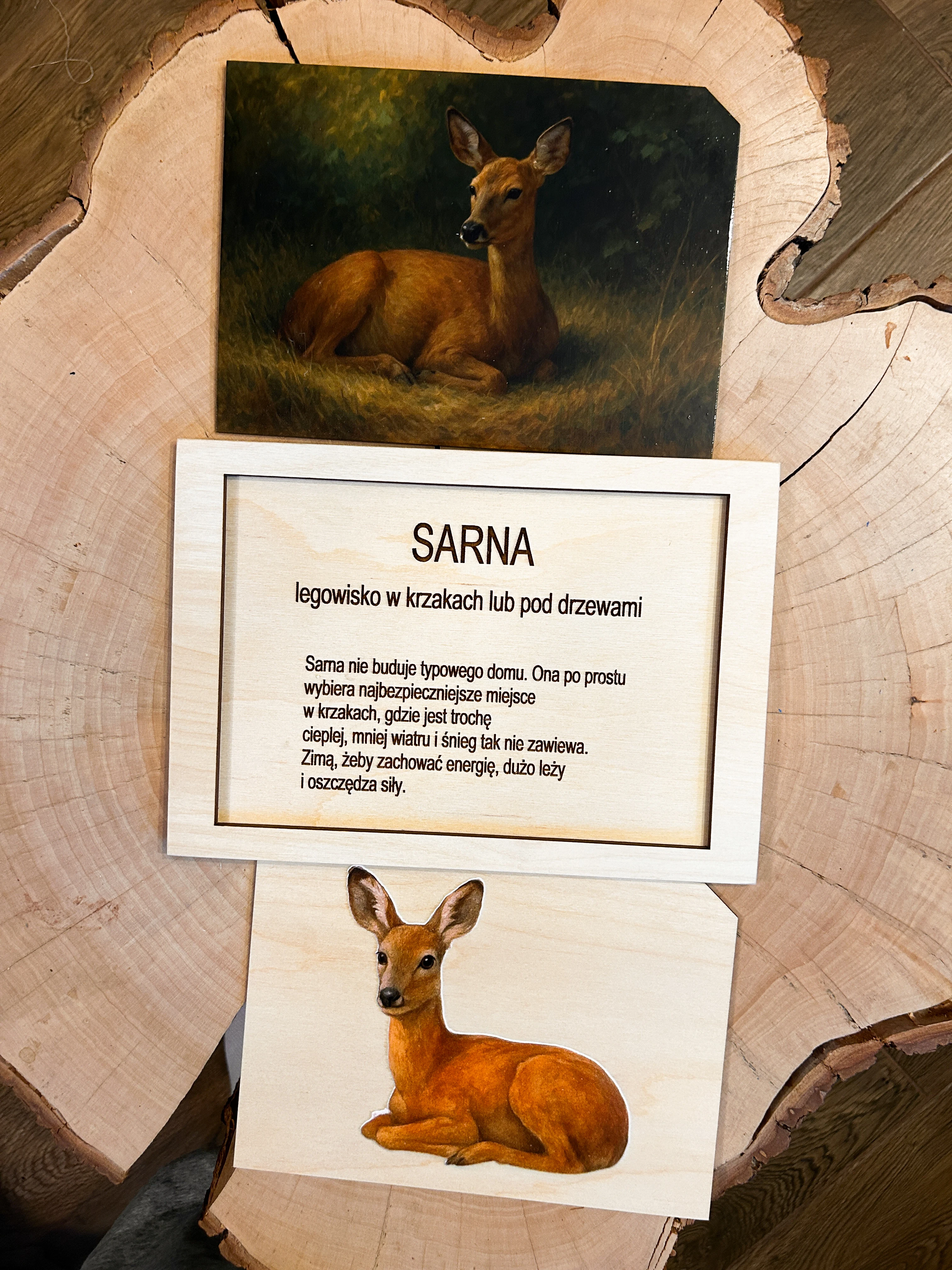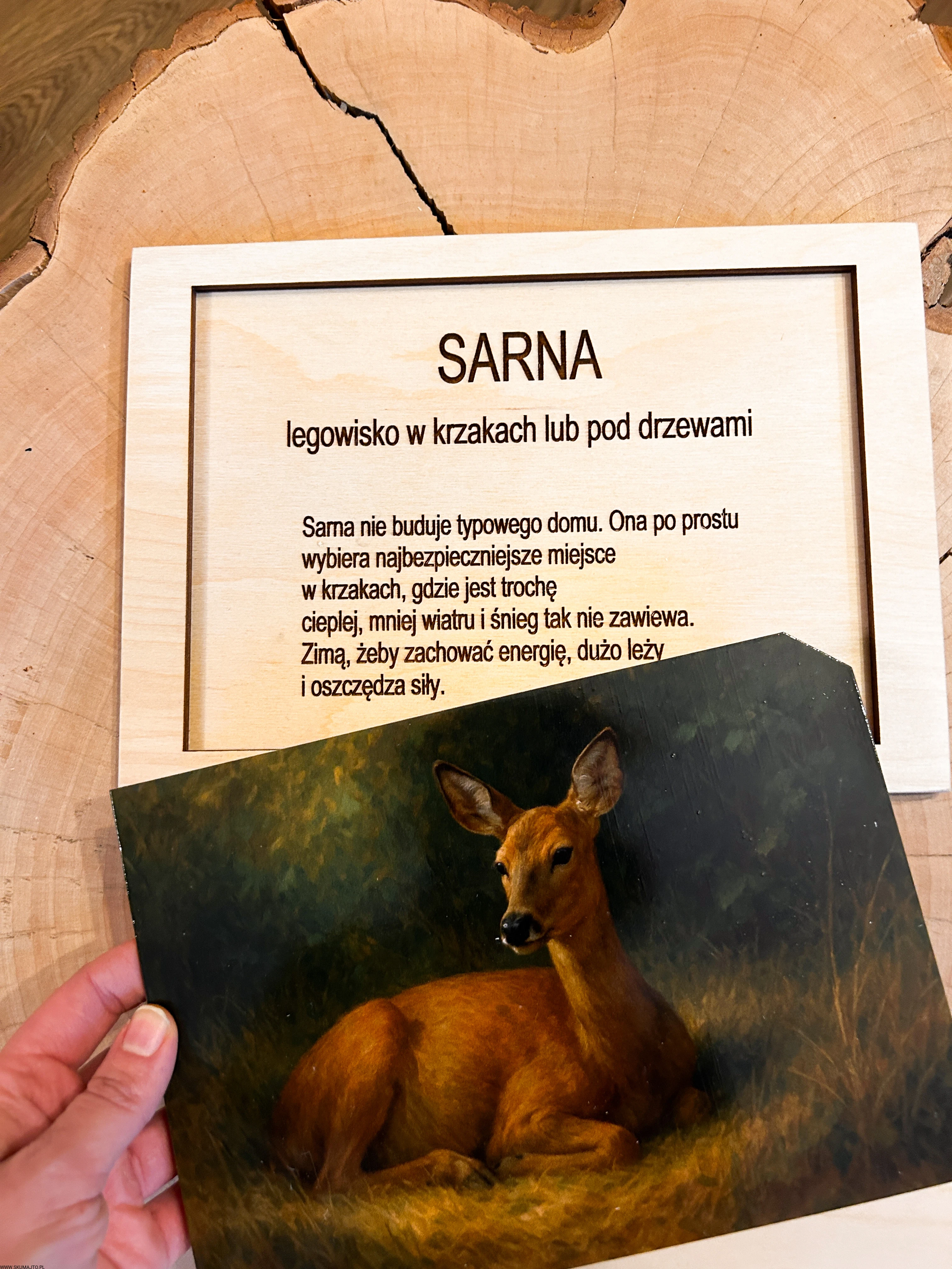 Środkowa warstwa: plansza z opisem miejsca snu i zachowań sarny