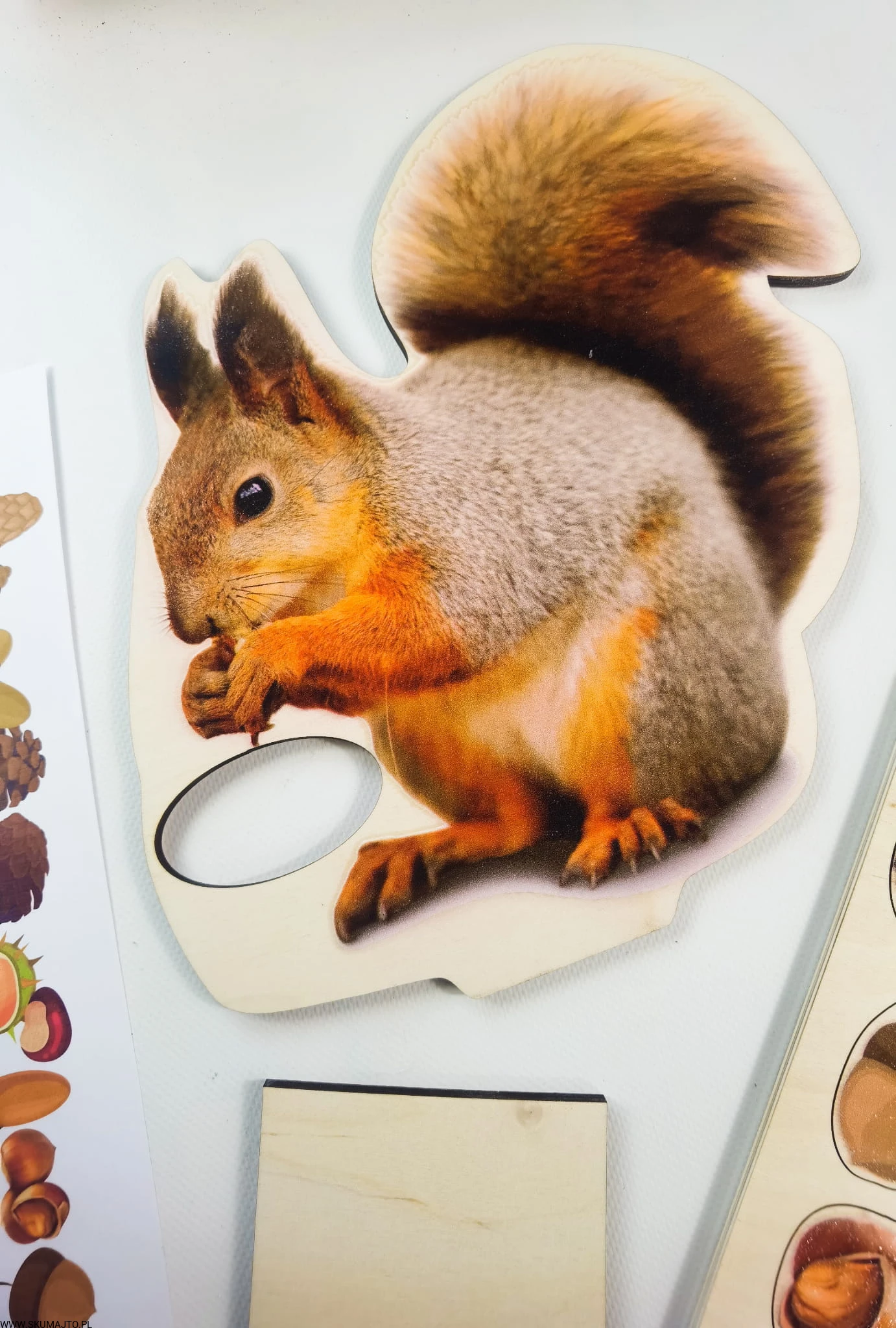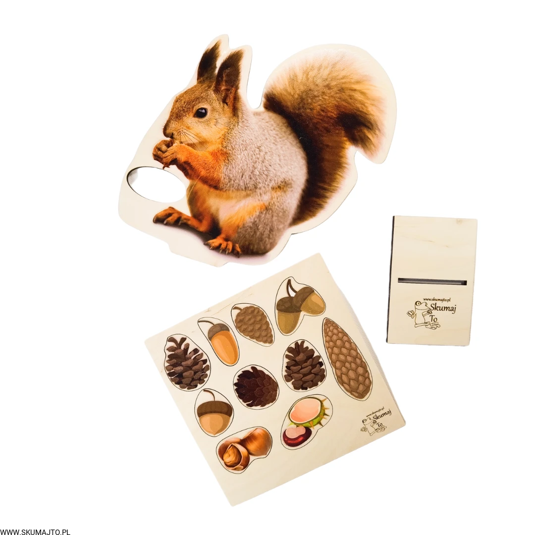 Głodna wiewiórka, drewniana układanka, karmienie wiewiórki, odwzorowywanie