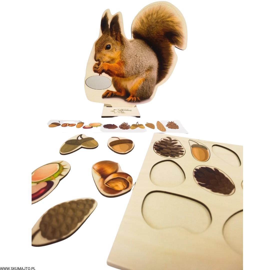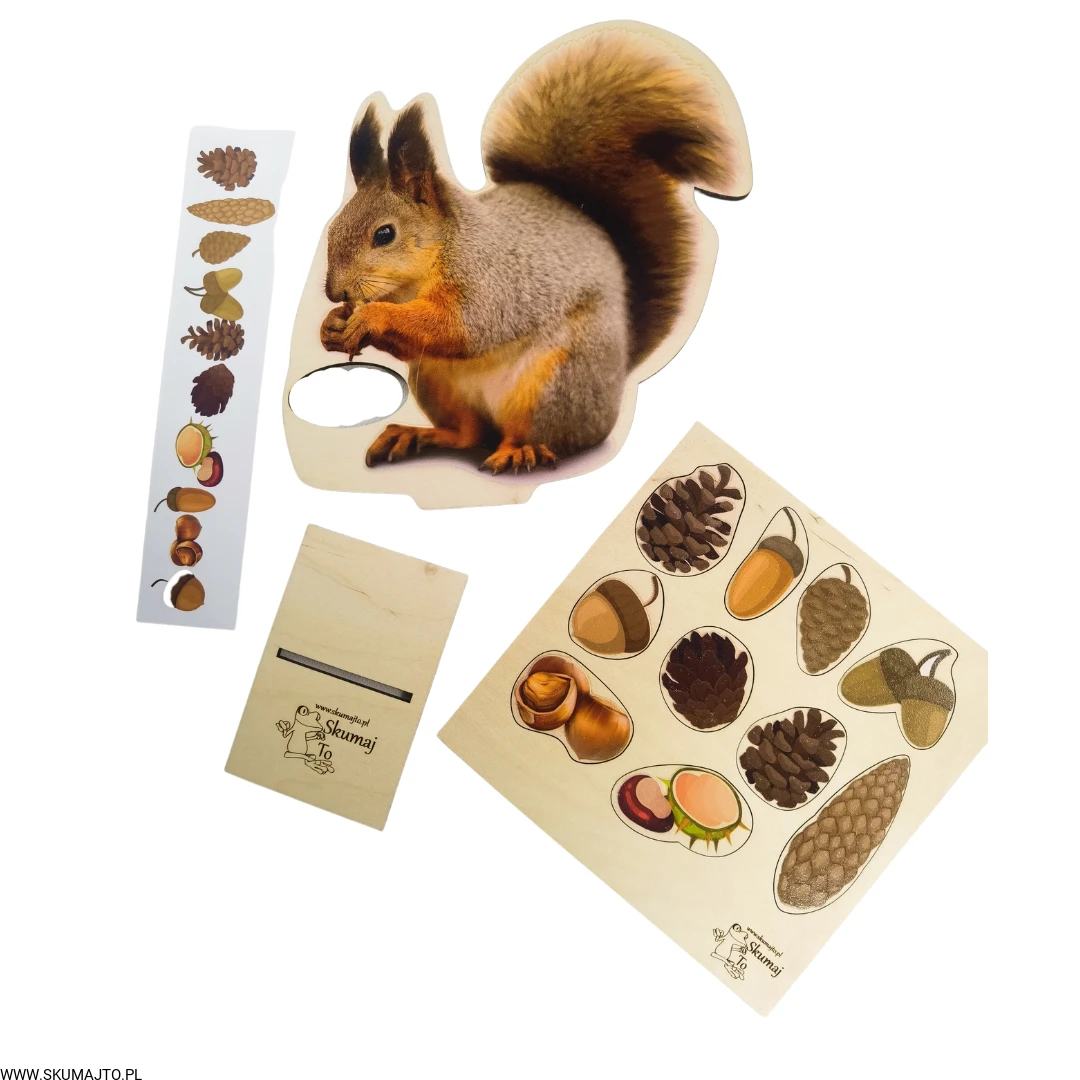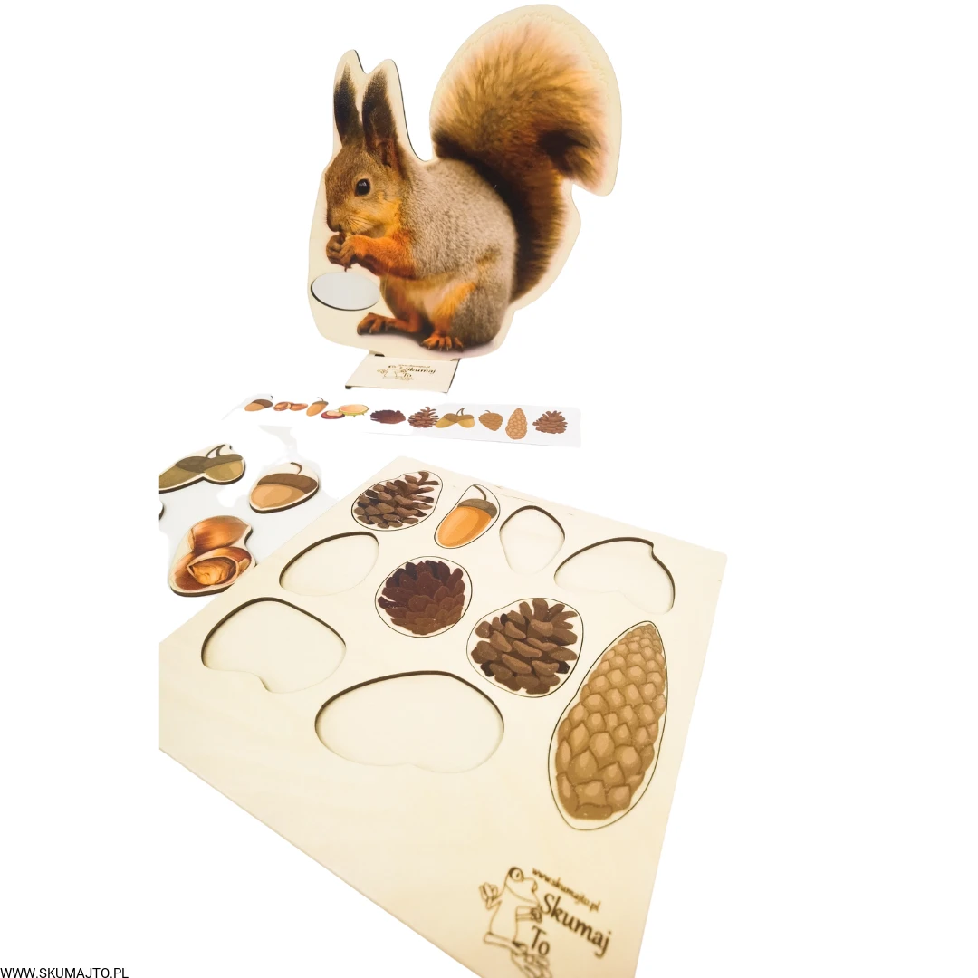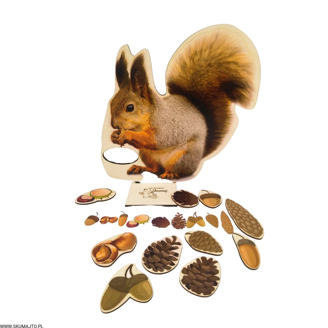 Zapytane o zwierzę, które najbardziej kojarzy się z jesienią, dzieci od razu wskazały wiewiórkę! Nic dziwnego, wiewiórki robią pokaźne zapasy na zimę, zbierając orzechy, szyszki, żołędzie i kasztany. Nasza układanka "Wiewiórka i jej Smakołyki" wspaniale oddaje ten jesienny klimat i zapewnia dzieciom edukacyjną zabawę.