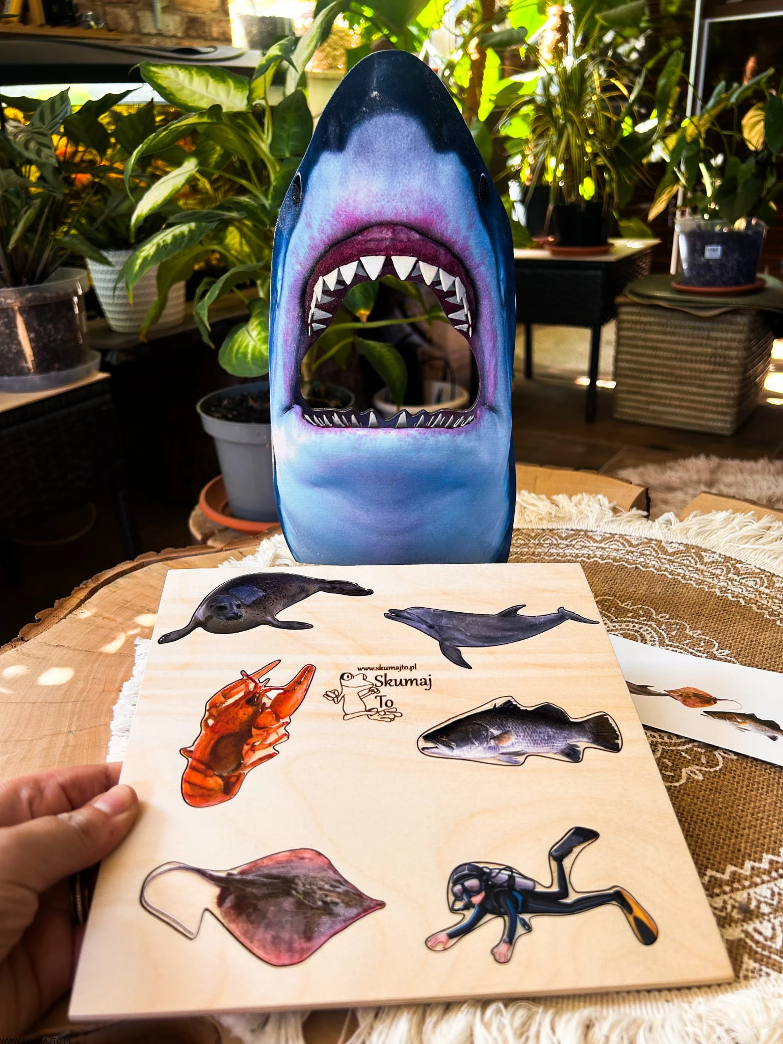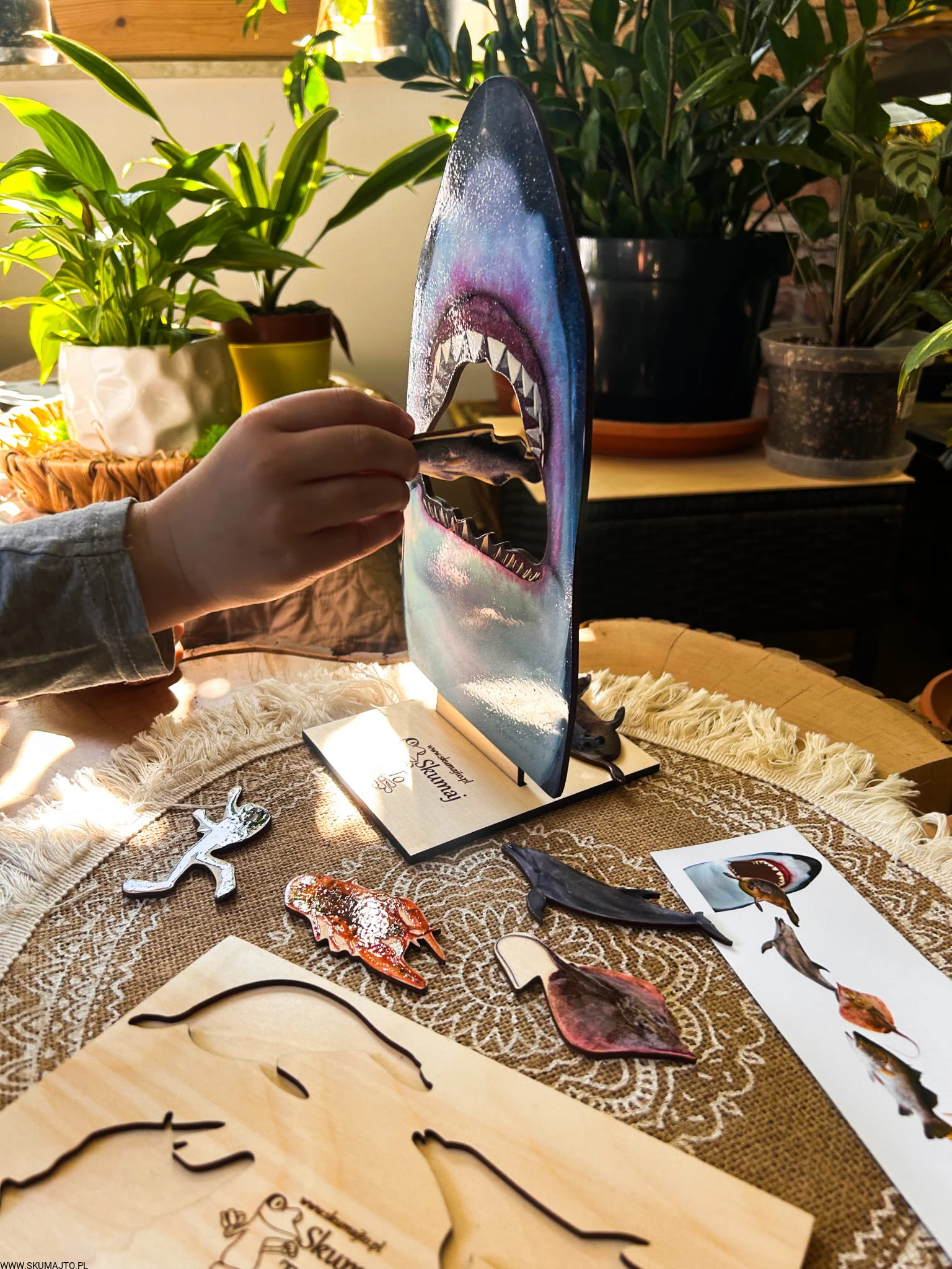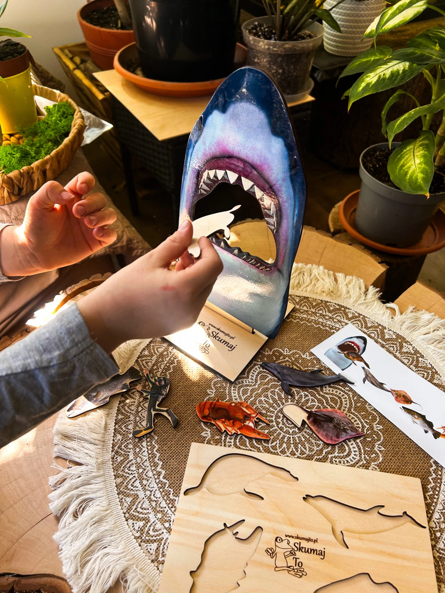 Głodny rekin, drewniana układanka do odwzorowywania, układanka montessori