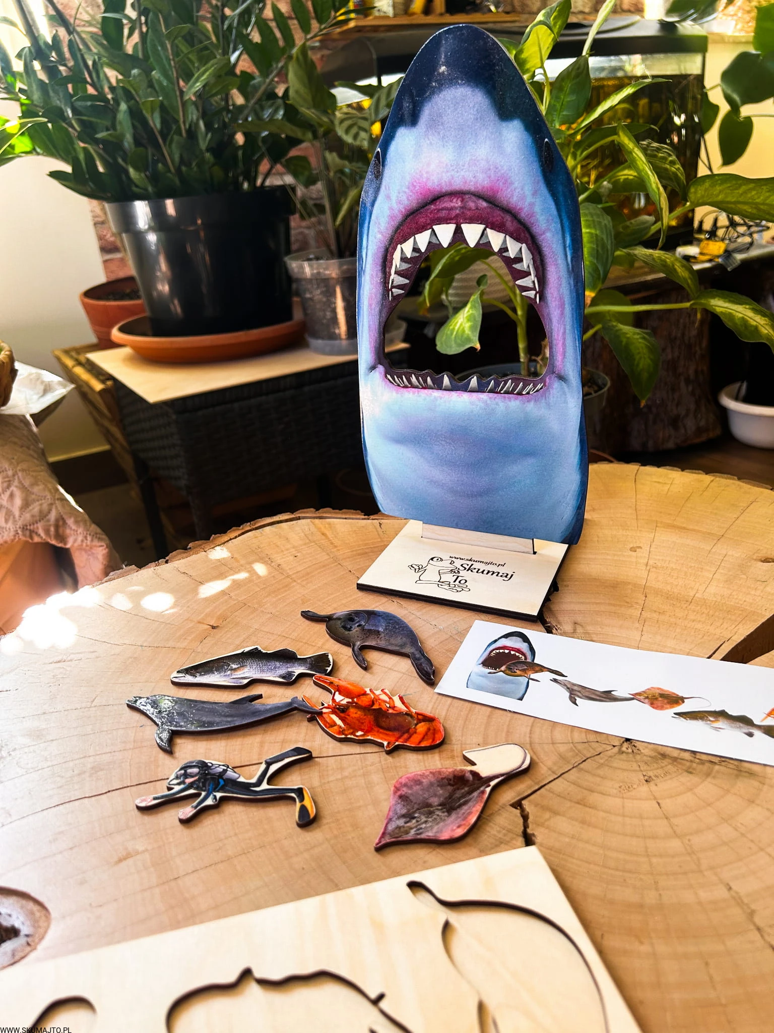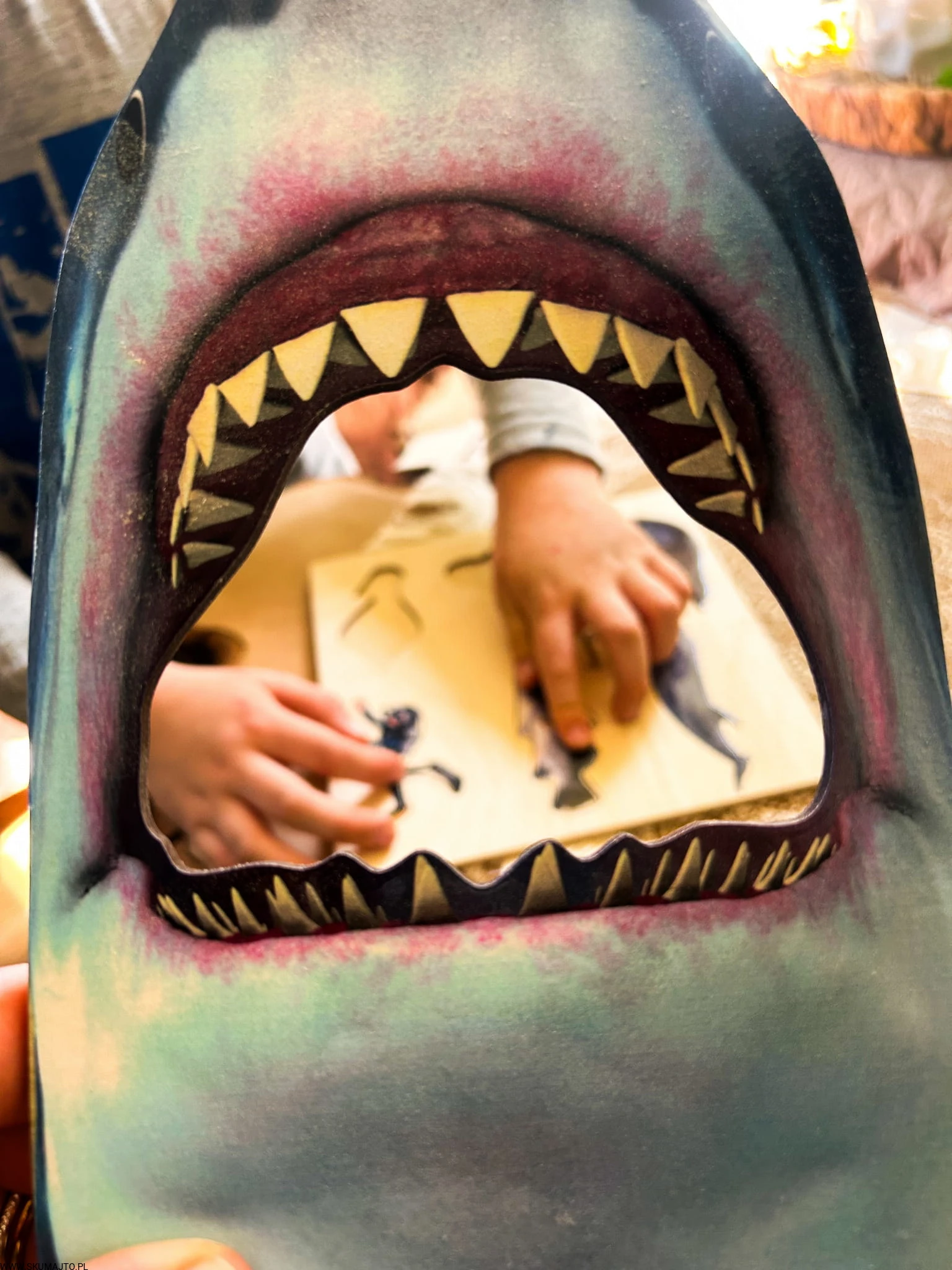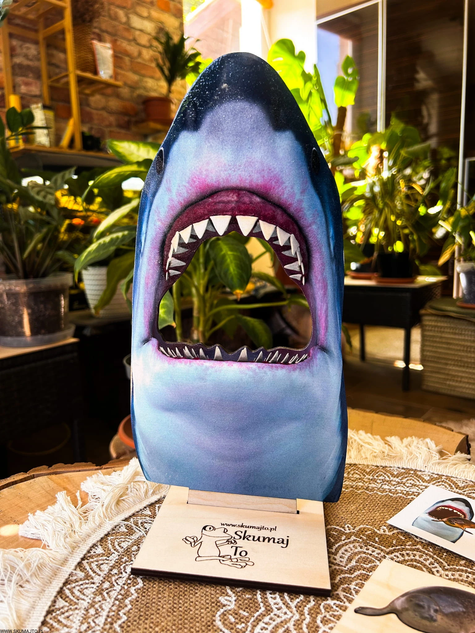 - Głównym elementem układanki jest realistyczna głowa rekina z wielkimi zębami i otworem do karmienia.