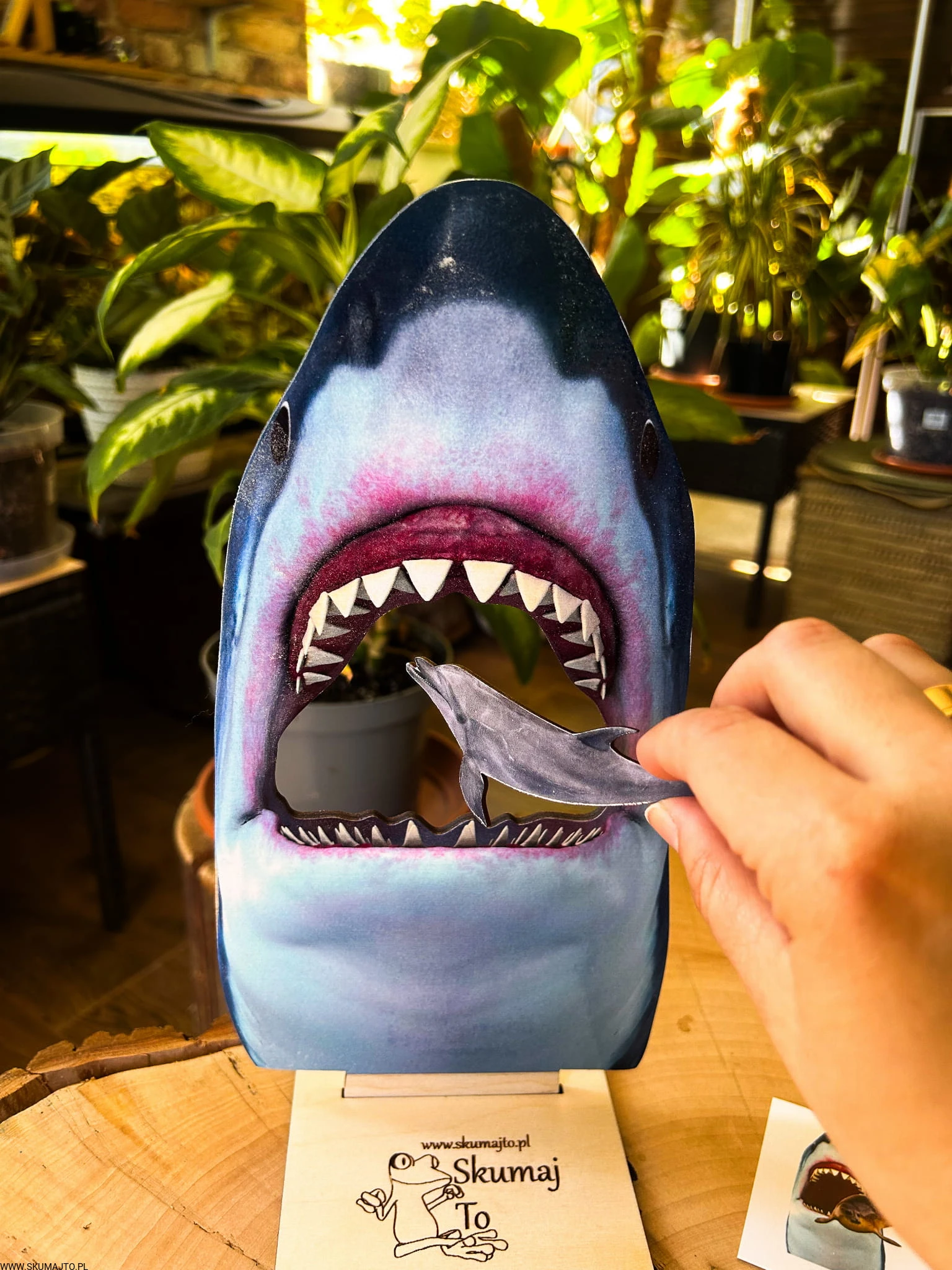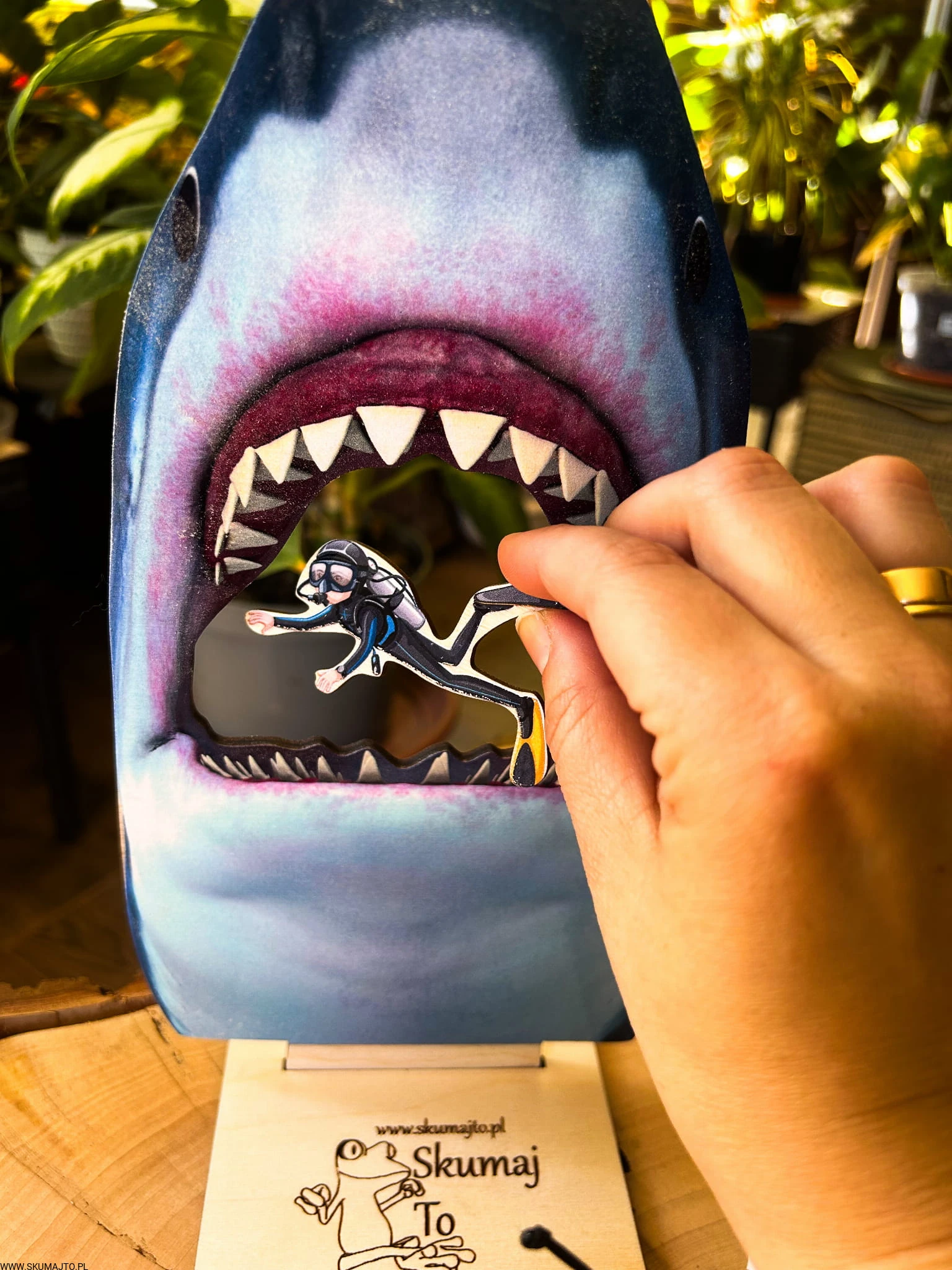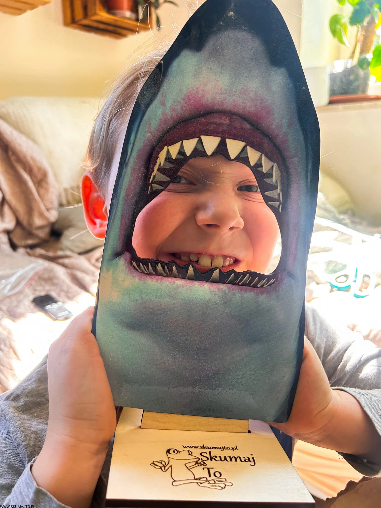 - Głównym elementem układanki jest realistyczna głowa rekina z wielkimi zębami i otworem do karmienia.