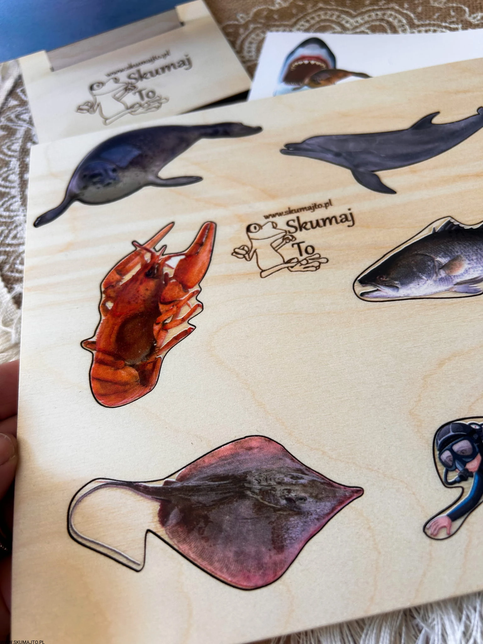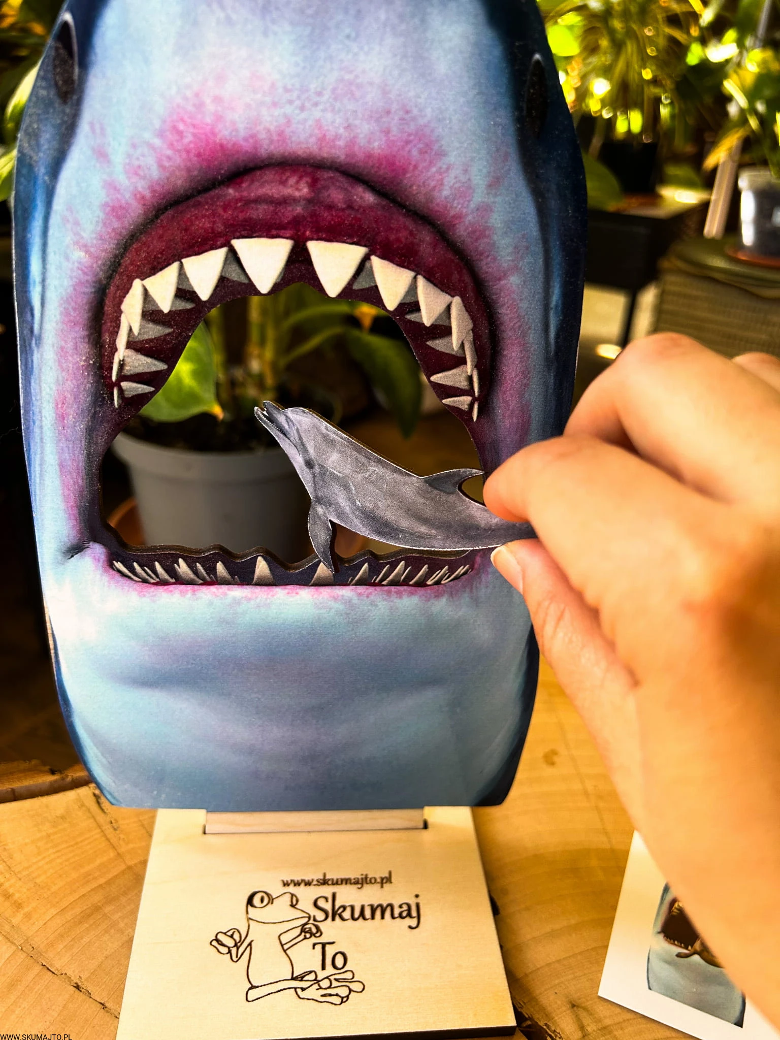 - Do zestawu dołączone są karty z określoną kolejnością, według której rekin ma zjadać morskie zwierzęta.
