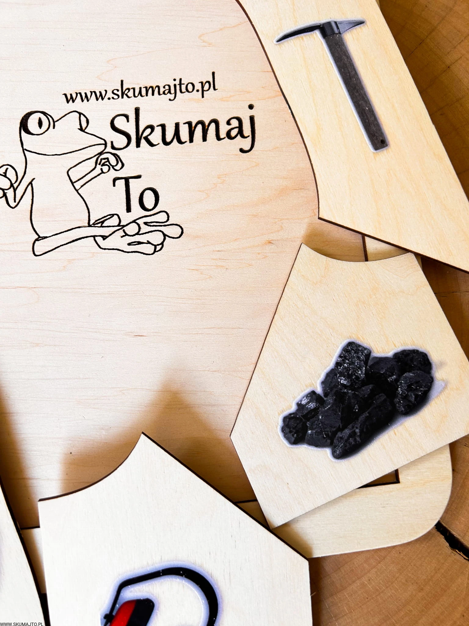 Ruchome elementy przedstawiają: kask z latarką, buty robocze, kilof, łopatę, kawałki węgla oraz ochronniki słuchu – wszystko, co dziecko powinno skojarzyć z zawodem górnika.