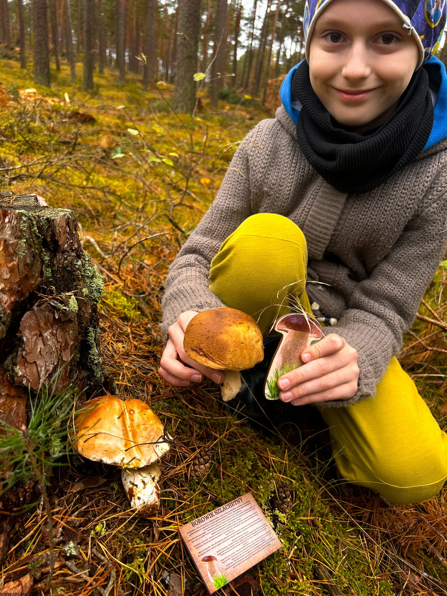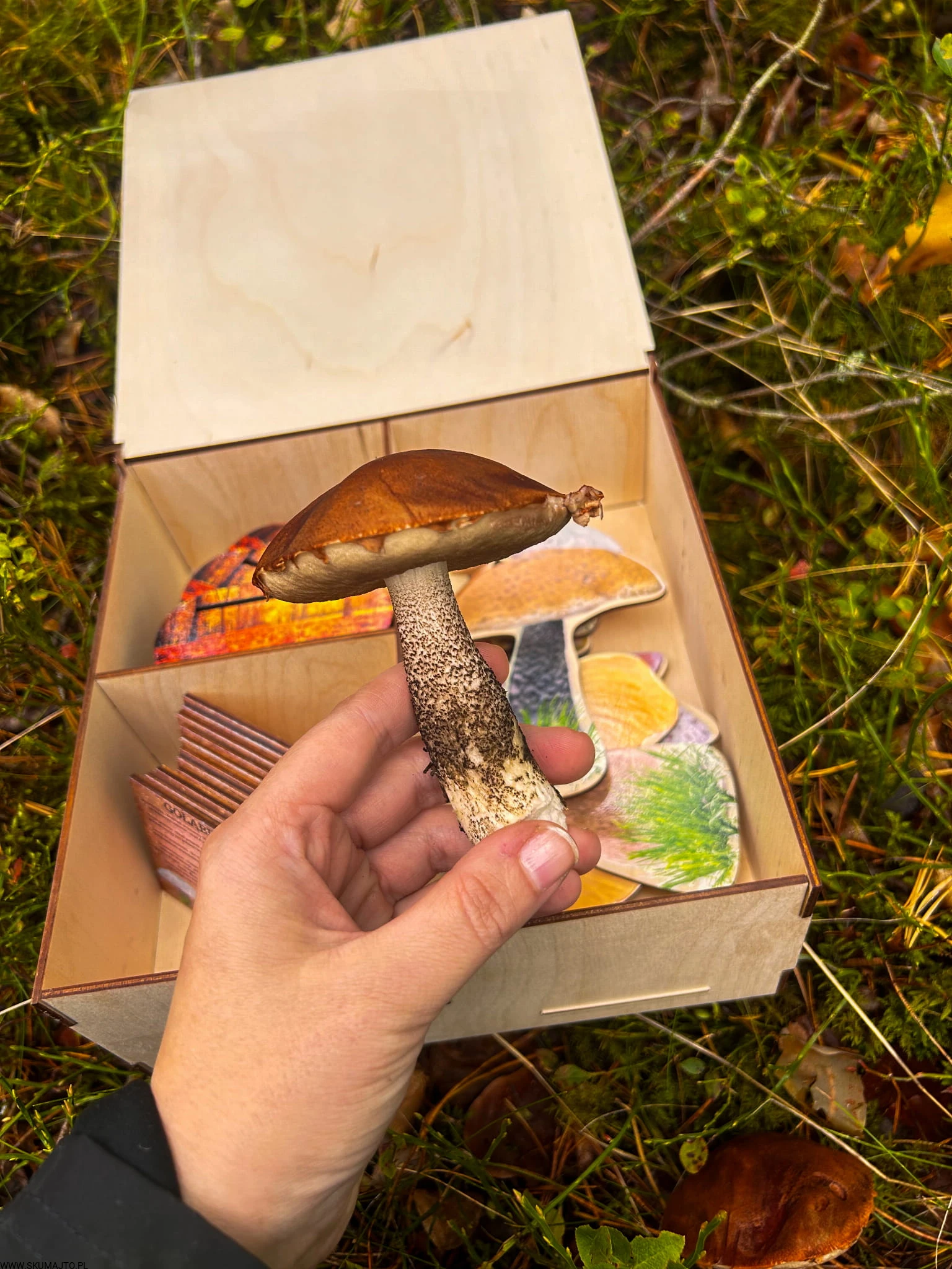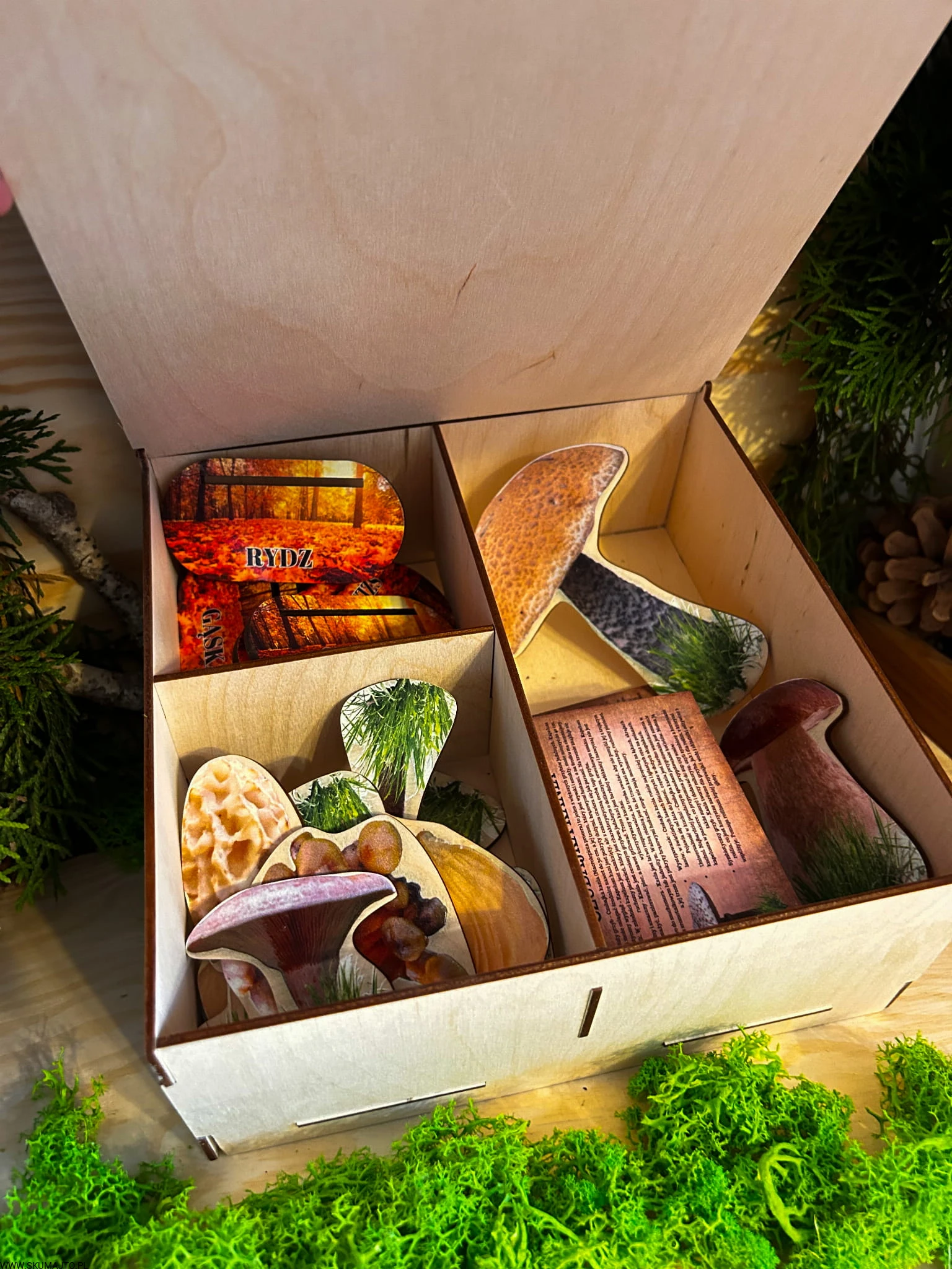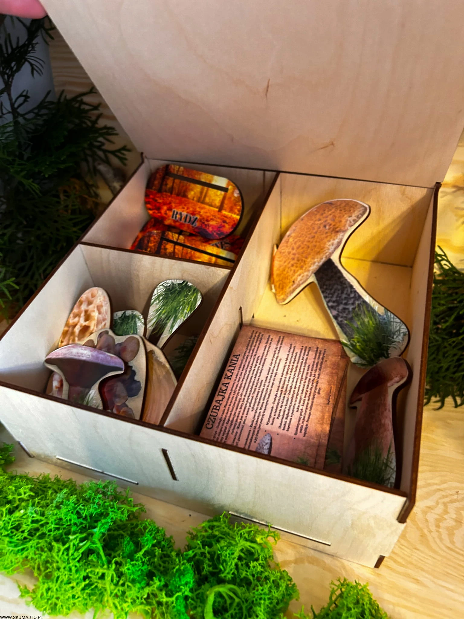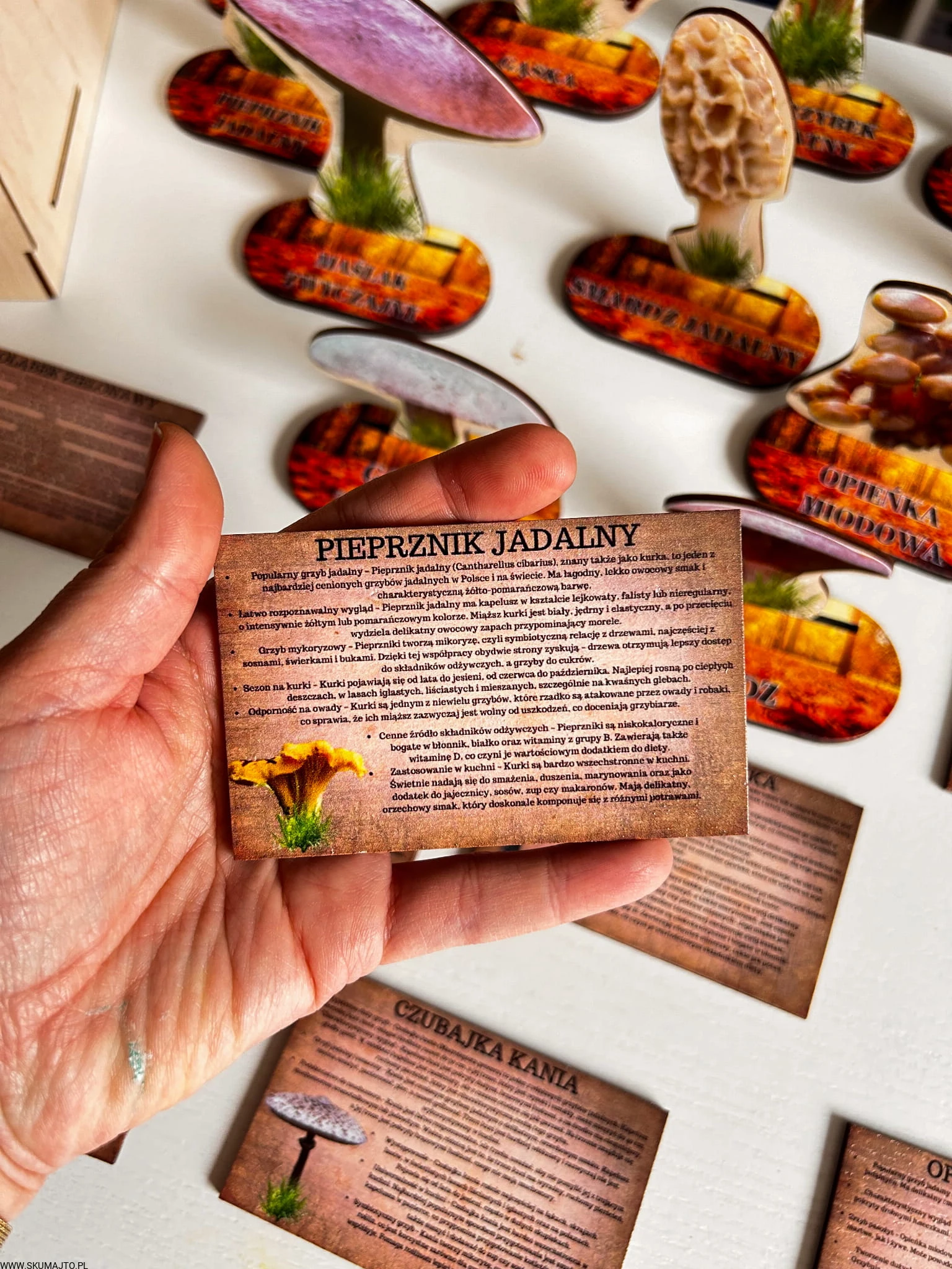To jednak dopiero początek wspólnej przygody. W zestawie znajdziecie 11 drewnianych kart (o wymiarach 10x6 cm), które przeniosą Was głębiej w świat grzybów. Na każdej z kart znajdują się nie tylko opisy danego gatunku, ale również fascynujące ciekawostki. Dlaczego borowik szlachetny jest królem grzybów? Jakie zastosowania kulinarne ma rydz? Czy opieńka miodowa naprawdę rośnie w tak dużych grupach, jak mówią? To historie, które otwierają przed dzieckiem zupełnie nowy świat – pełen przyrody, zapachów i odkrywania tego, co można znaleźć pod nogami podczas zwykłego spaceru.