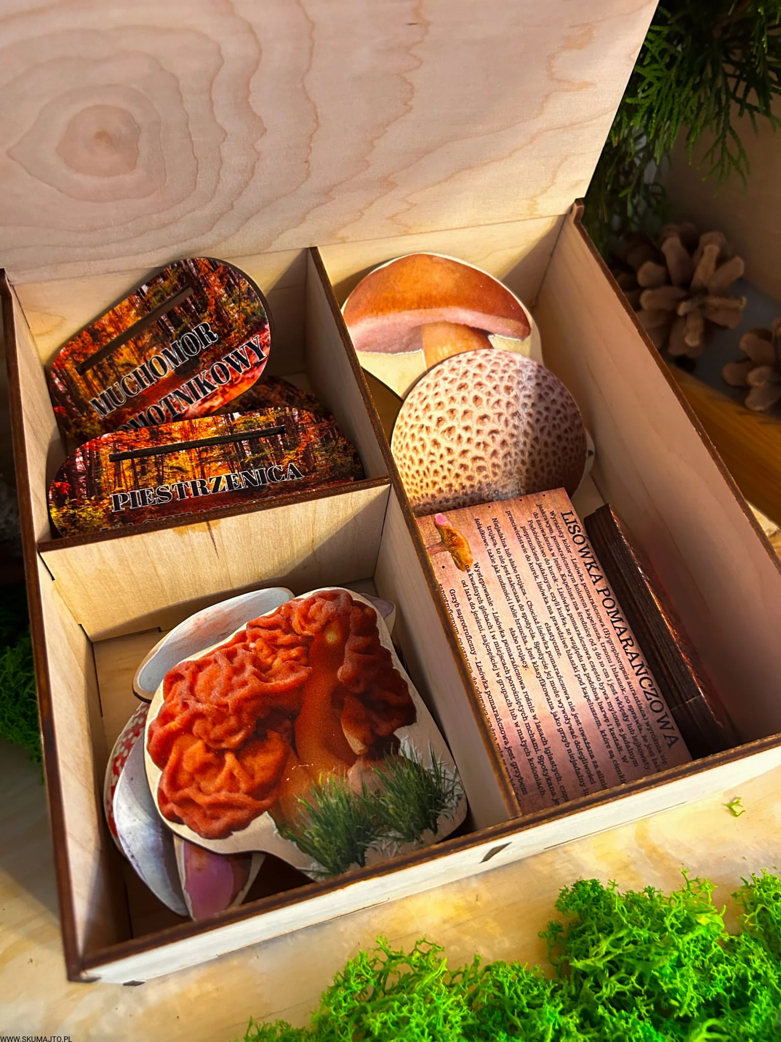 Wyobraź sobie, jak razem z dzieckiem siedzicie przy stole, a przed Wami rozpościera się mały, magiczny las pełen tajemnic. W Waszych rękach lśnią realistyczne, trójwymiarowe modele grzybów – jedne dobrze znane, inne owiane groźnymi legendami. Każdy grzyb opowiada swoją własną, niepowtarzalną historię. Dzięki załączonym drewnianym kartom (10x6 cm) opisującym ich cechy, dowiadujecie się, dlaczego muchomor jest taki piękny, a jednocześnie tak niebezpieczny. Co więcej, na kartach czekają ciekawostki, które niejednokrotnie Was zaskoczą!