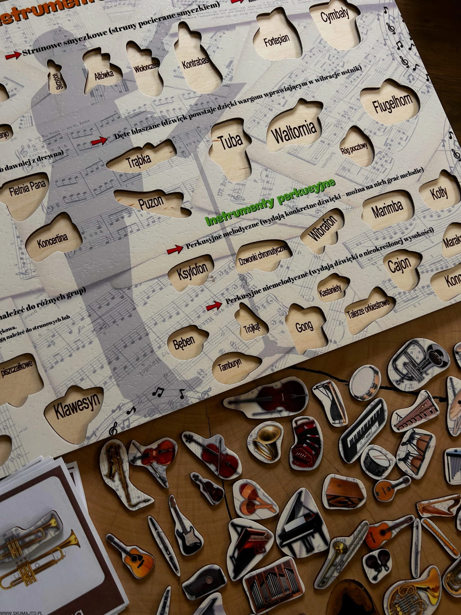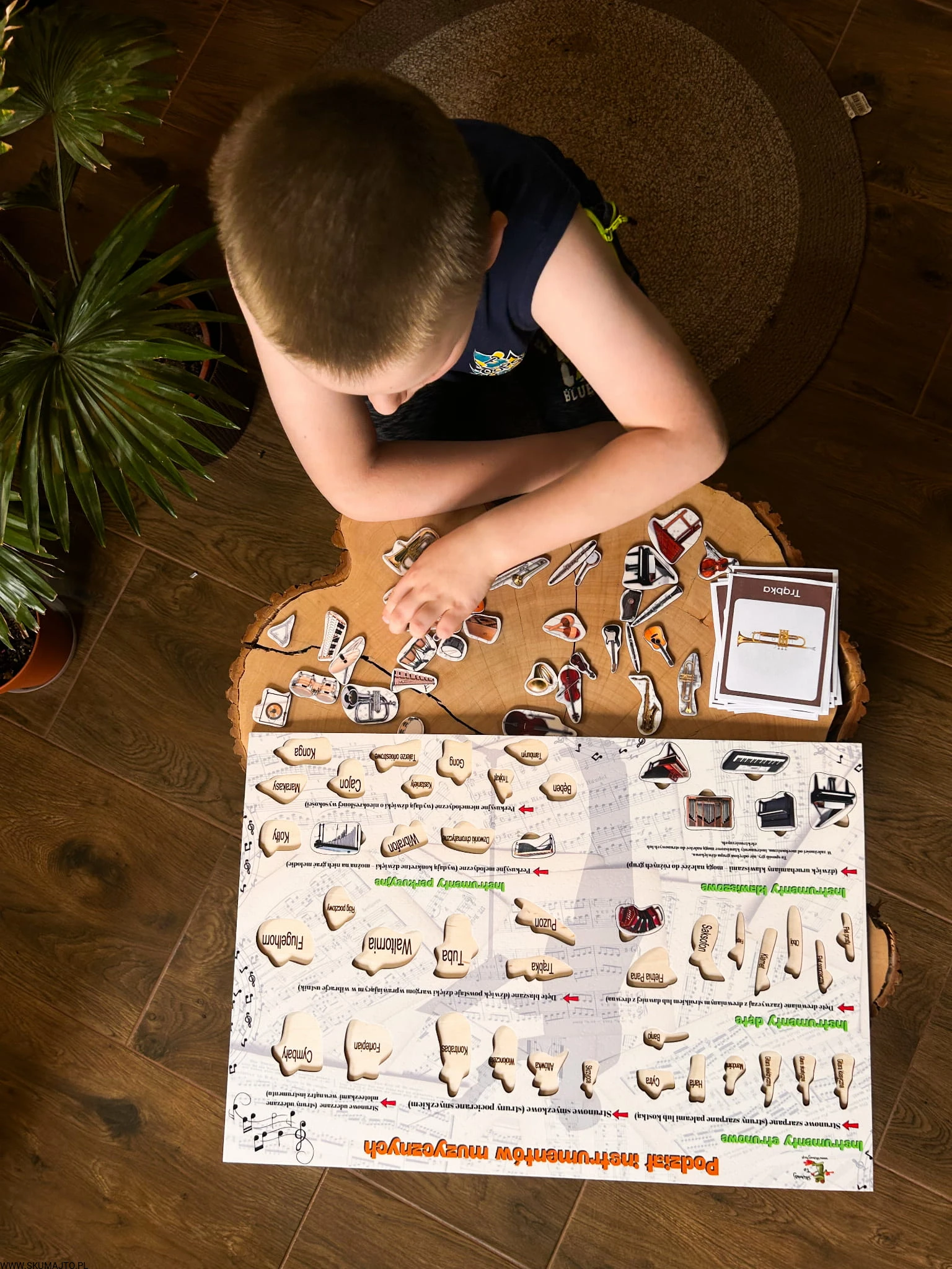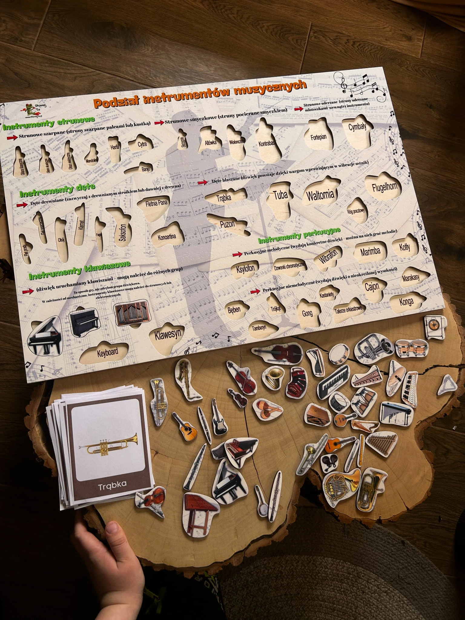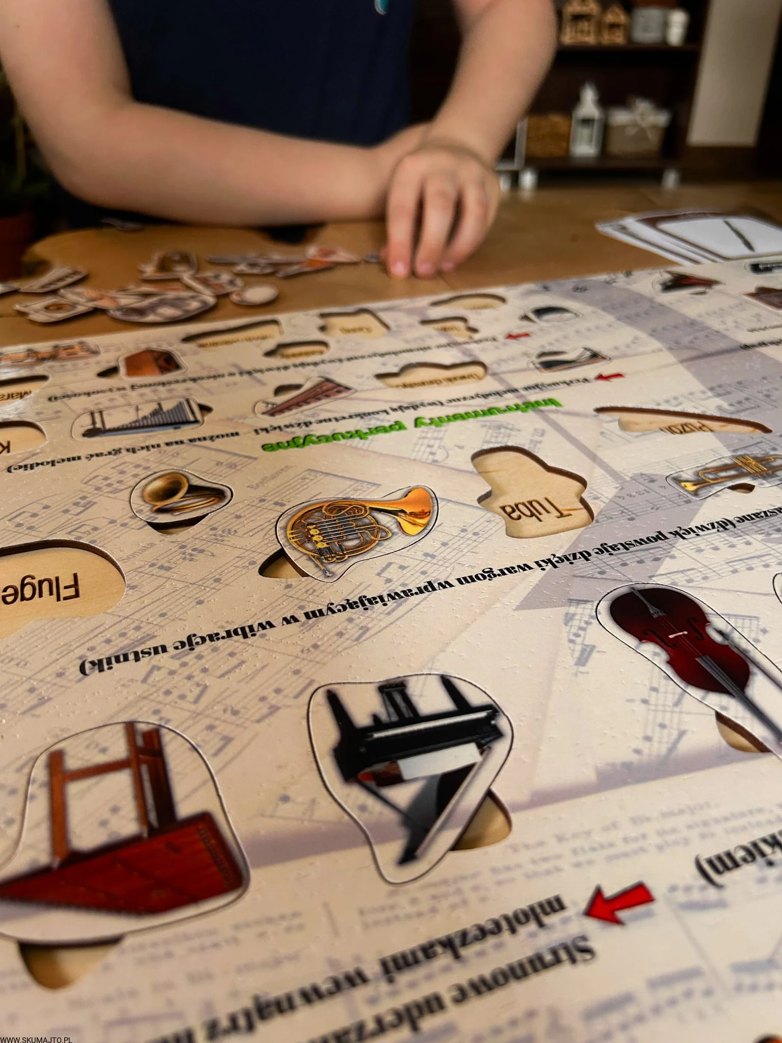 To duża, drewniana układanka edukacyjna (aż 50 x 40 cm), która pokazuje podział instrumentów na grupy: strunowe, dęte, perkusyjne i klawiszowe – zgodnie z klasyfikacją stosowaną w szkołach muzycznych. Każdy element układanki to osobny instrument z realistyczną grafiką (taką, która oddaje jego prawdziwy wygląd), a pod każdym miejscem znajduje się wygrawerowana nazwa instrumentu – dzięki czemu dziecko szybko przyswaja nie tylko obraz, ale też słowo.