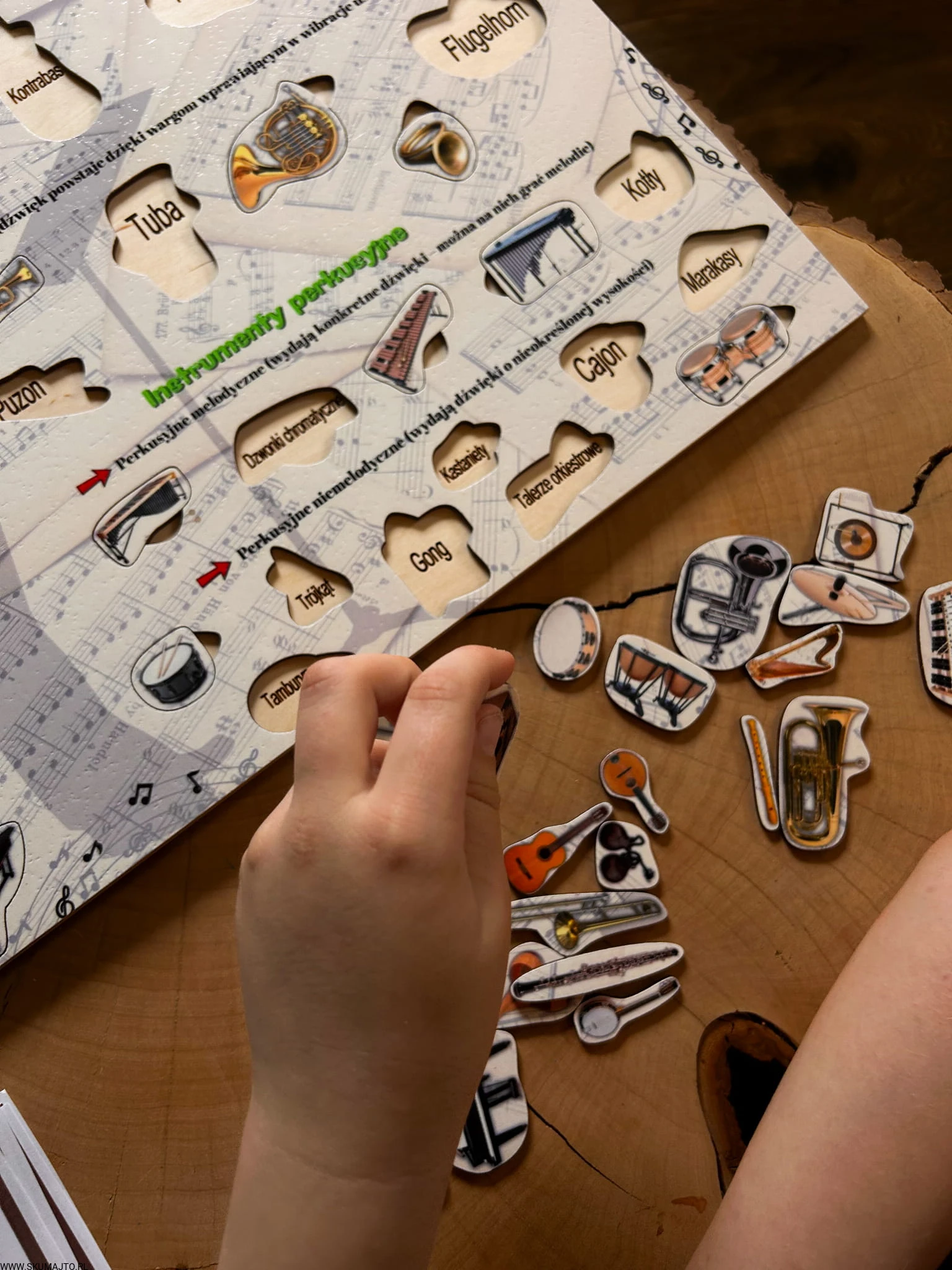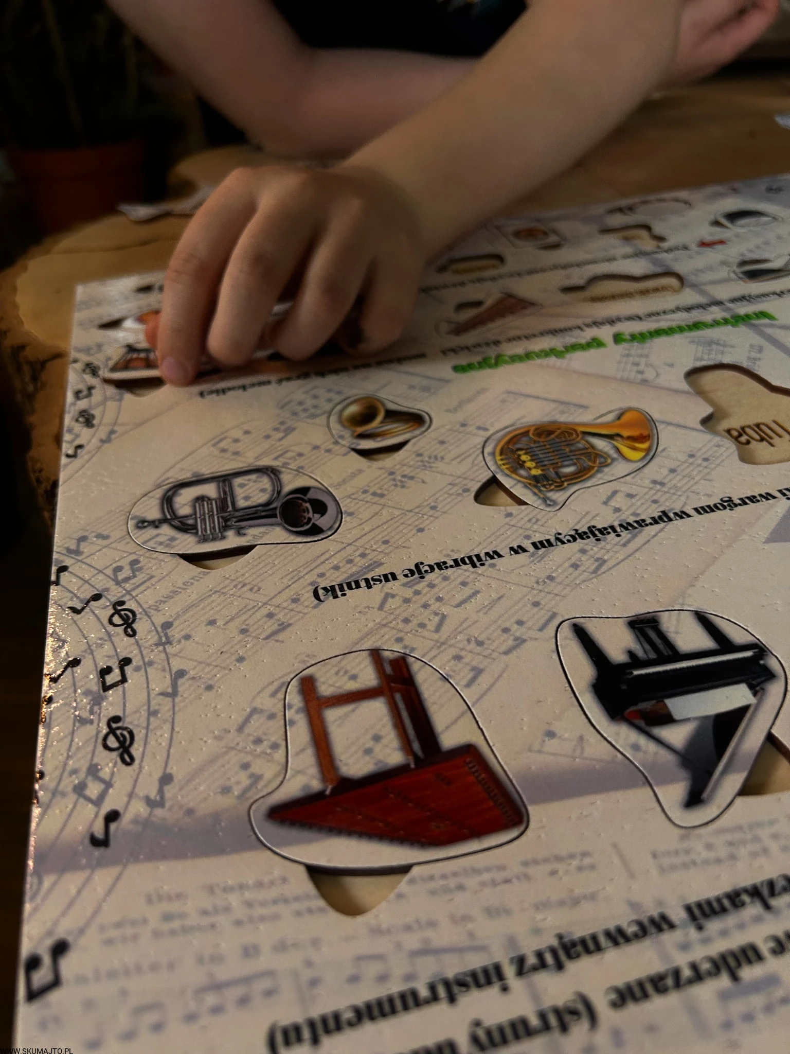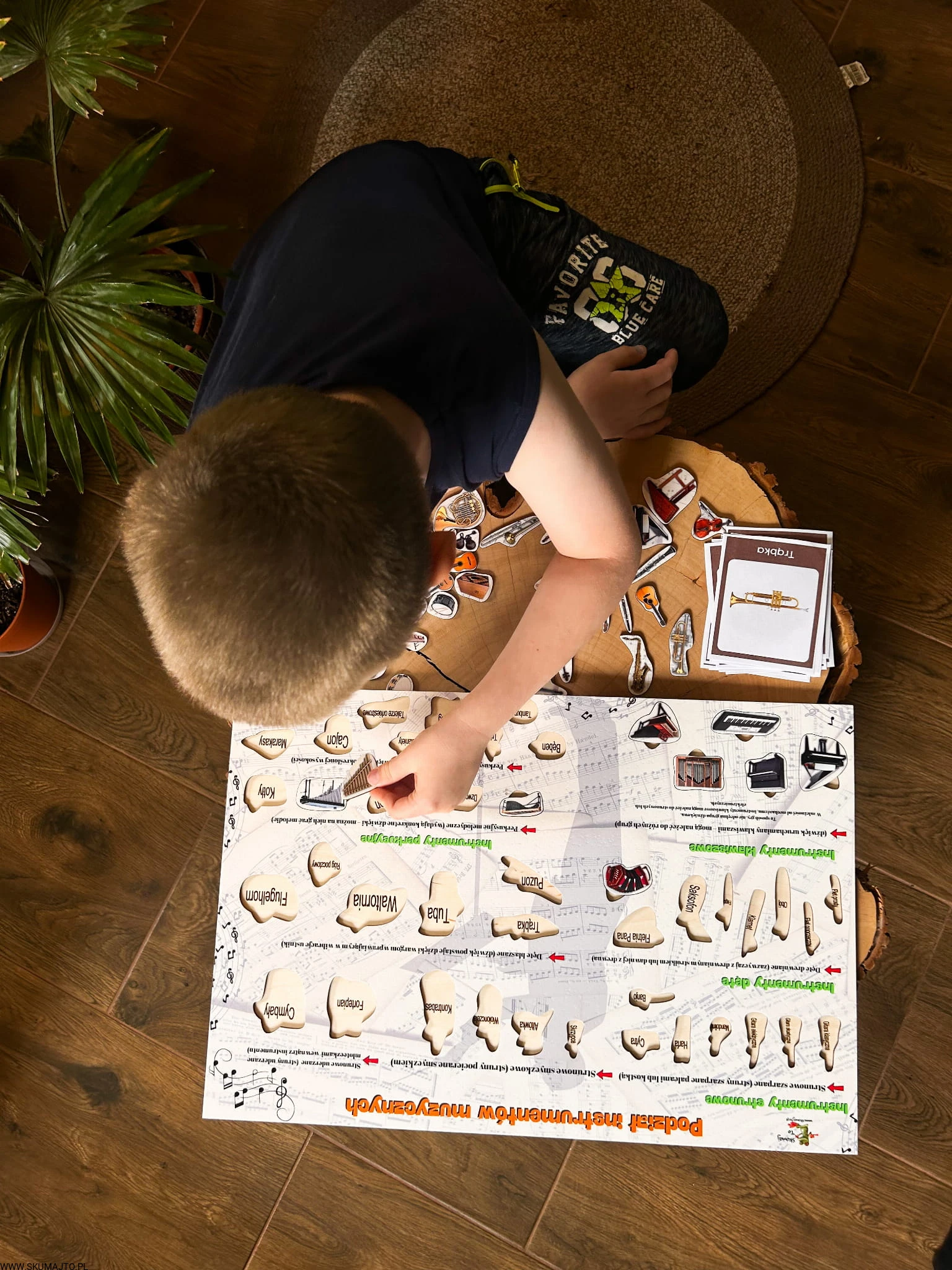 To duża, drewniana układanka edukacyjna (aż 50 x 40 cm), która pokazuje podział instrumentów na grupy: strunowe, dęte, perkusyjne i klawiszowe – zgodnie z klasyfikacją stosowaną w szkołach muzycznych. Każdy element układanki to osobny instrument z realistyczną grafiką (taką, która oddaje jego prawdziwy wygląd), a pod każdym miejscem znajduje się wygrawerowana nazwa instrumentu – dzięki czemu dziecko szybko przyswaja nie tylko obraz, ale też słowo.