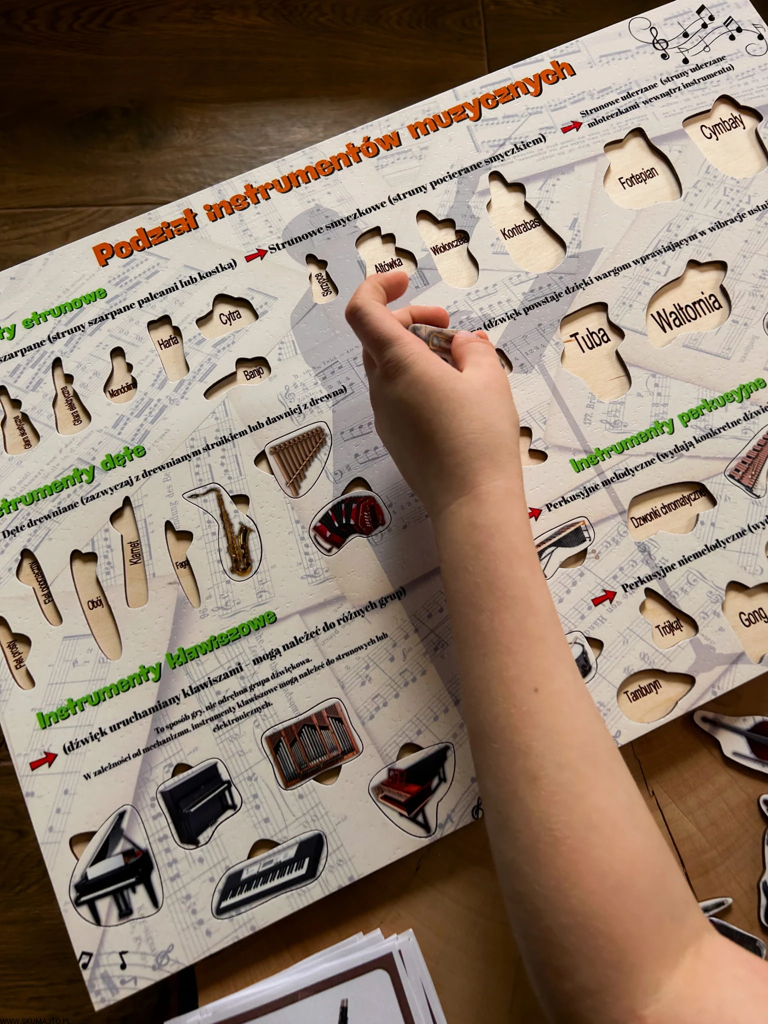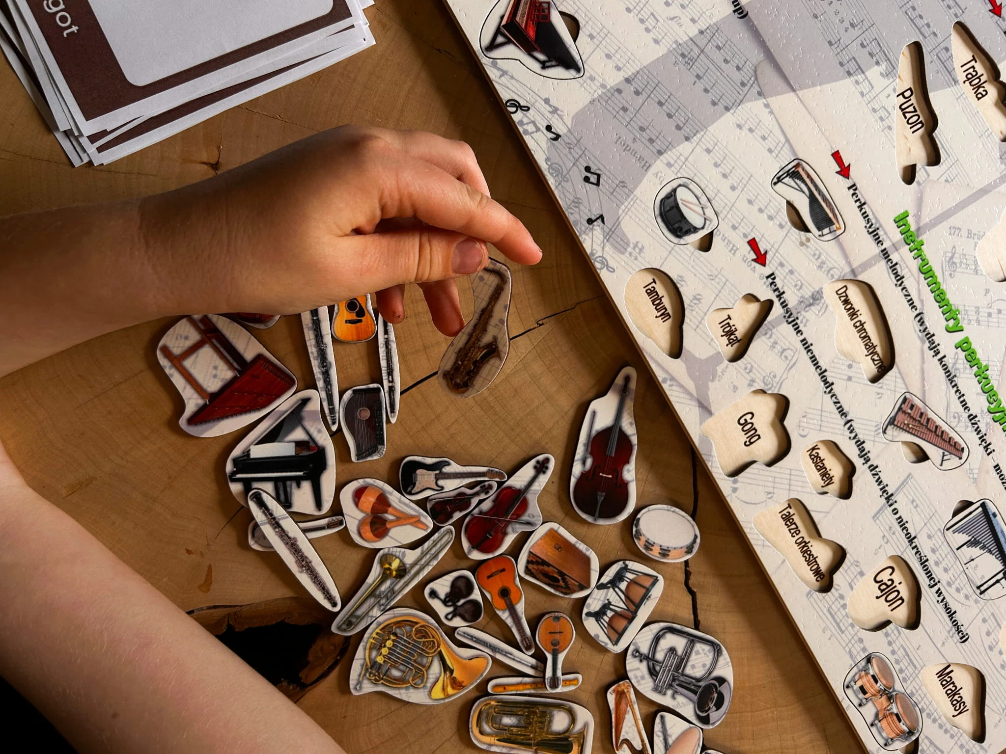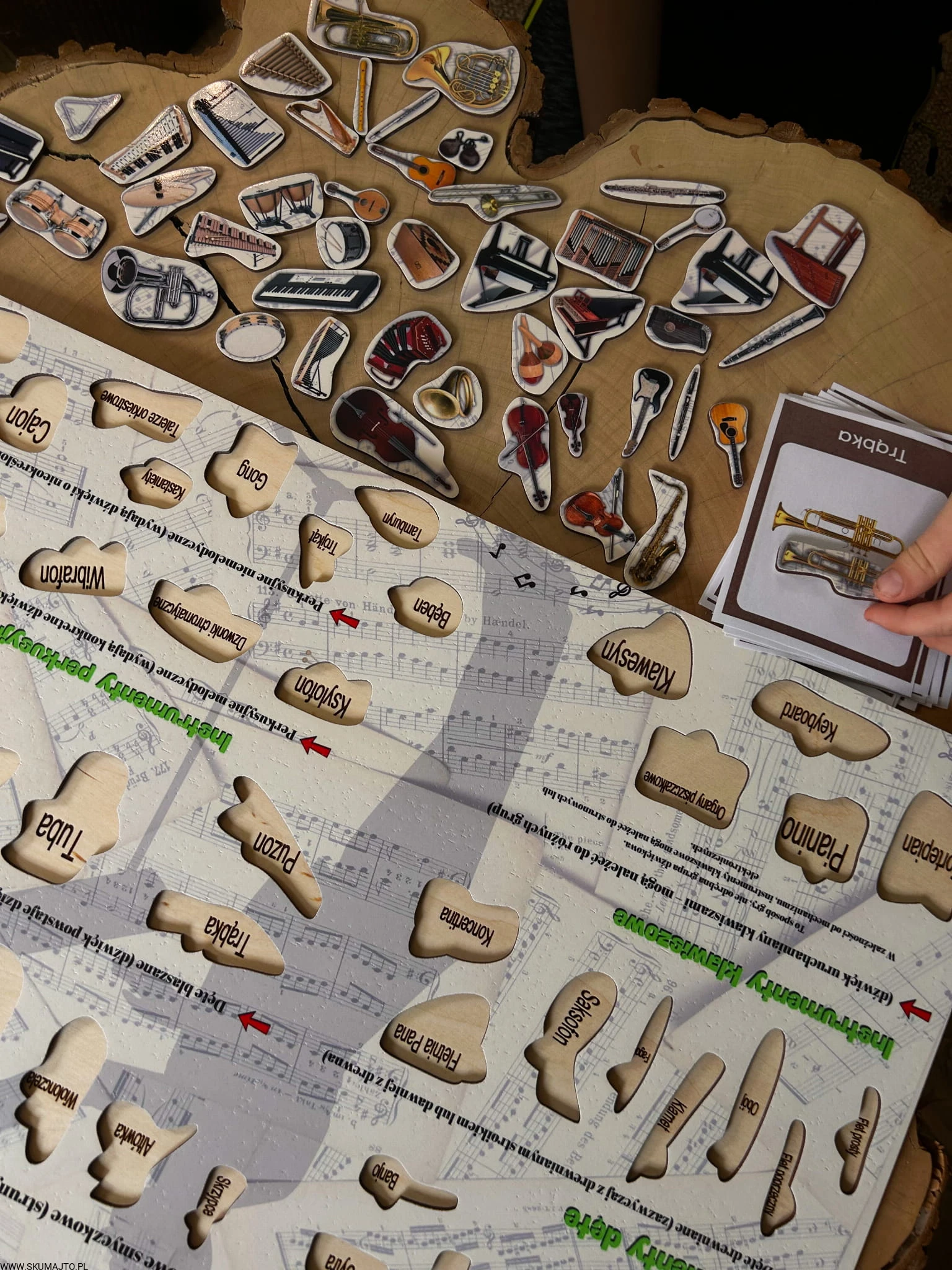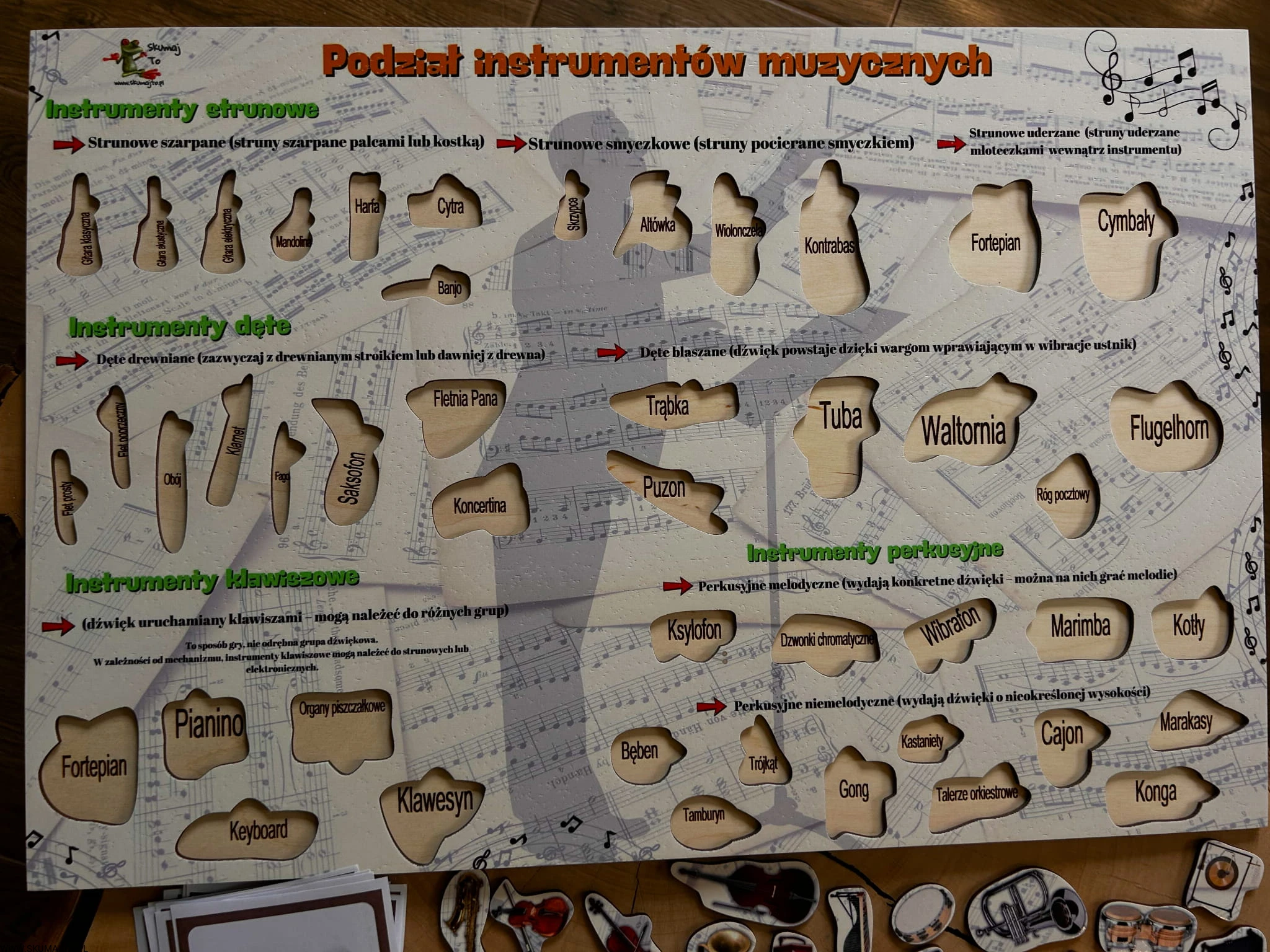 To duża, drewniana układanka edukacyjna (aż 50 x 40 cm), która pokazuje podział instrumentów na grupy: strunowe, dęte, perkusyjne i klawiszowe – zgodnie z klasyfikacją stosowaną w szkołach muzycznych. Każdy element układanki to osobny instrument z realistyczną grafiką (taką, która oddaje jego prawdziwy wygląd), a pod każdym miejscem znajduje się wygrawerowana nazwa instrumentu – dzięki czemu dziecko szybko przyswaja nie tylko obraz, ale też słowo.