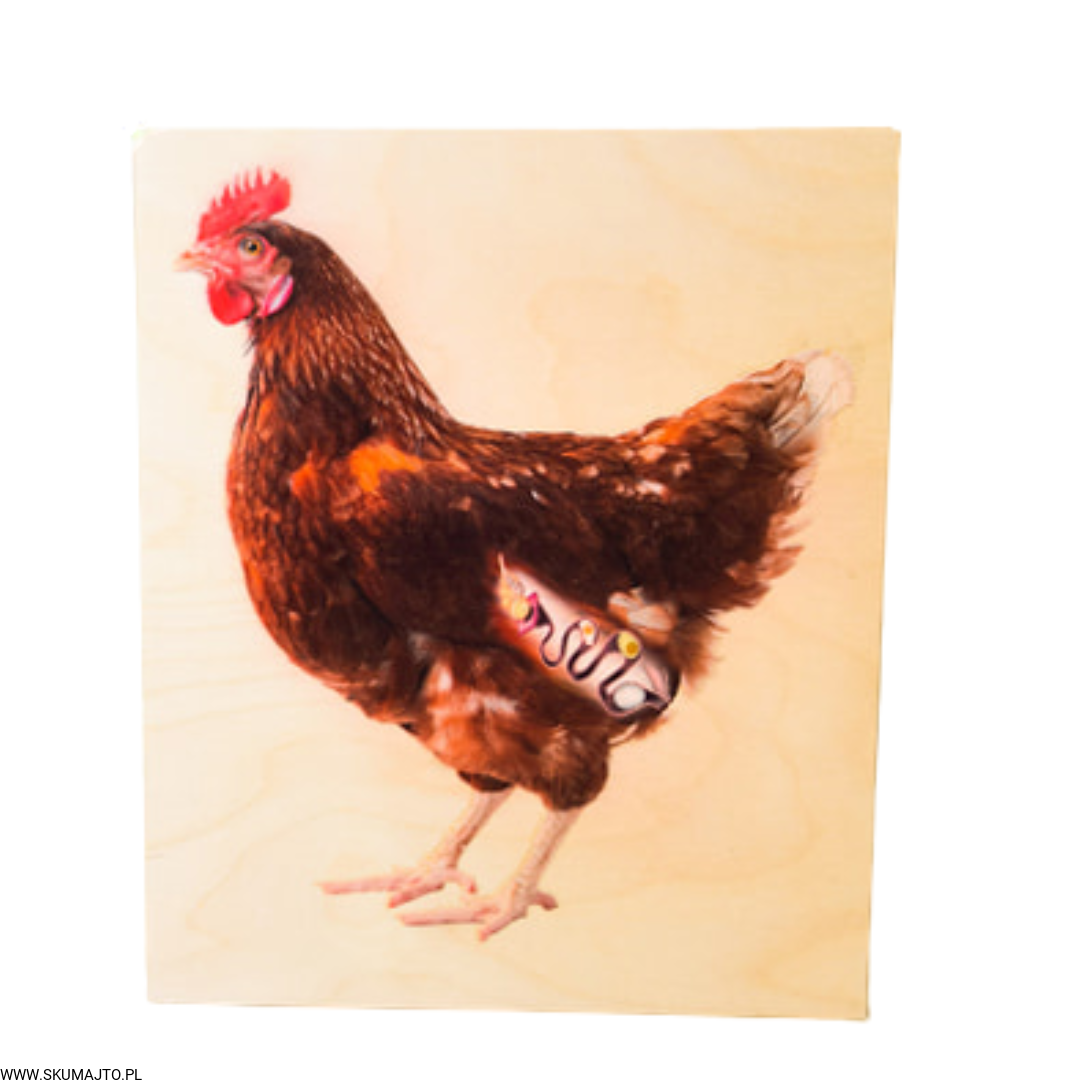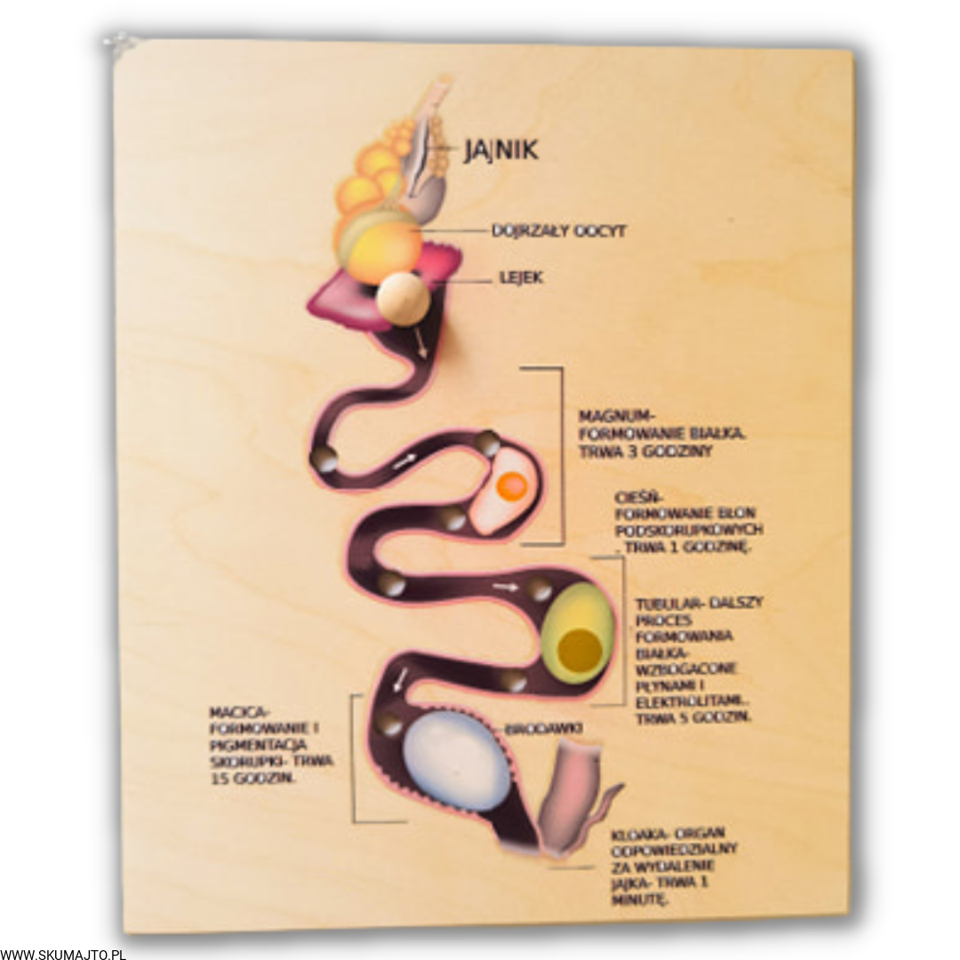 - Plansza 1: Wymiary 35x35 cm, przedstawia kurę wraz z całym cyklem rozwoju jajka wewnątrz jej ciała.