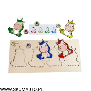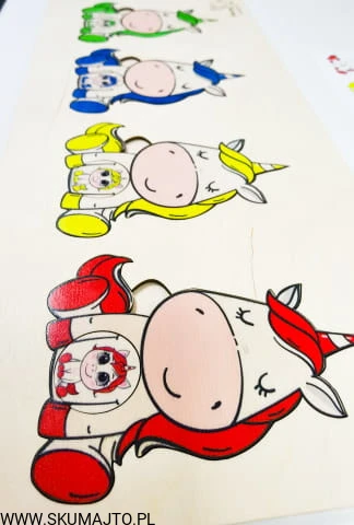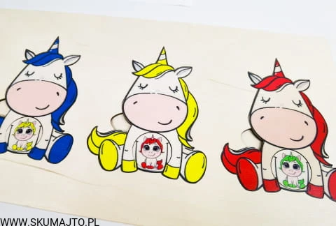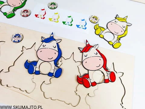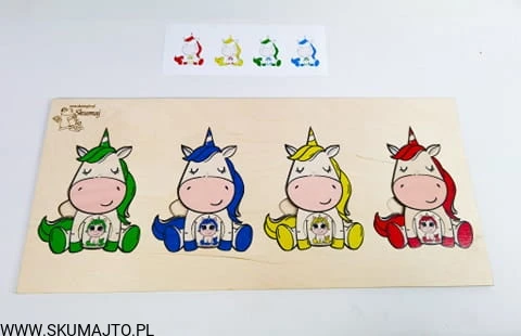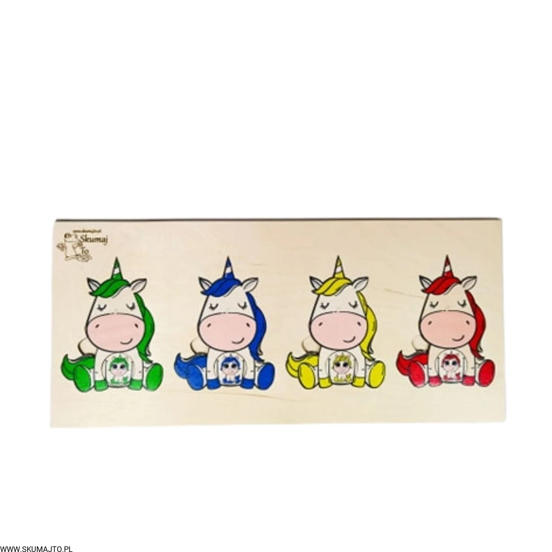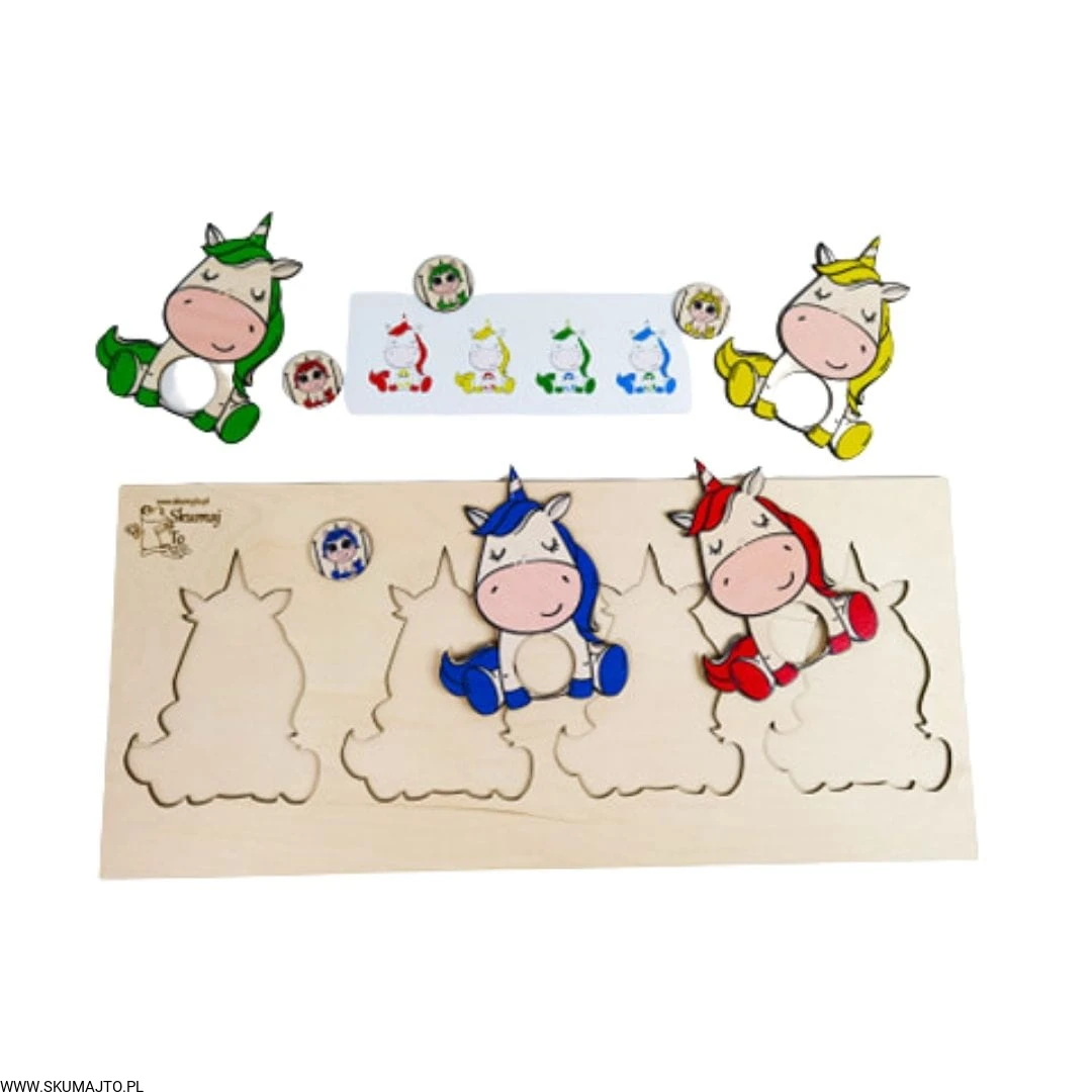 Jednorożce, drewniana układanka, nauka kolorów, odwzorowywanie