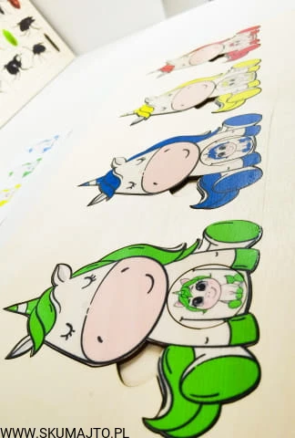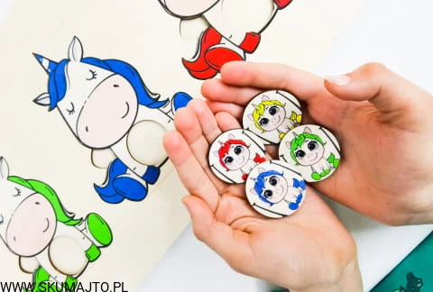 - Ćwiczenie pamięci: Zapamiętuj układ jednorożców i staraj się go odtworzyć po wyjęciu elementów przez rodzica.