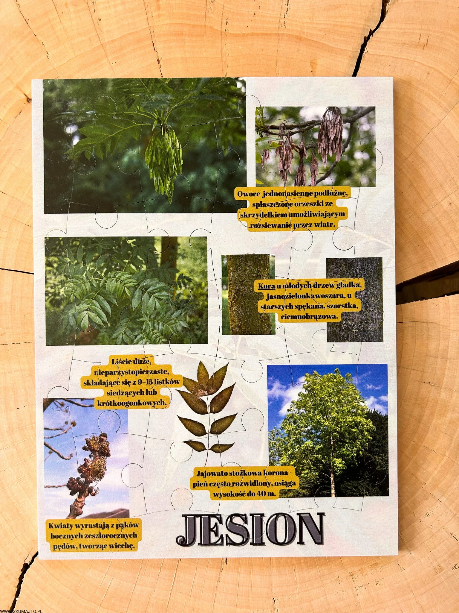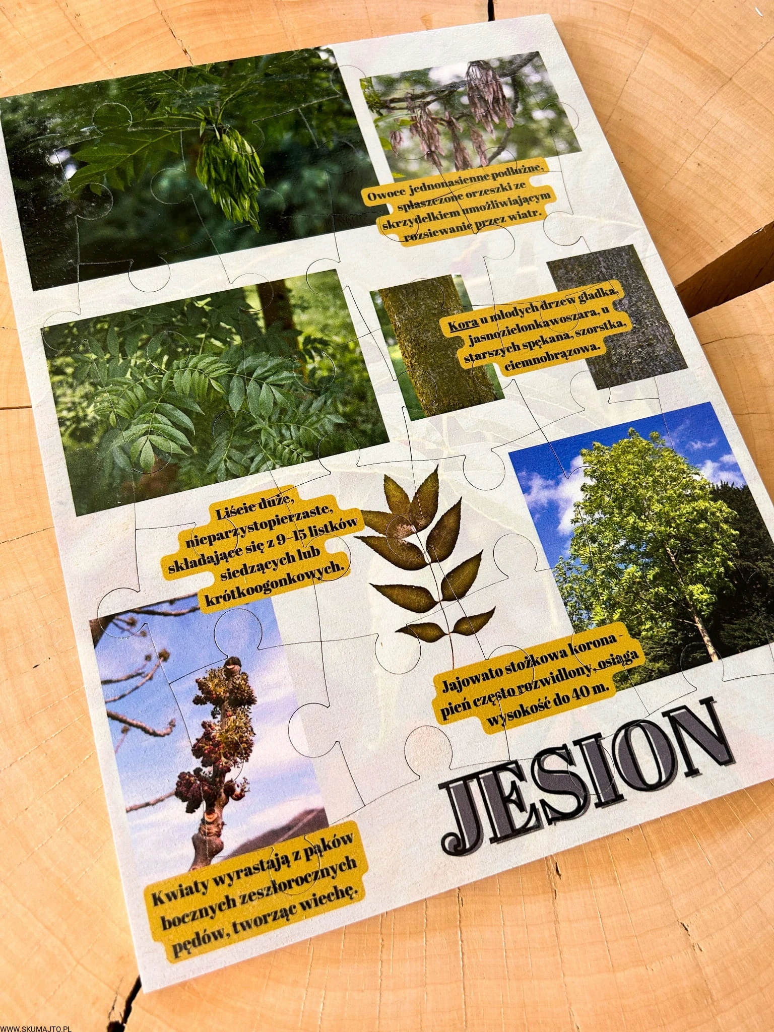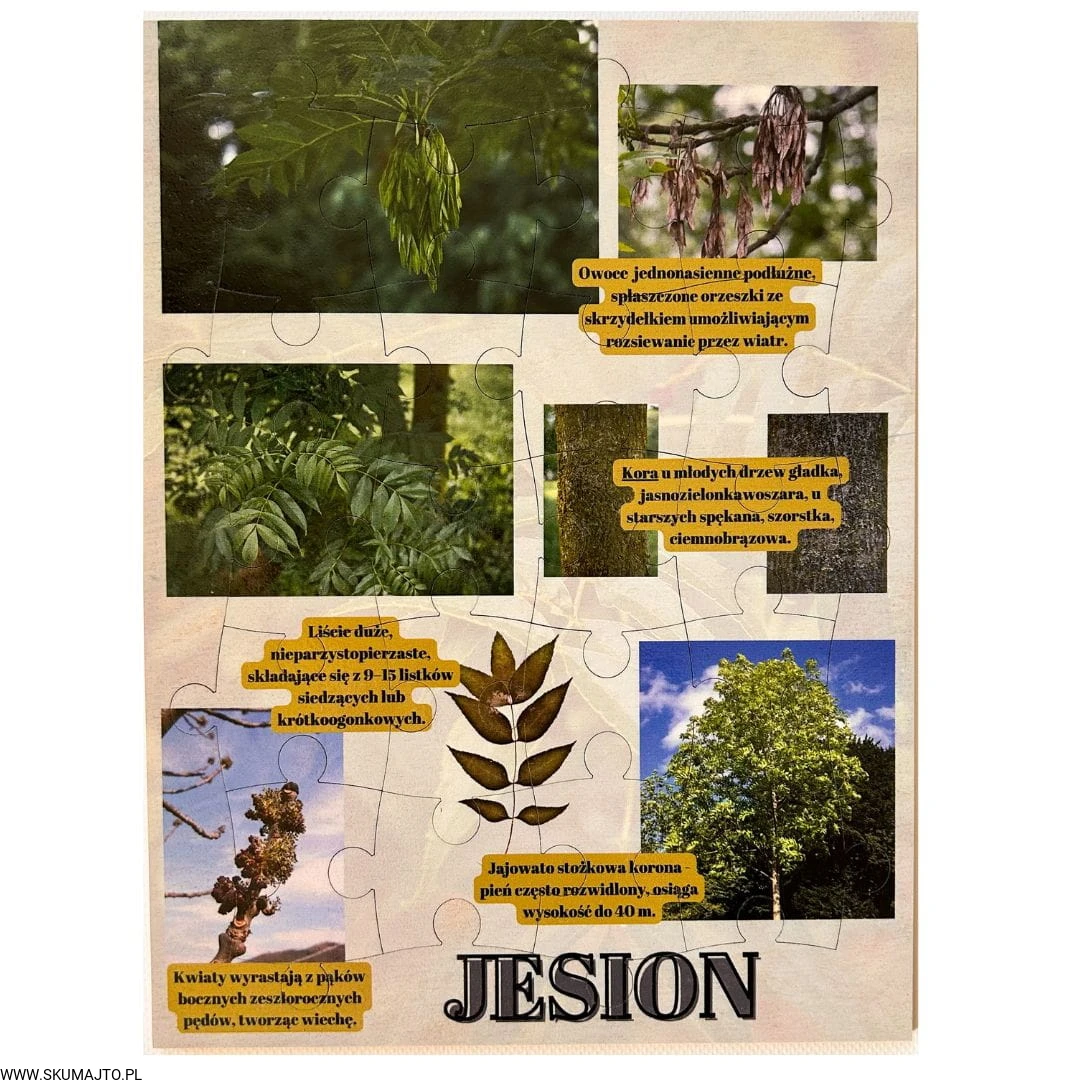 Zabawki edukacyjne, nauka przez zabawę: Nasza układanka to nie tylko zabawa, to także cenna lekcja o jesionie. Dzieci poznają różnorodność tego drzewa i dowiadują się fascynujących faktów, rozwijając jednocześnie swoje umiejętności.
