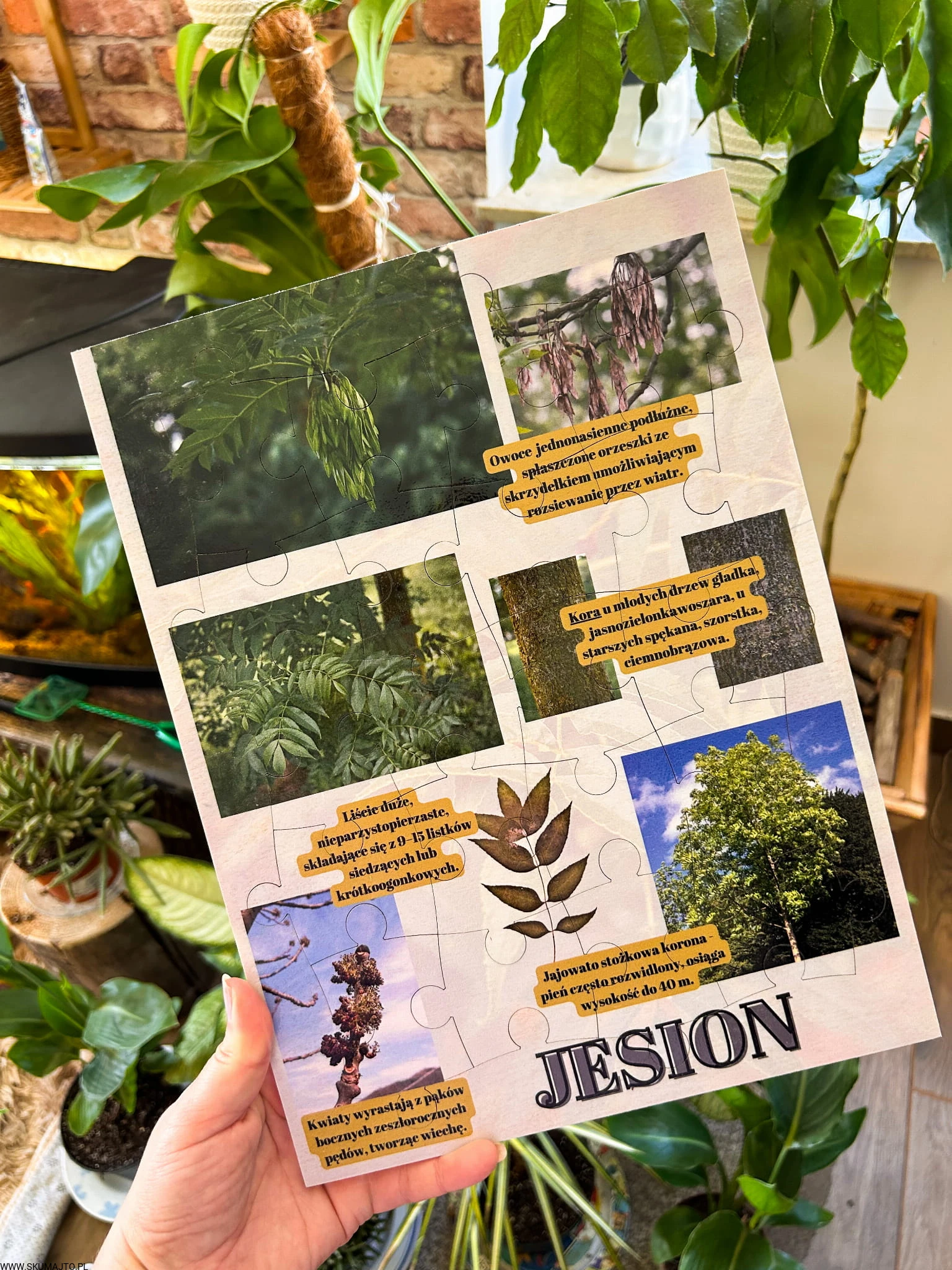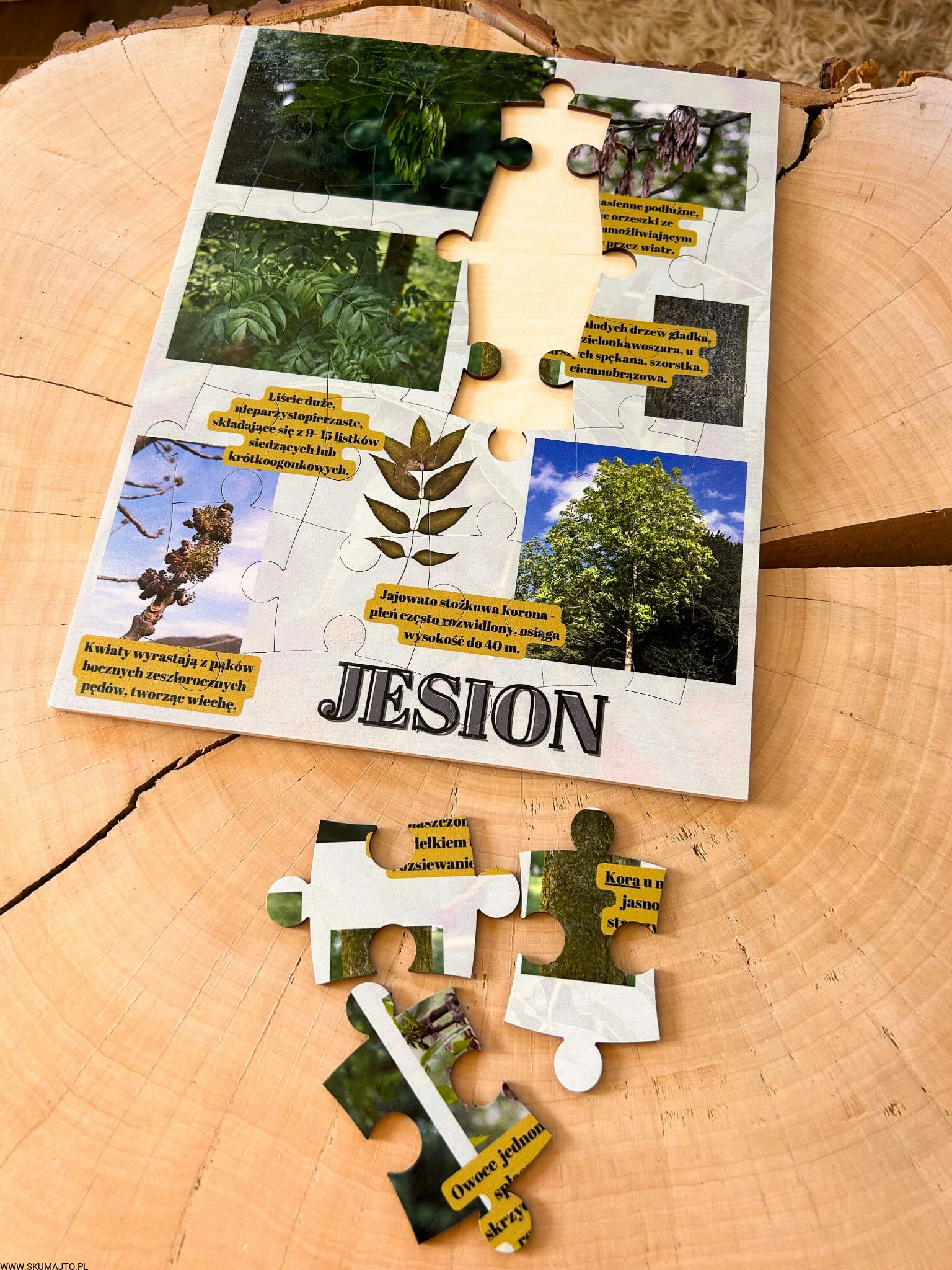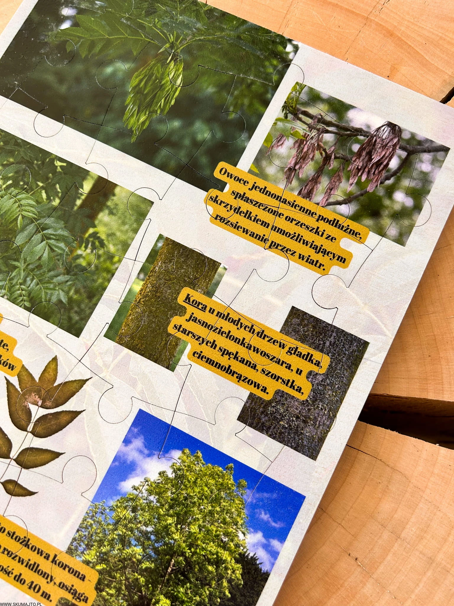 Zabawki edukacyjne, nauka przez zabawę: Nasza układanka to nie tylko zabawa, to także cenna lekcja o jesionie. Dzieci poznają różnorodność tego drzewa i dowiadują się fascynujących faktów, rozwijając jednocześnie swoje umiejętności.
