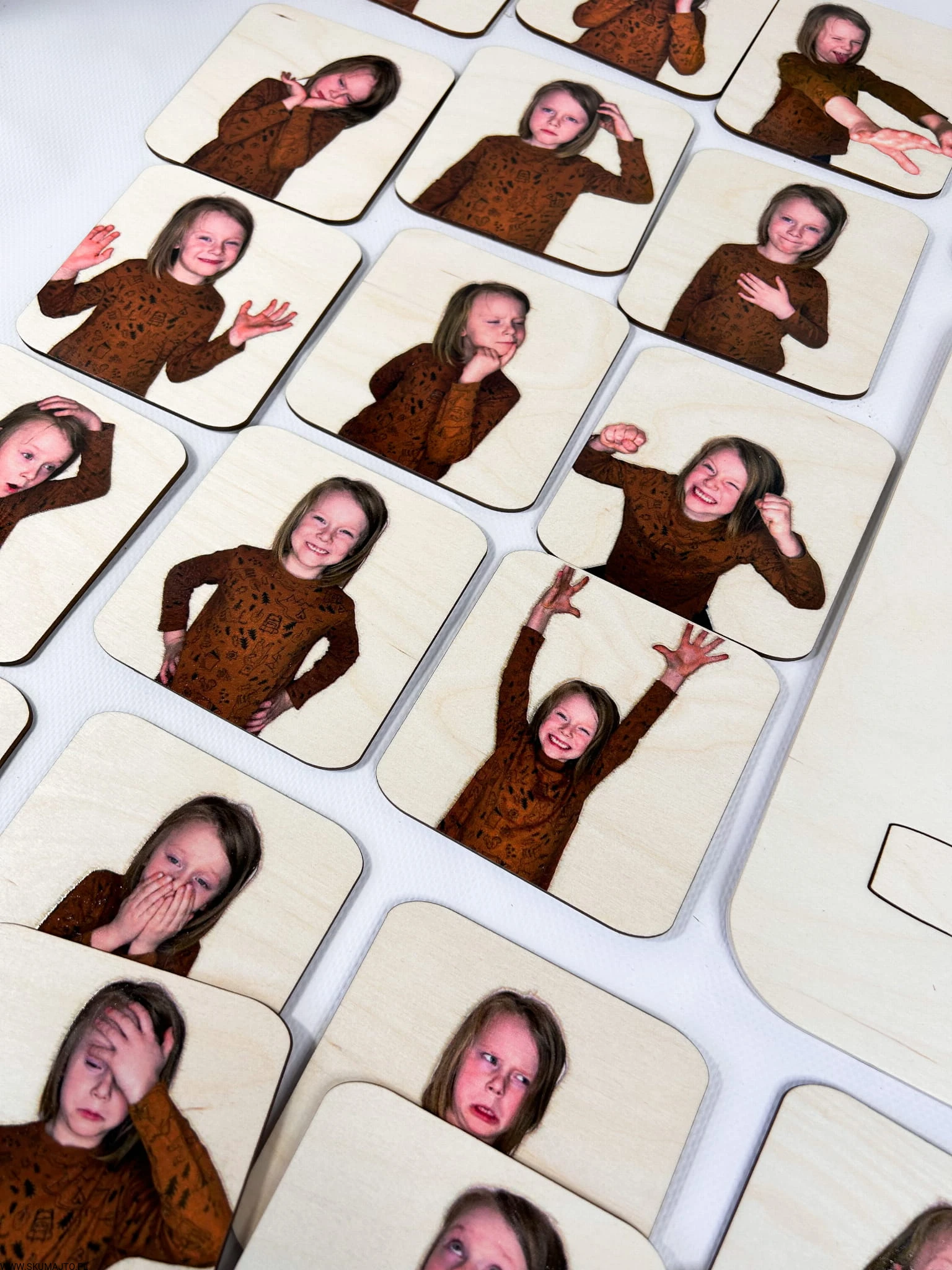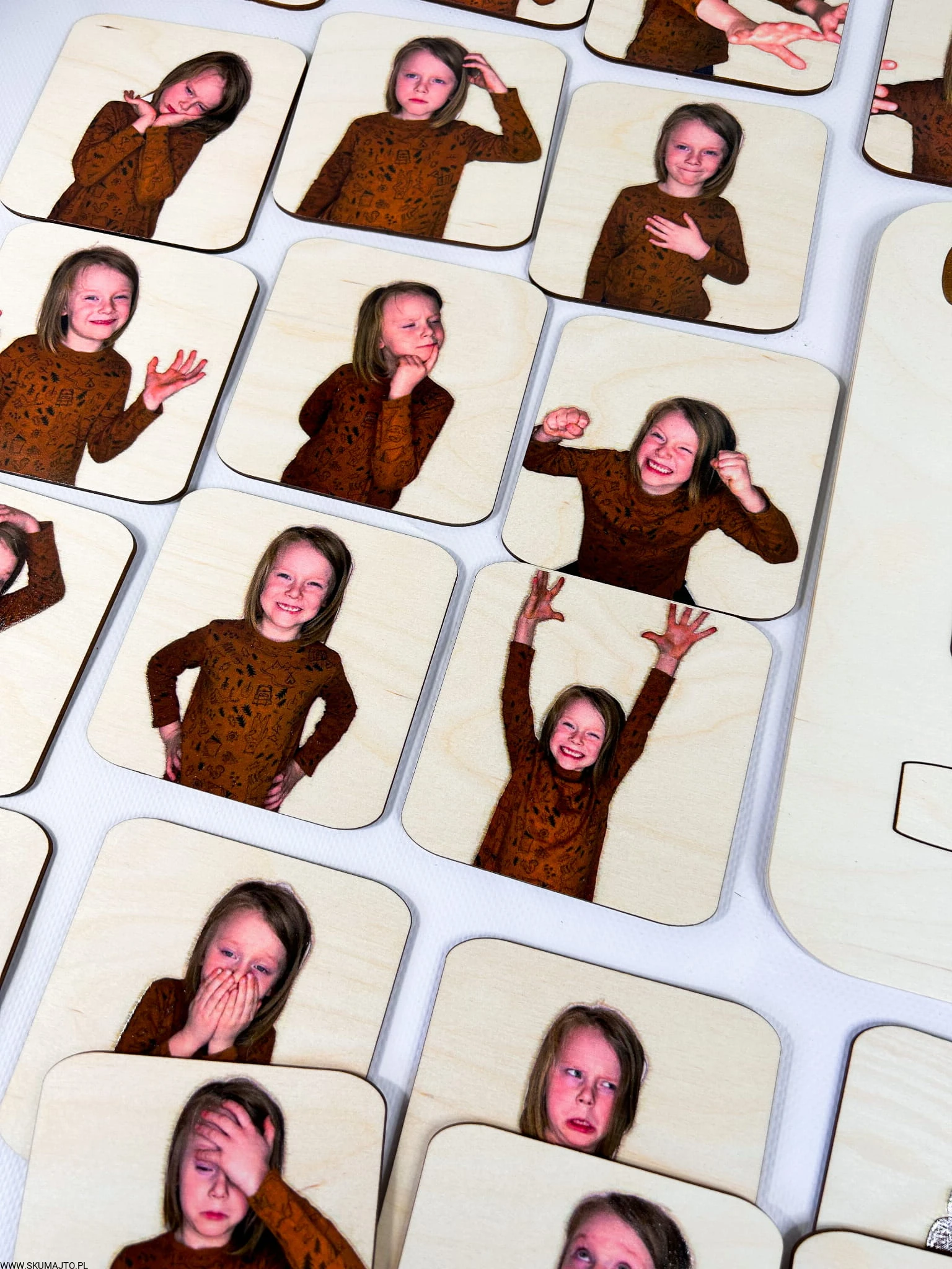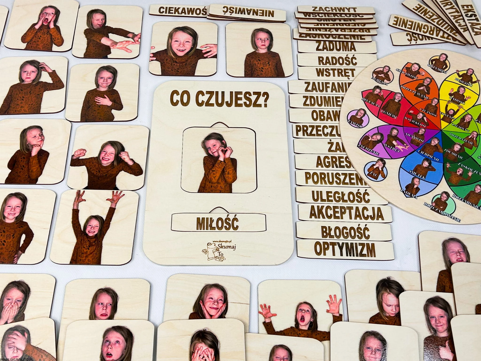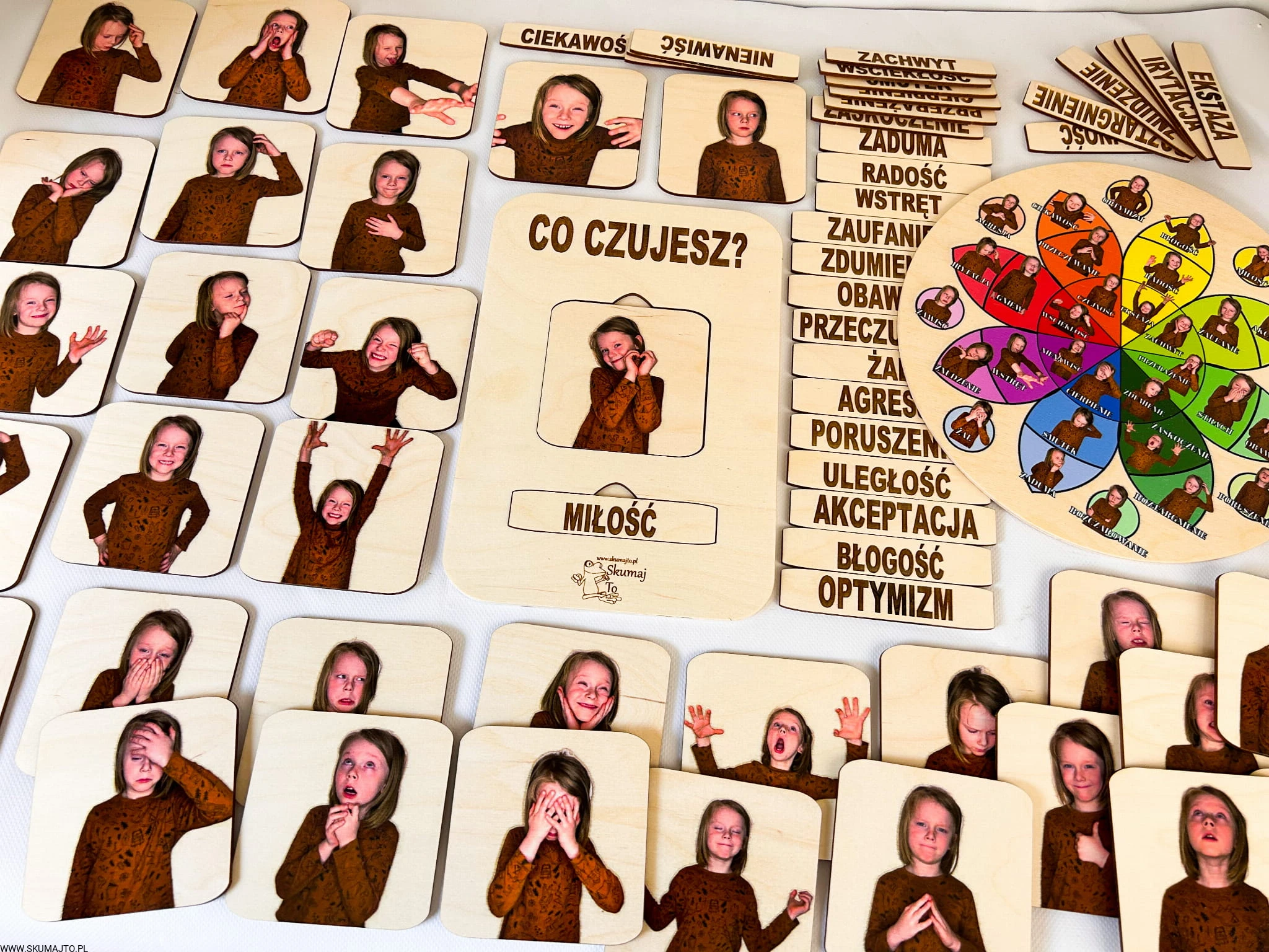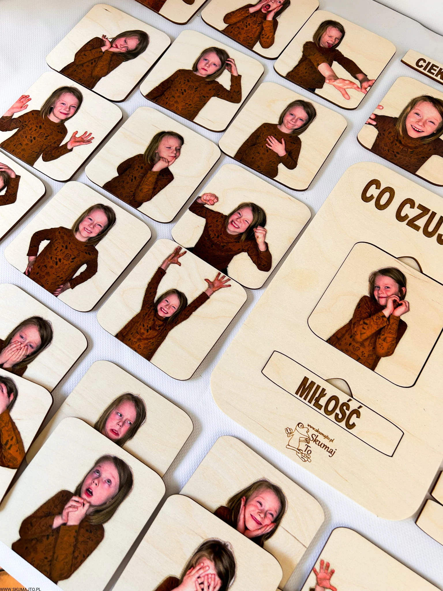 - 32 emocje w większej wersji: Drewniane elementy z wyraźnymi grafikami przedstawiającymi różne emocje.