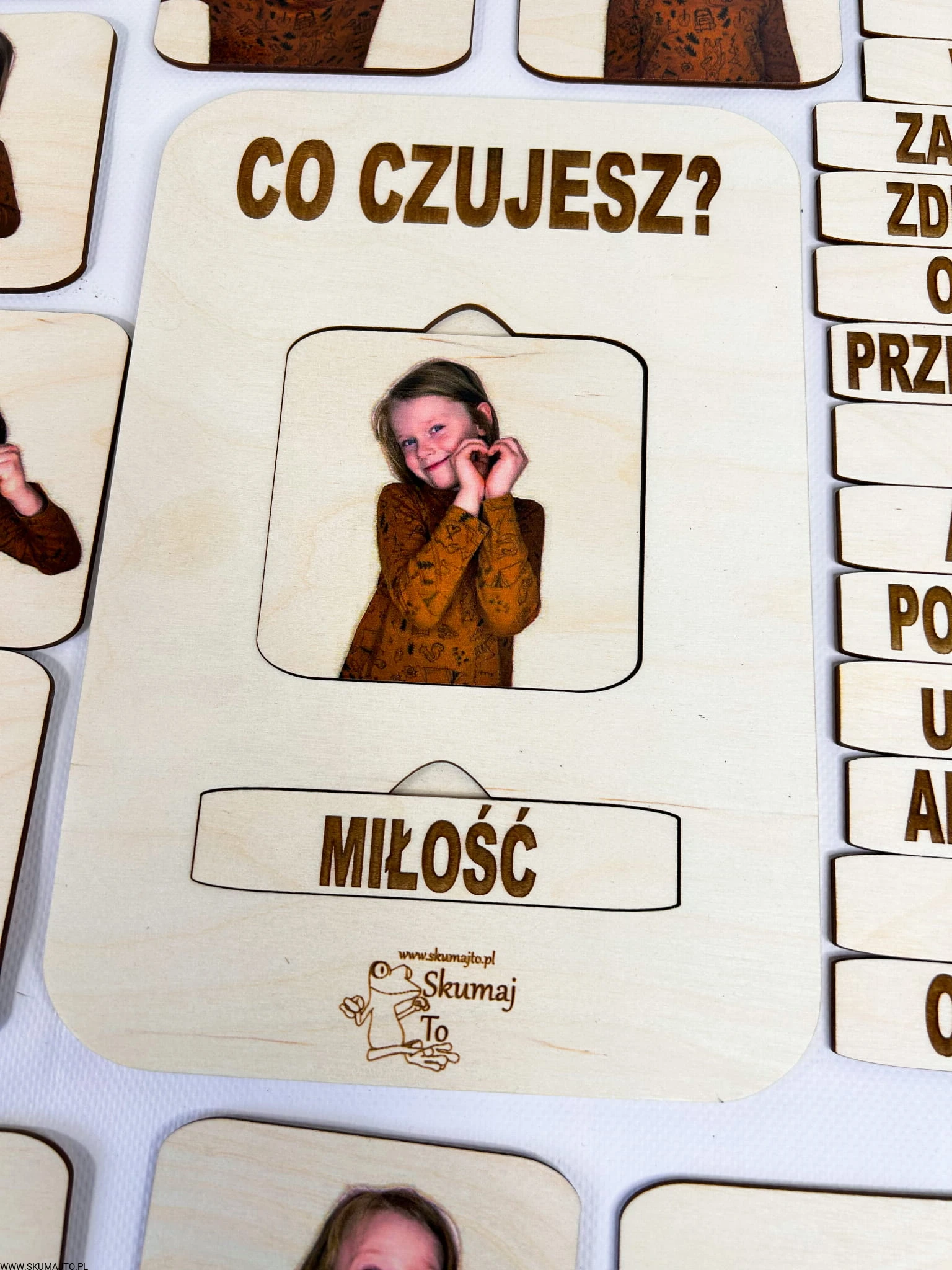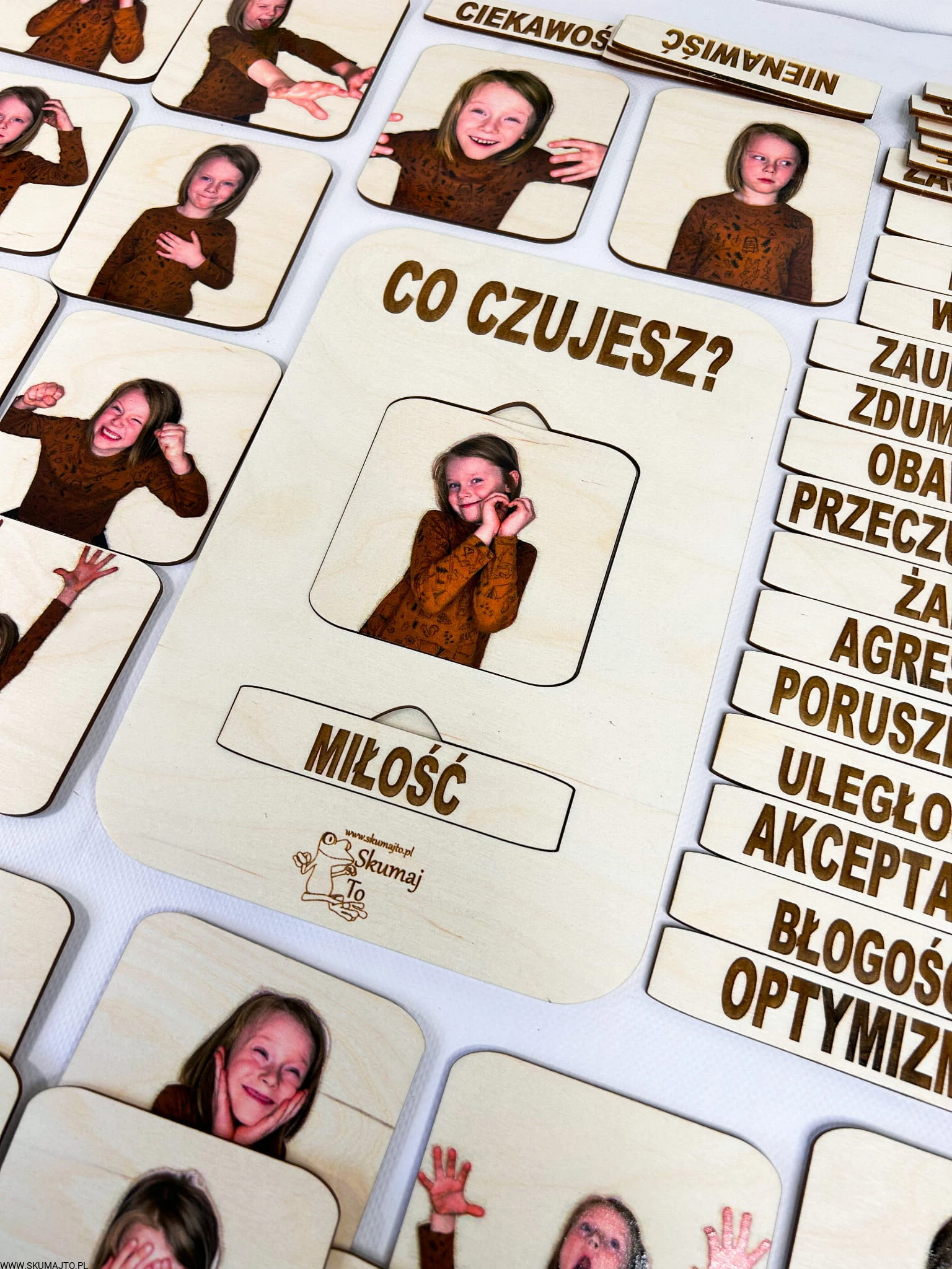 - 32 podpisy każdej emocji: Drewniane tabliczki z nazwami emocji, które można dopasować do obrazków.