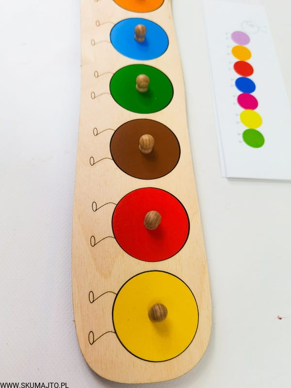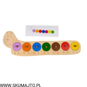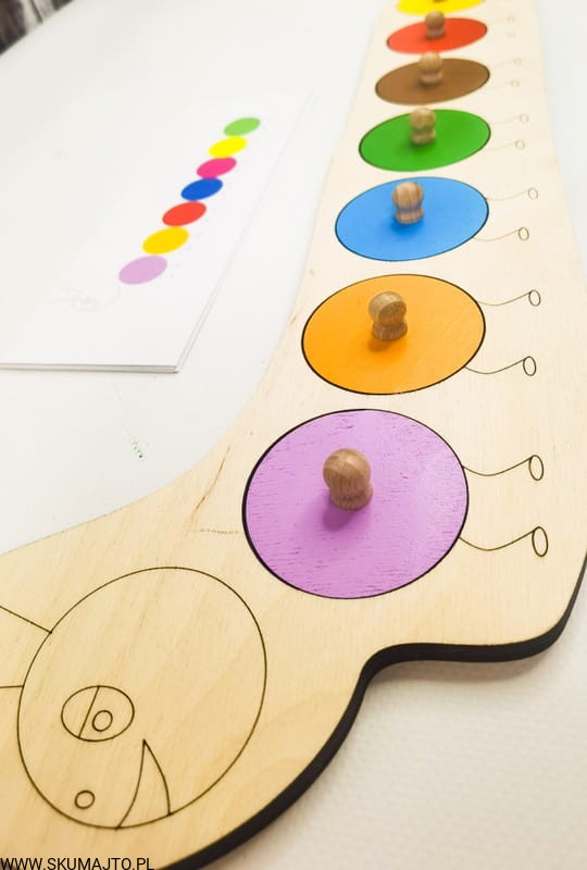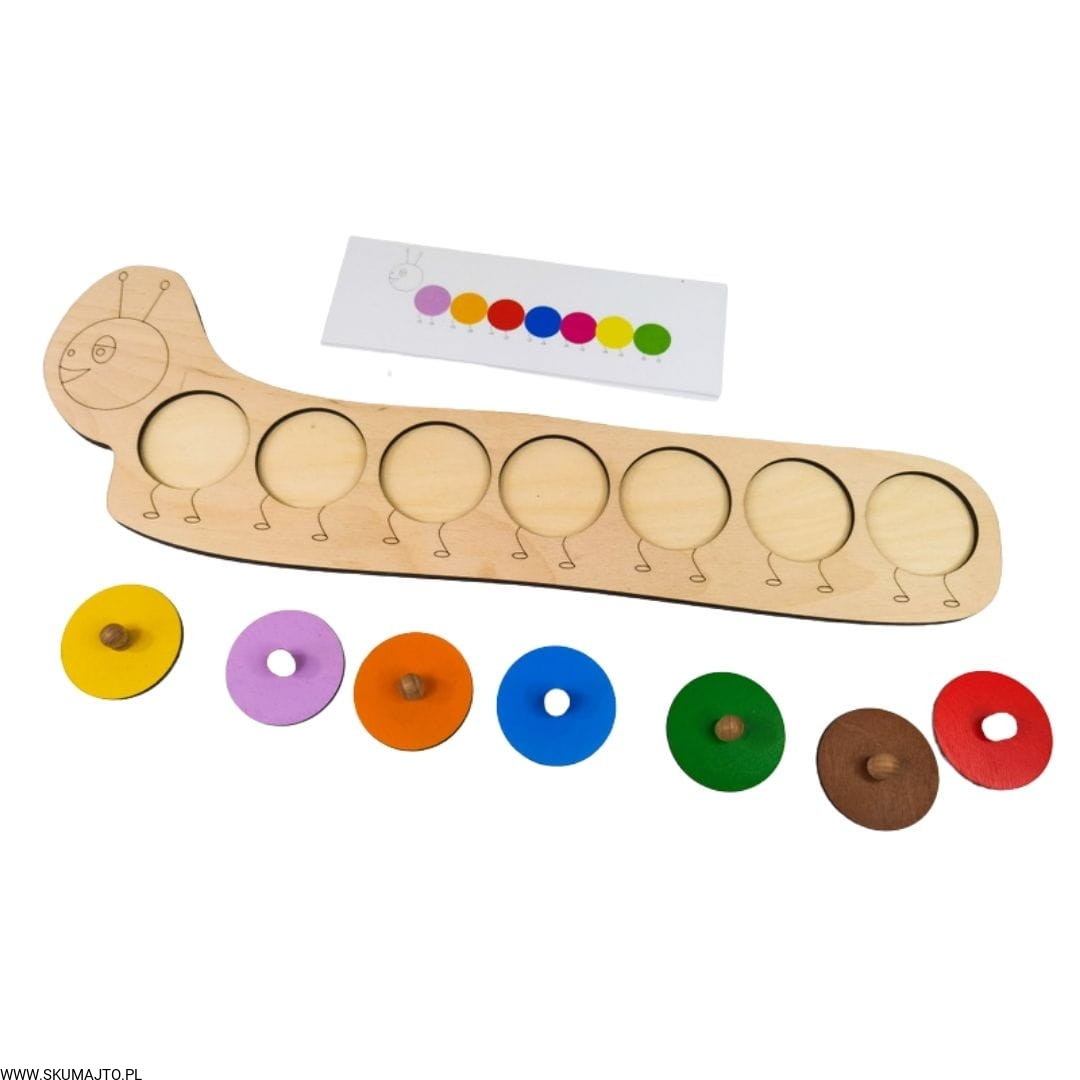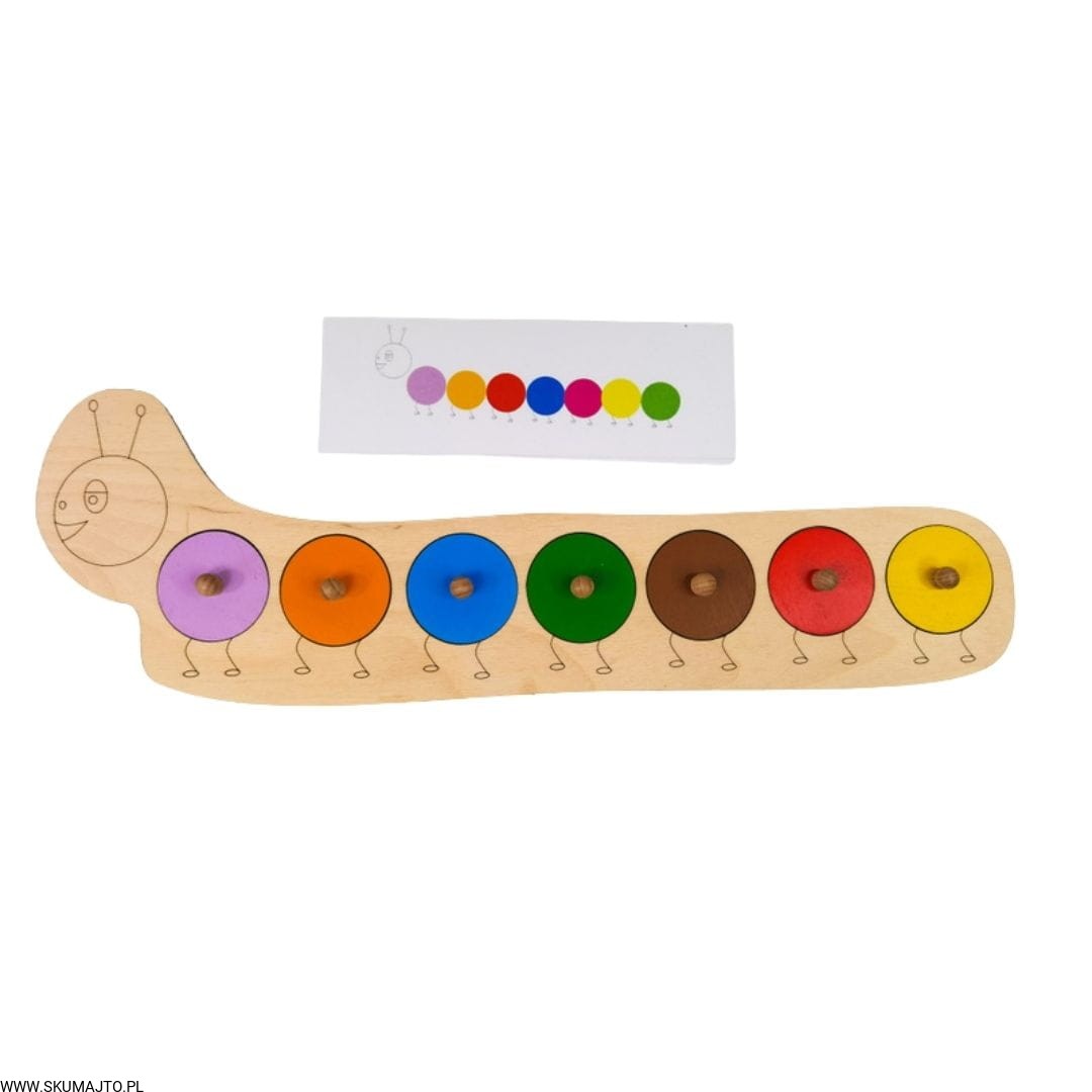 Kolorowa gąsienica, drewniana układanka, pierwsza układanka, odwzorowywanie, uchwyty, nauka kolorów