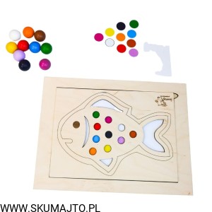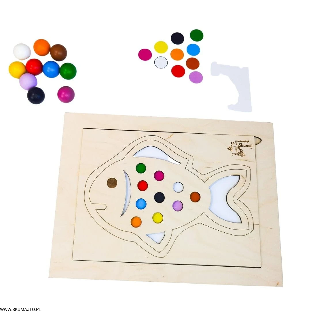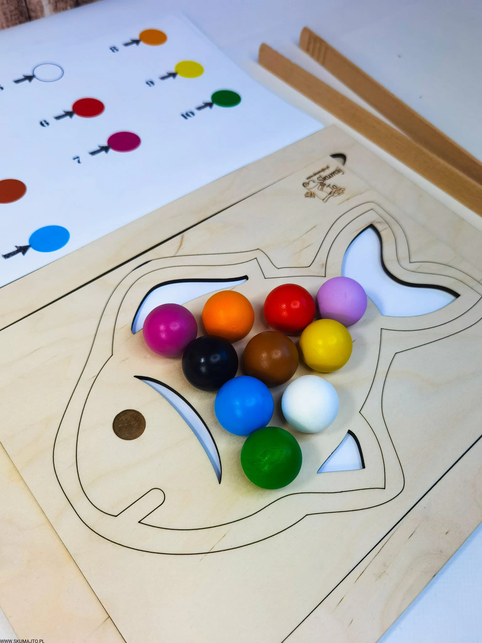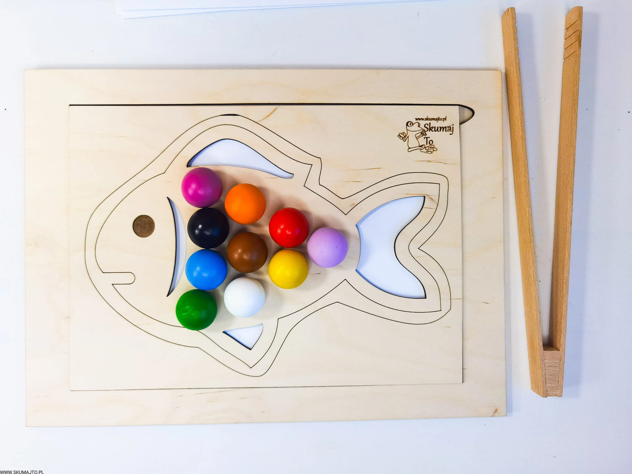 Kolorowa rybka, drewniana układanka, nauka kolorów, odwzorowywanie, kulki, szczypce