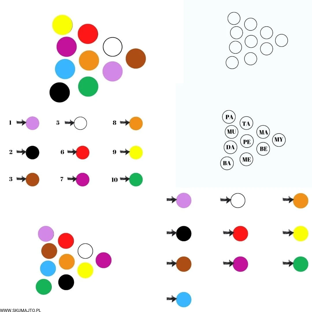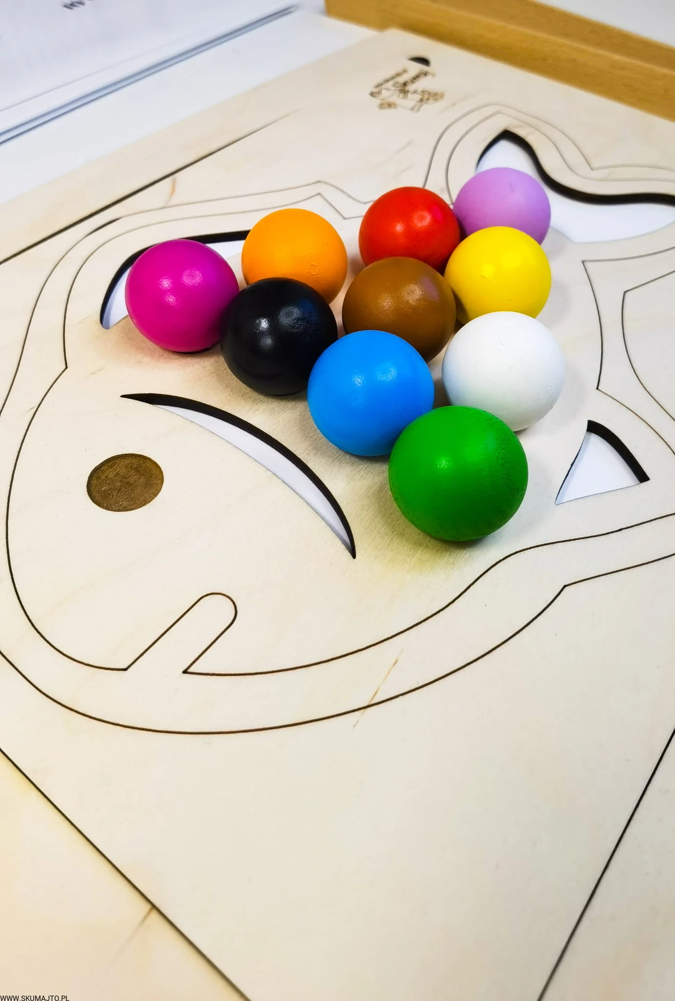 - 10 kolorowych kulek o średnicy 3 cm: Różnobarwne kulki, które można układać według wzorów.