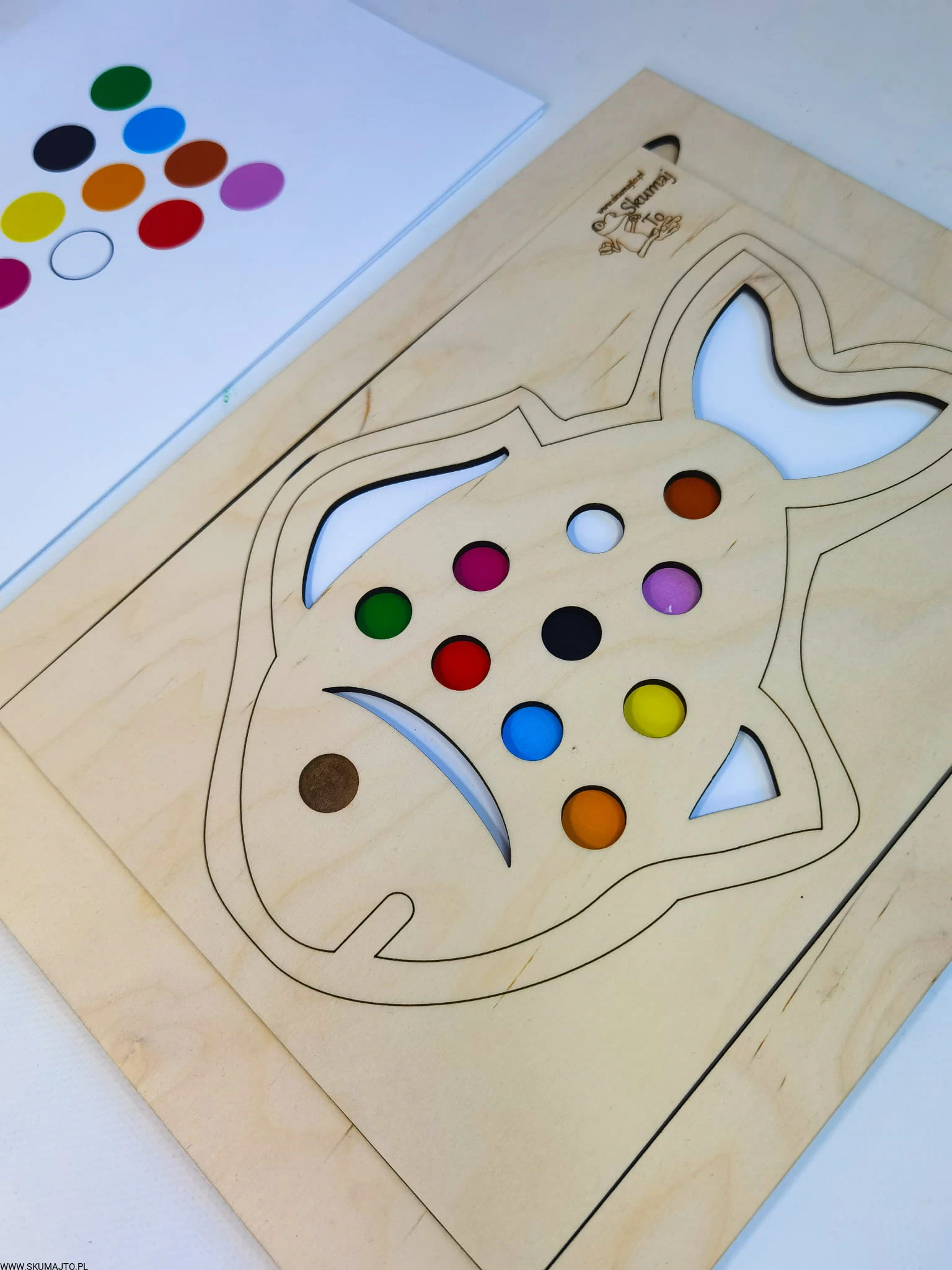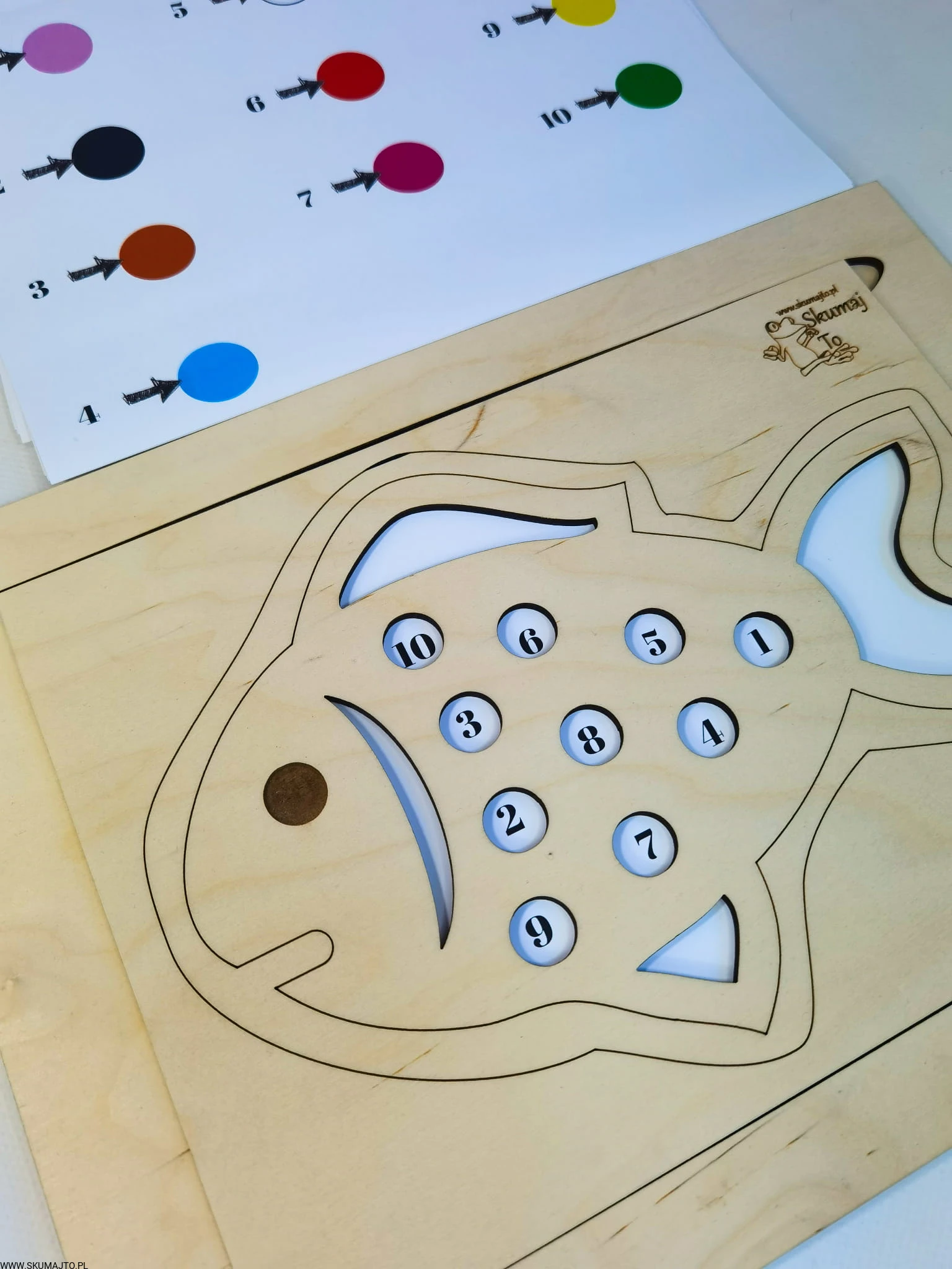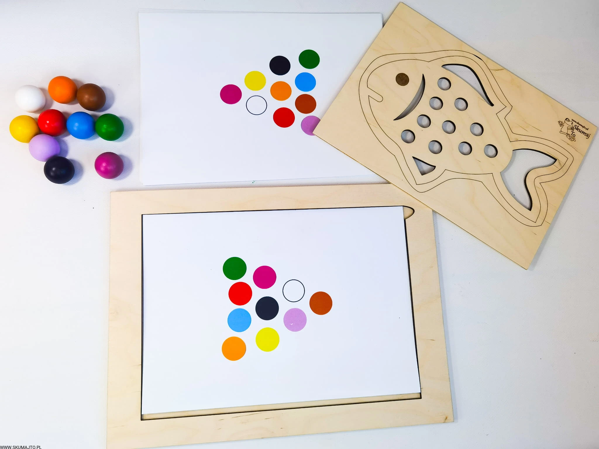 W zestawie znajduje się podstawa w kształcie rybki, do której można włożyć jedną z sześciu kart A4. Zadaniem dziecka jest odwzorowanie układu kolorowych kulek zgodnie z wzorem na karcie, używając do tego drewnianych szczypiec. Dzięki tej zabawie dziecko uczy się precyzji i cierpliwości.