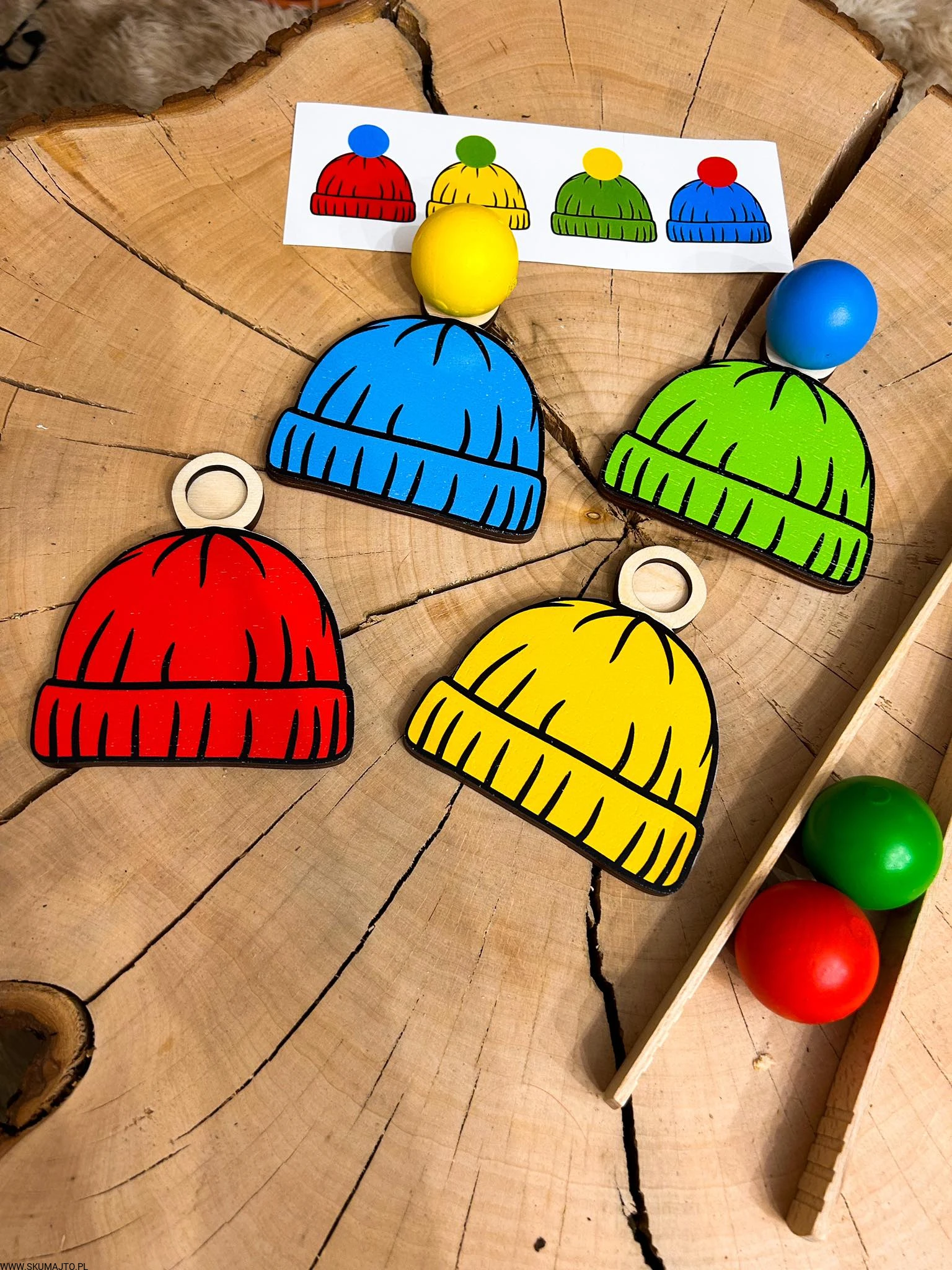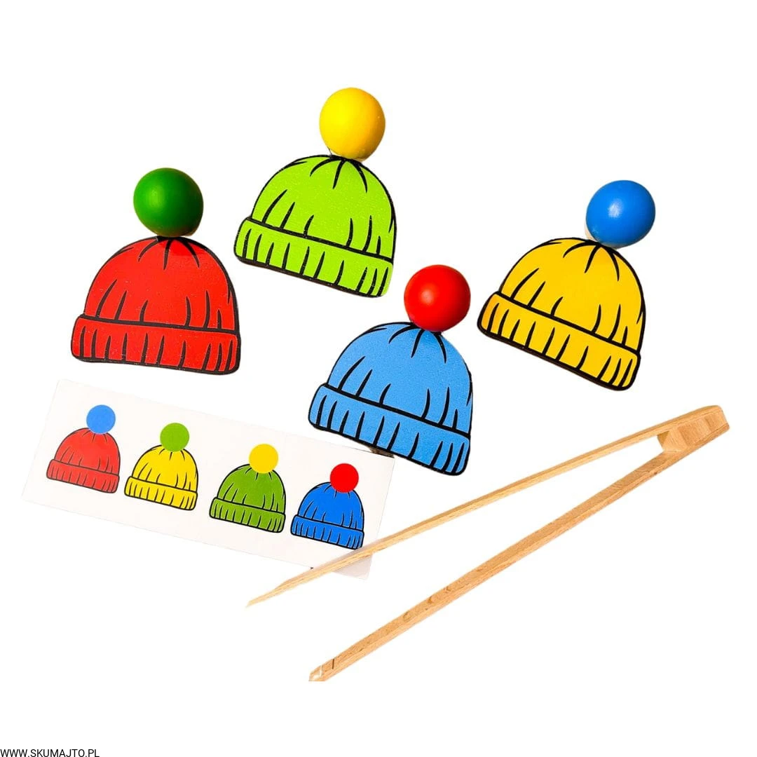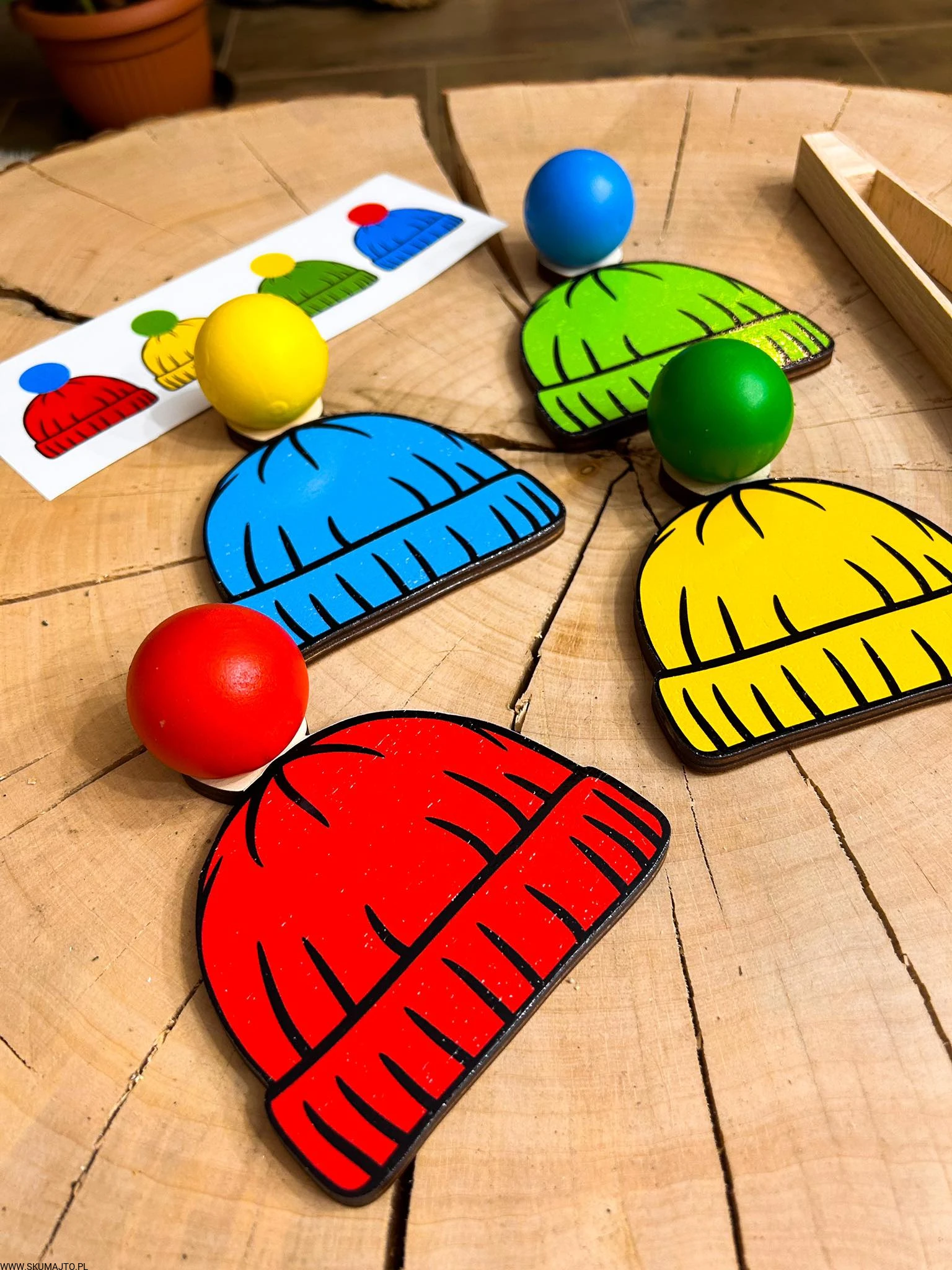 Kolorowe czapeczki, drewniana układanka do nauki kolorów, odwzorowywanie, mała motoryka