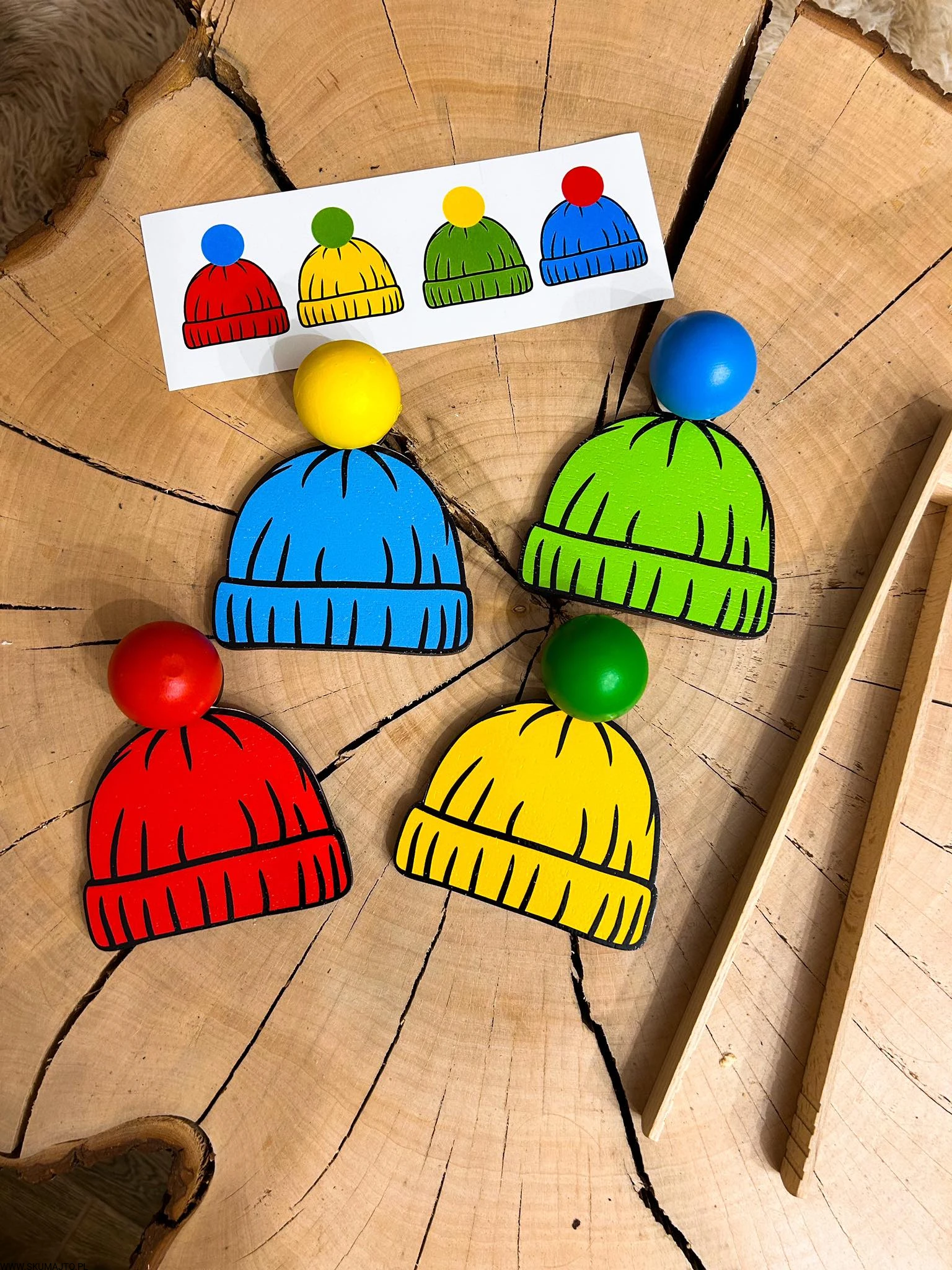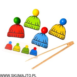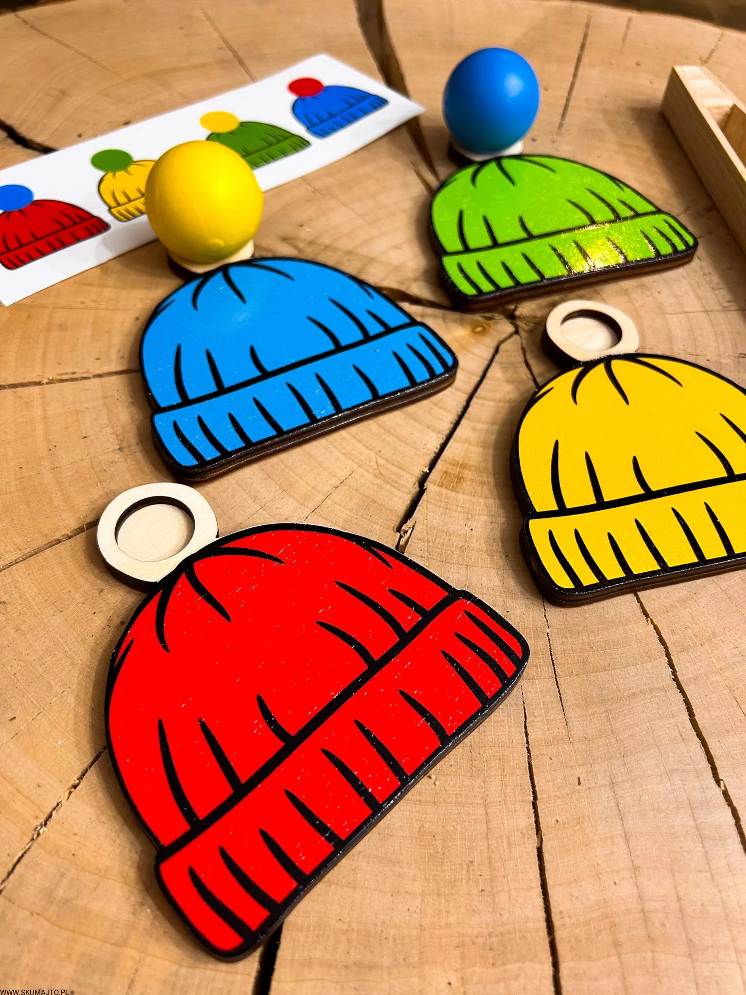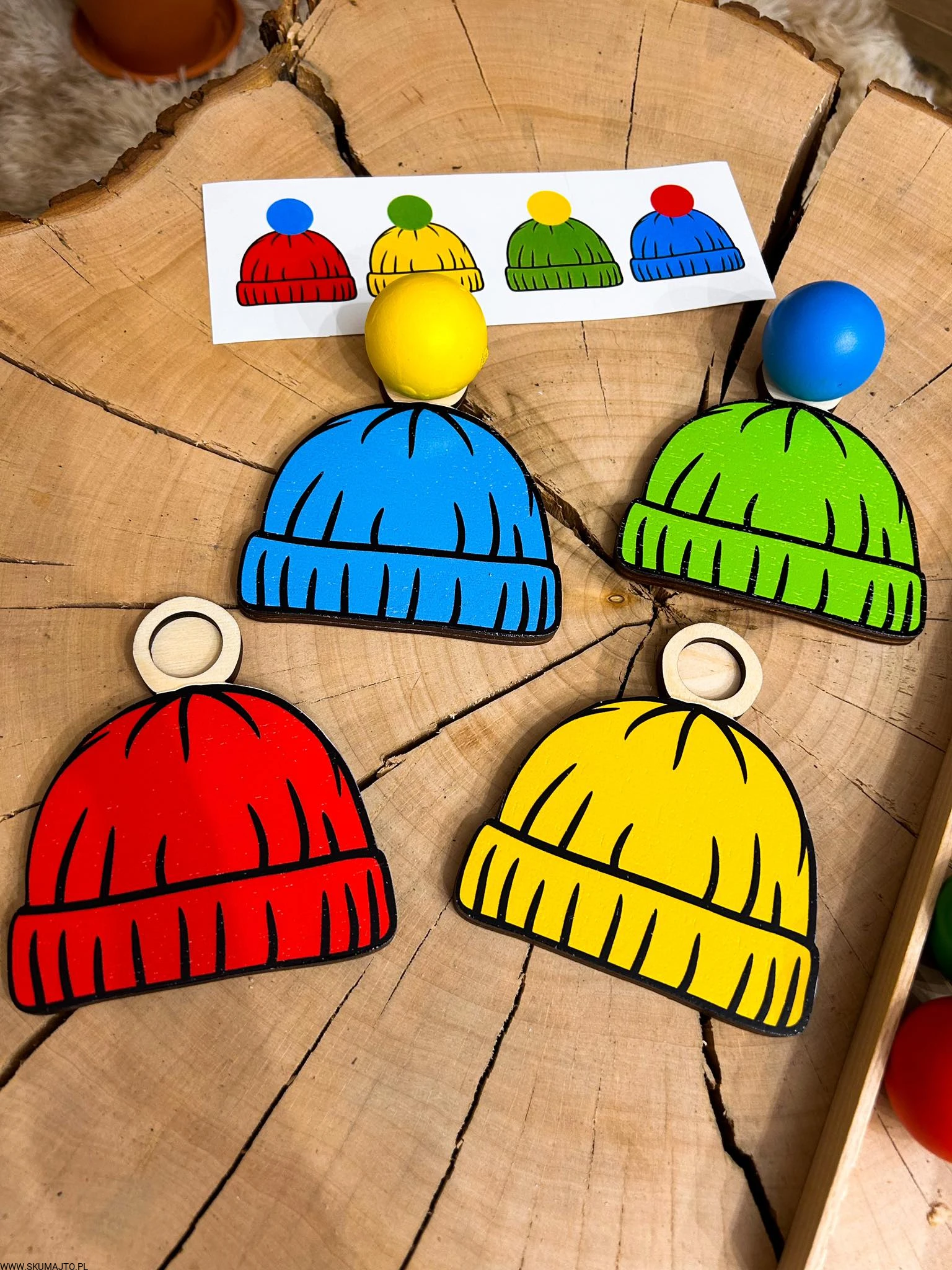 Kolorowe czapeczki, drewniana układanka do nauki kolorów, odwzorowywanie, mała motoryka