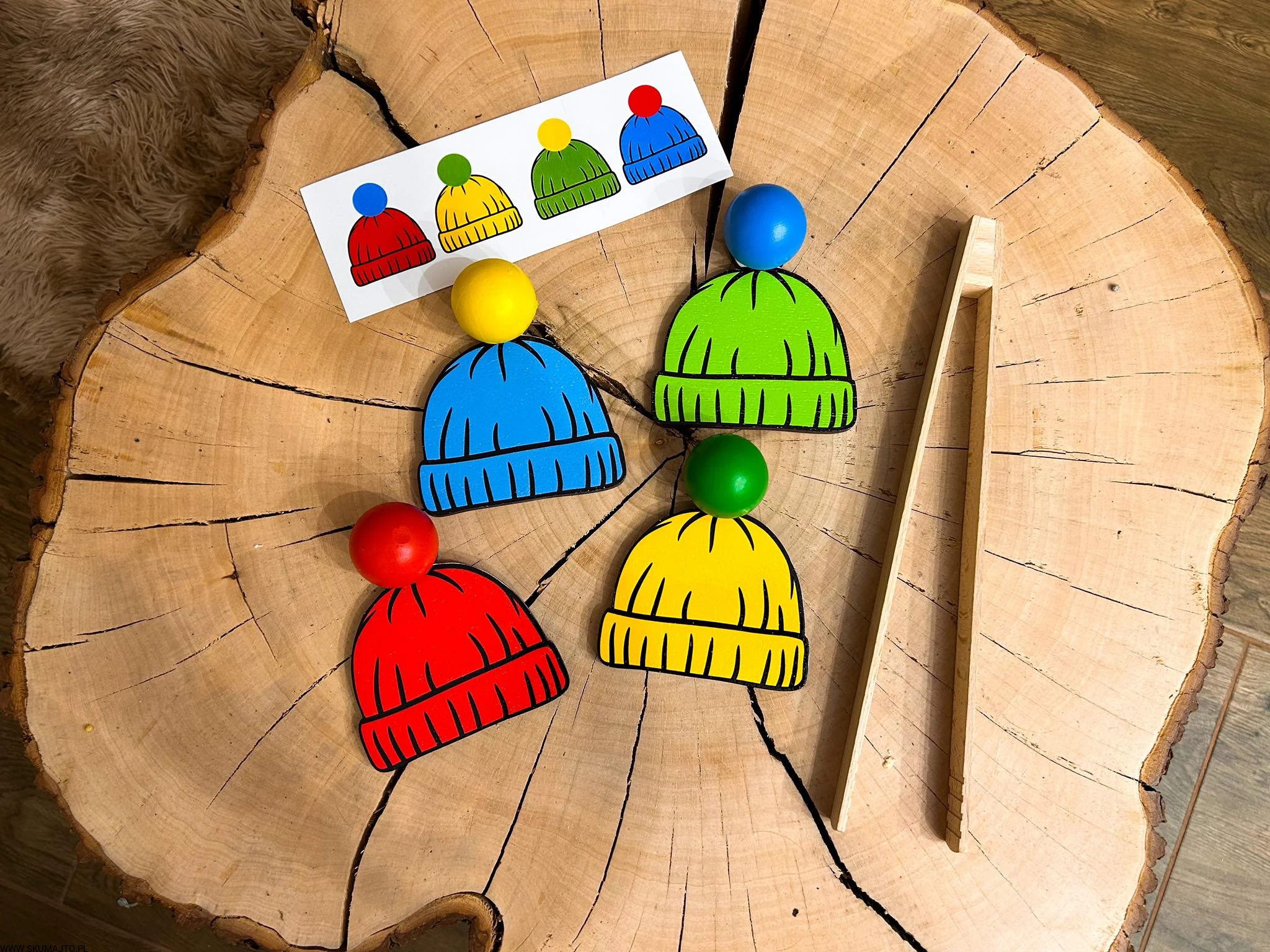 - Zadanie z Pomponami: Starsze dzieci mogą korzystać ze szczypiec, aby ułożyć czapeczki w odpowiedniej kolejności i umieścić na nich pompony, zgodnie z wzorami na kartach do odwzorowywania.