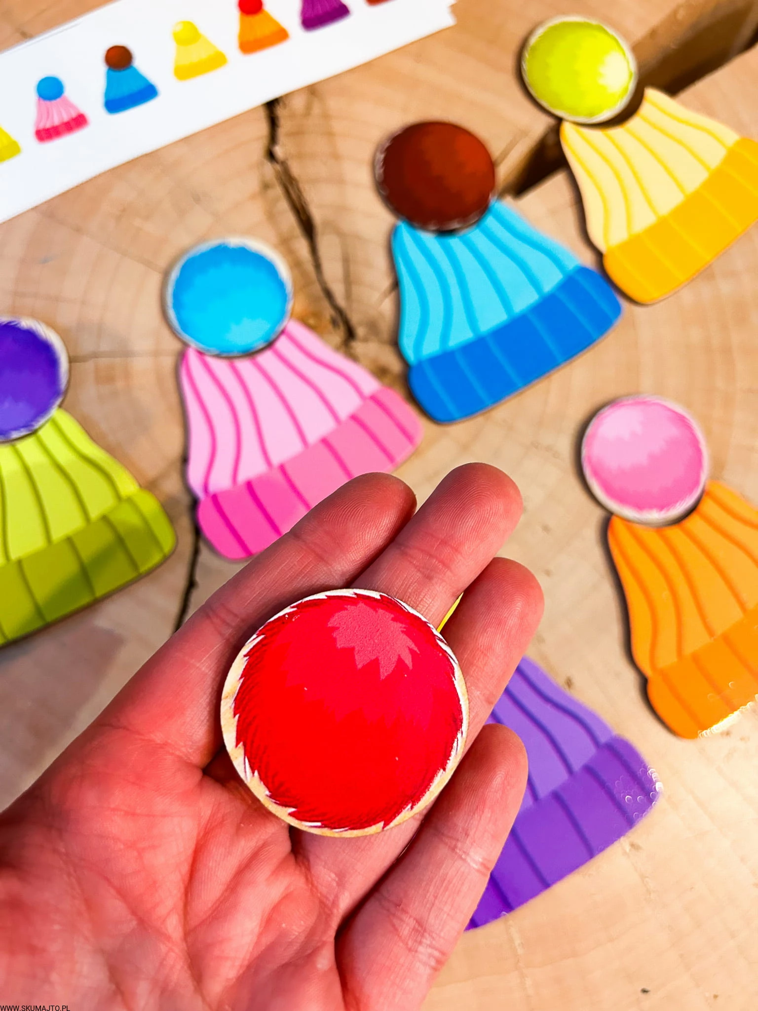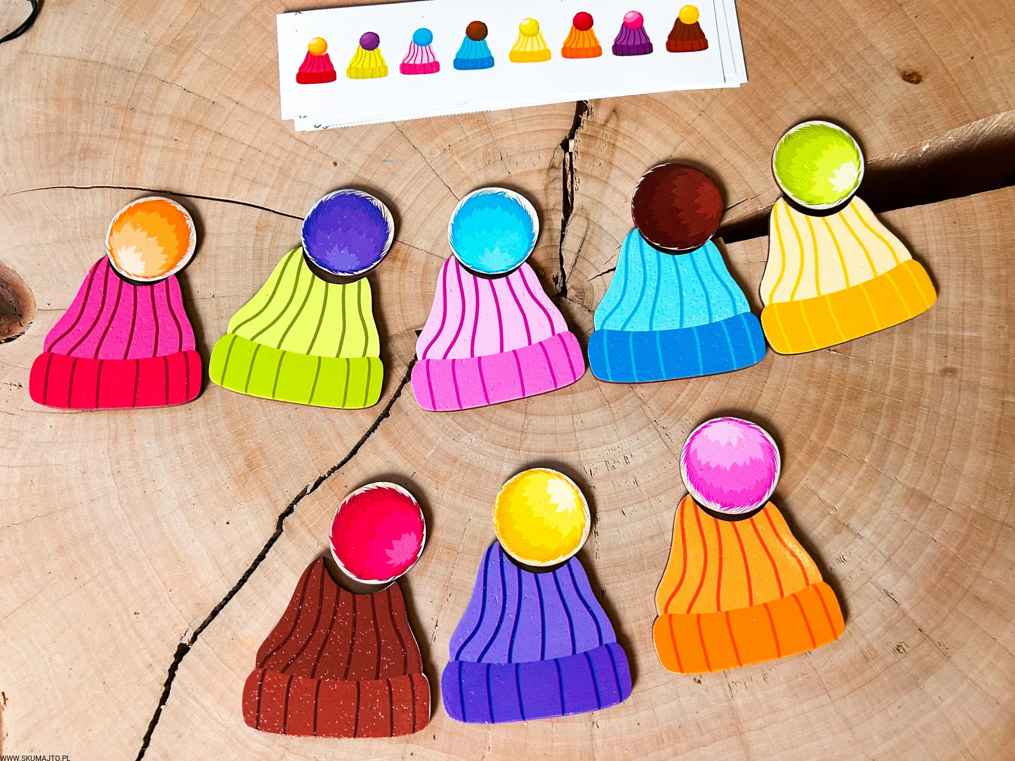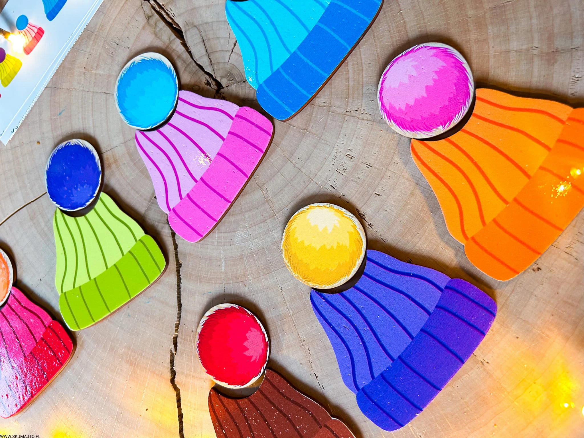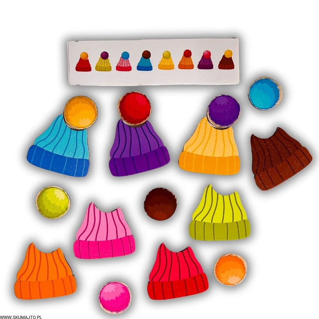 W zestawie znajdziesz 14 elementów – 7 czapek i 7 pomponów w żywych, różnorodnych kolorach. Zadanie polega na dopasowaniu pomponu do odpowiedniej czapki. Dziecko może łączyć je kolorystycznie lub podążać za wzorami z dołączonych kart do odwzorowywania. Z pozoru proste zadanie staje się prawdziwą przygodą edukacyjną, rozwijającą wyobraźnię, koncentrację i małą motorykę.