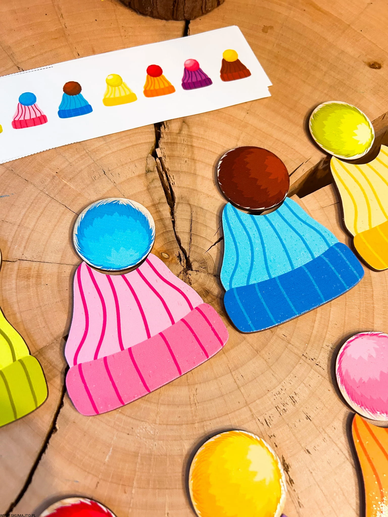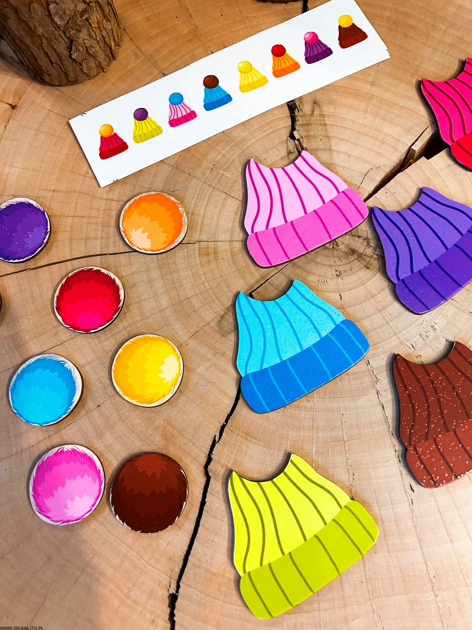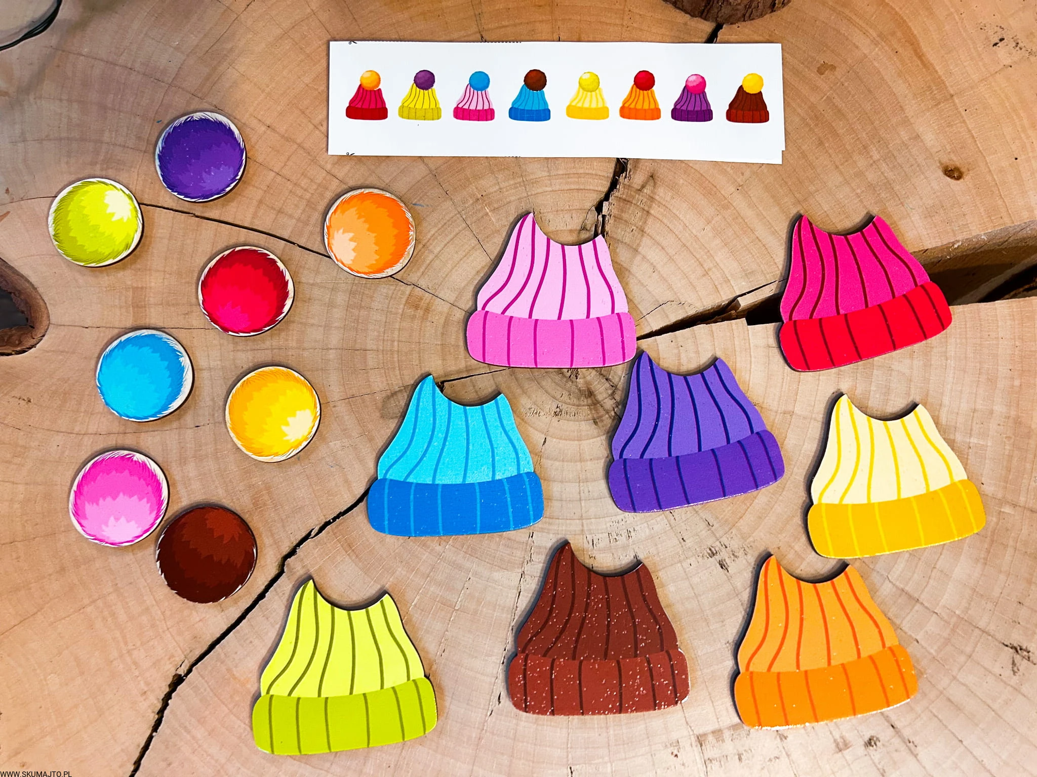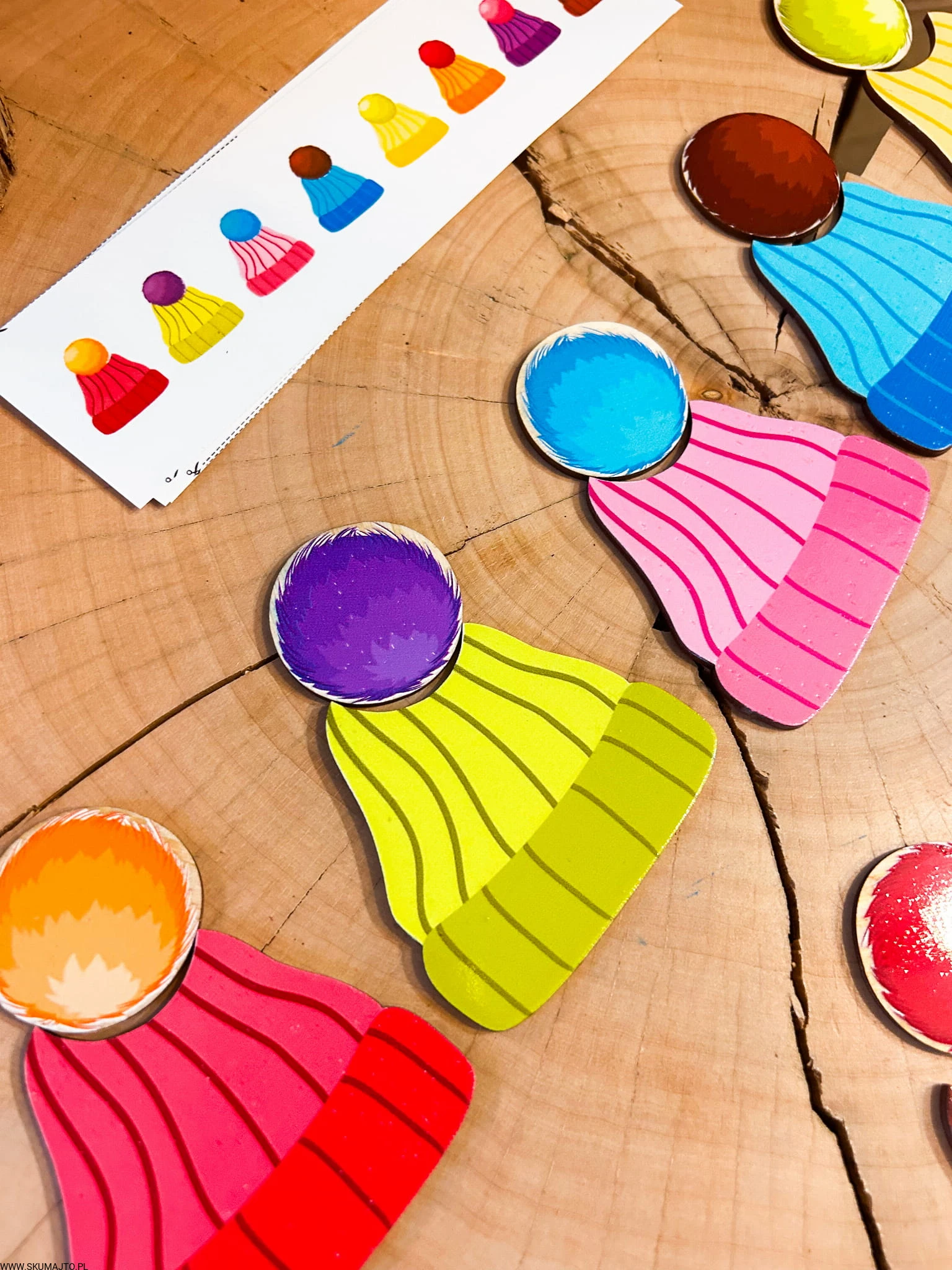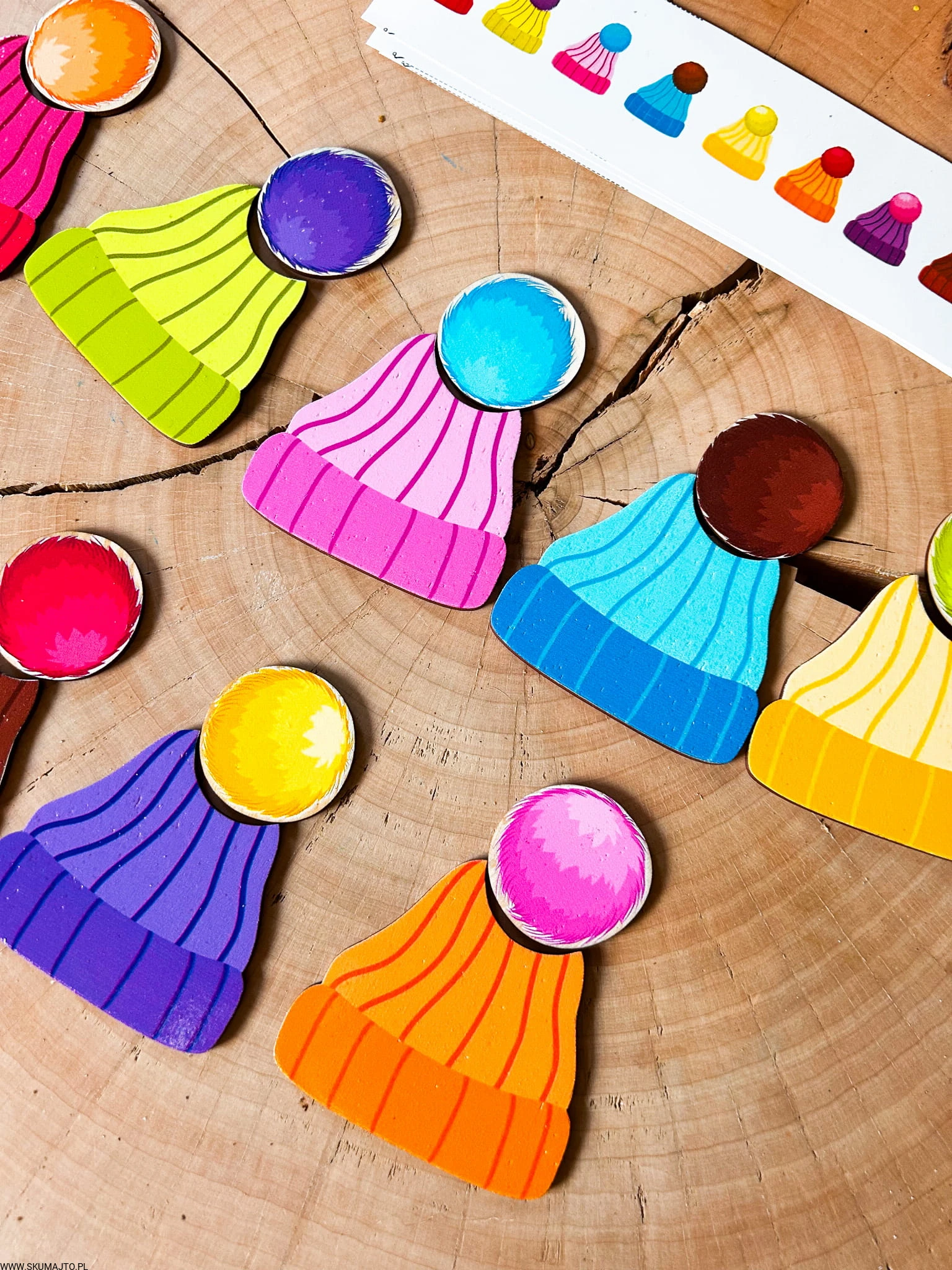 W zestawie znajdziesz 14 elementów – 7 czapek i 7 pomponów w żywych, różnorodnych kolorach. Zadanie polega na dopasowaniu pomponu do odpowiedniej czapki. Dziecko może łączyć je kolorystycznie lub podążać za wzorami z dołączonych kart do odwzorowywania. Z pozoru proste zadanie staje się prawdziwą przygodą edukacyjną, rozwijającą wyobraźnię, koncentrację i małą motorykę.