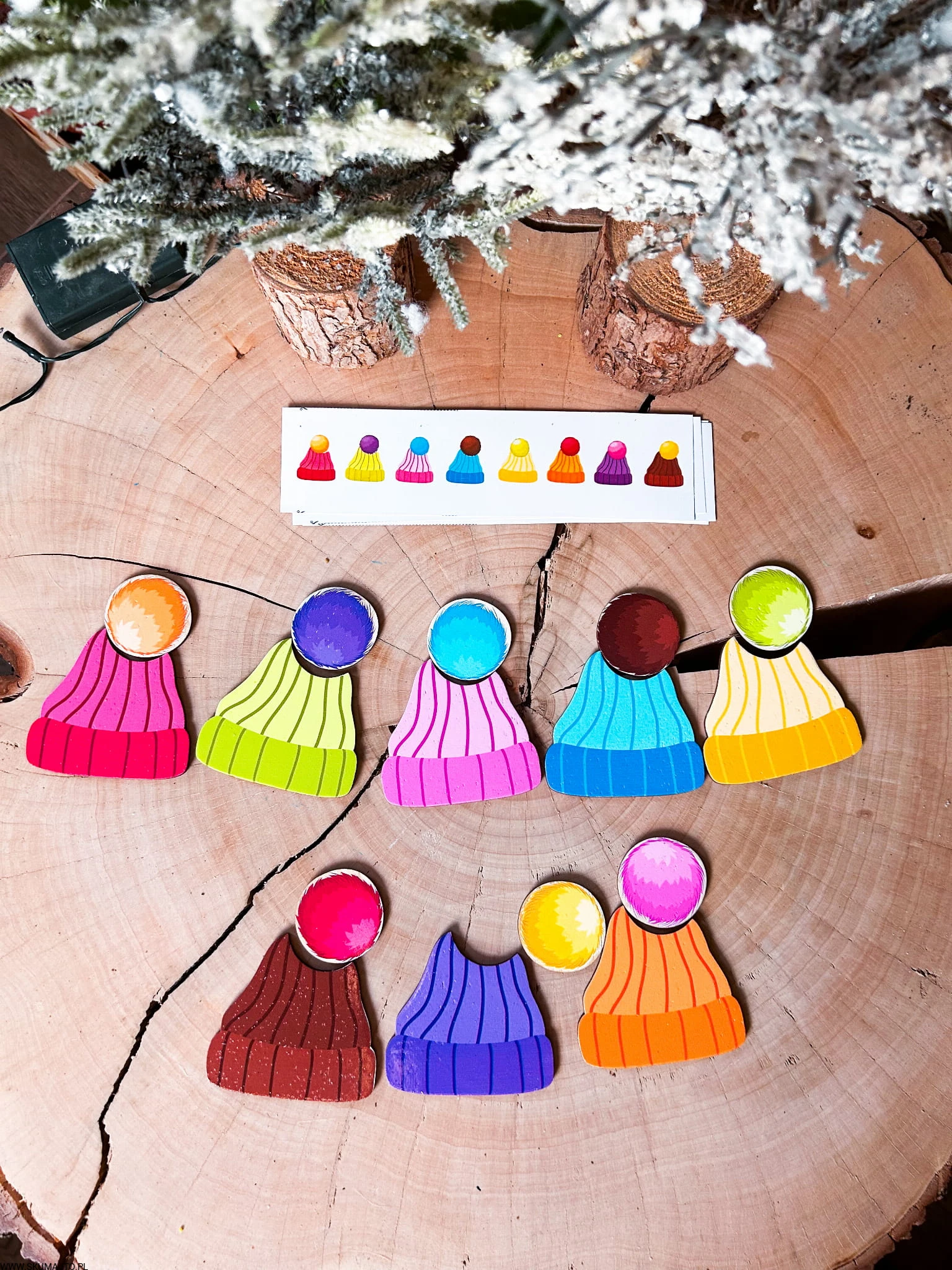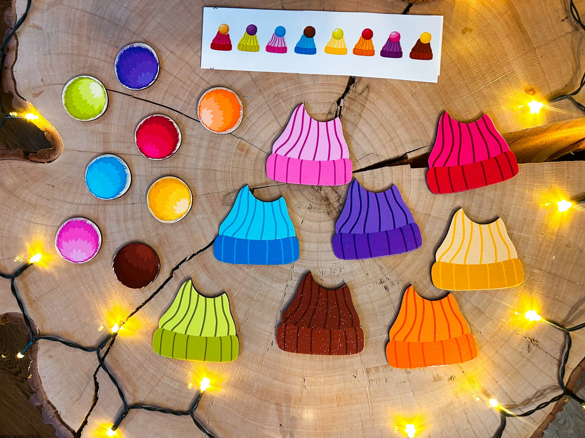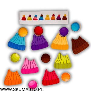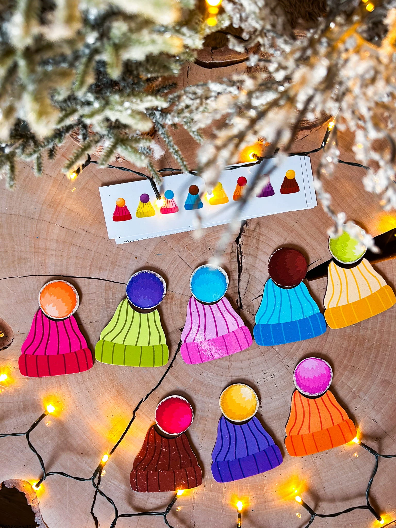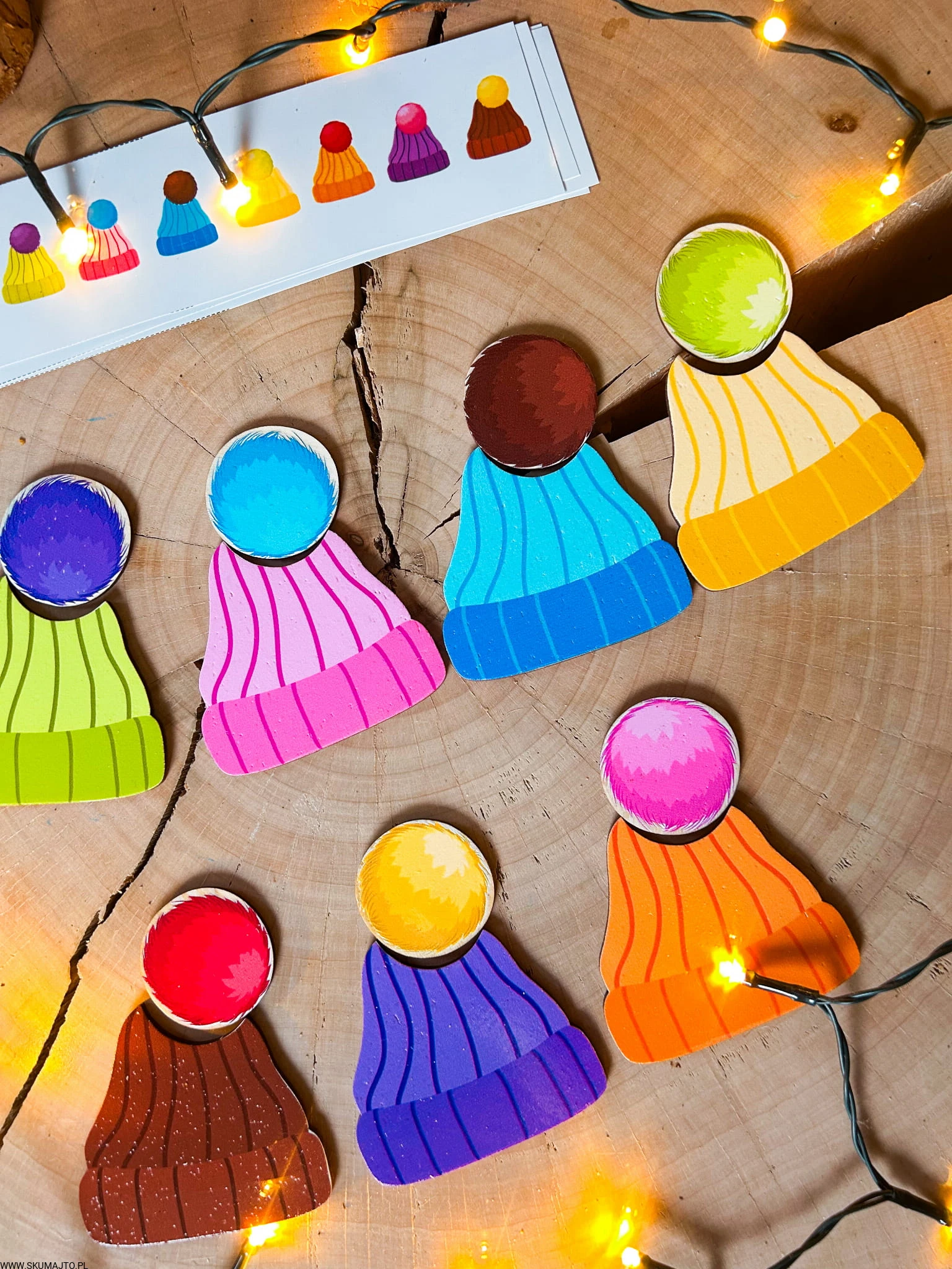 W zestawie znajdziesz 14 elementów – 7 czapek i 7 pomponów w żywych, różnorodnych kolorach. Zadanie polega na dopasowaniu pomponu do odpowiedniej czapki. Dziecko może łączyć je kolorystycznie lub podążać za wzorami z dołączonych kart do odwzorowywania. Z pozoru proste zadanie staje się prawdziwą przygodą edukacyjną, rozwijającą wyobraźnię, koncentrację i małą motorykę.