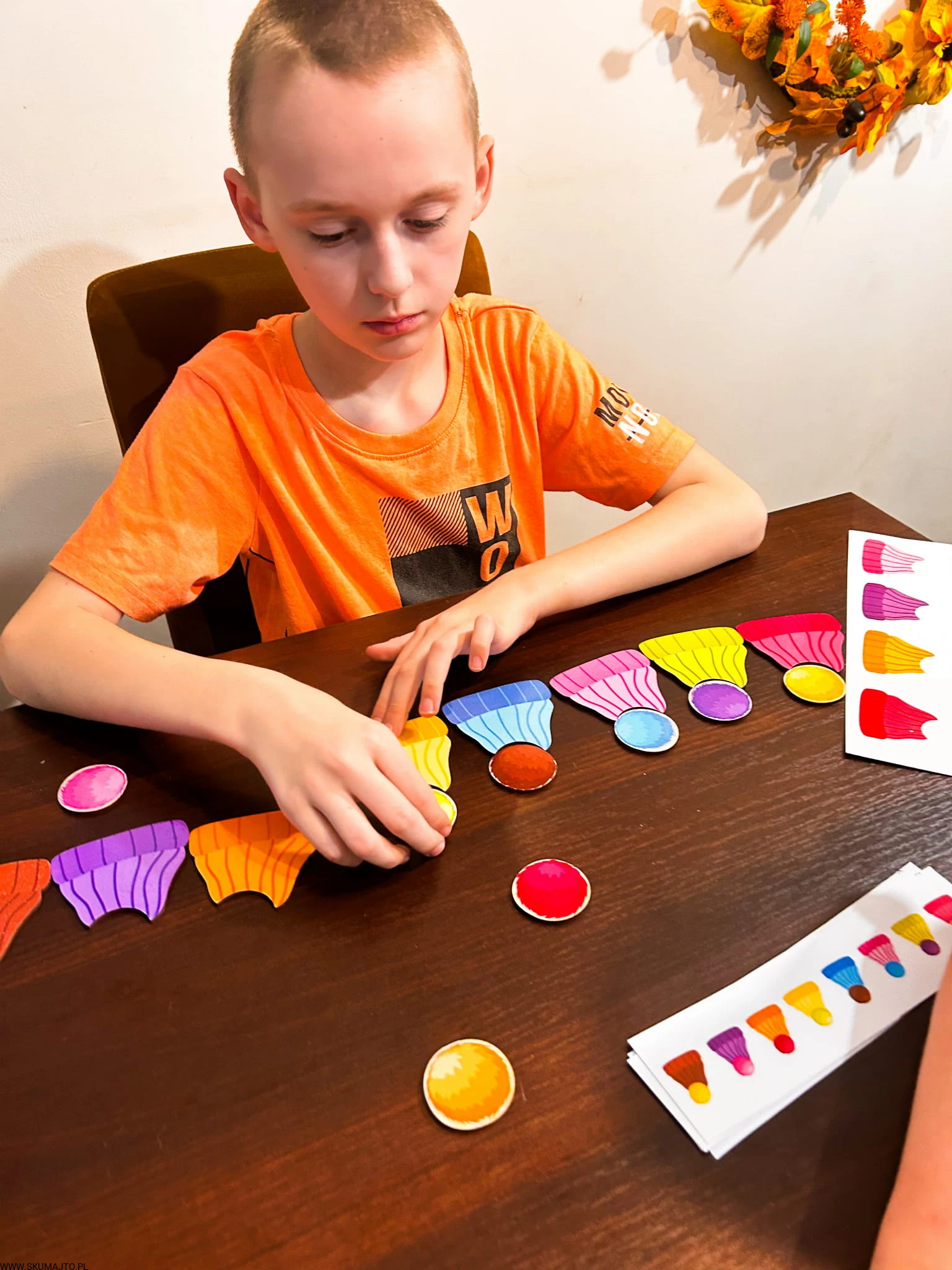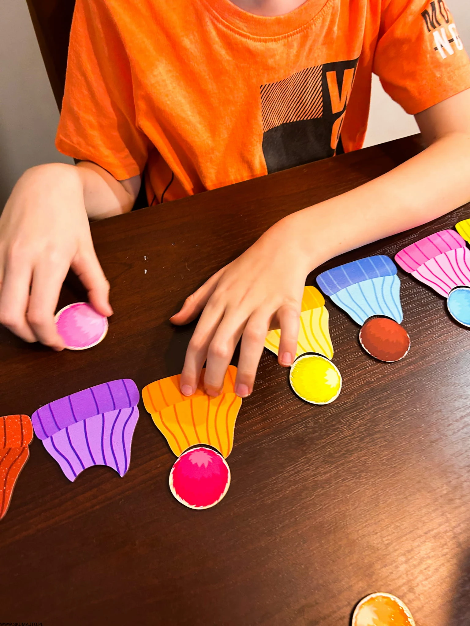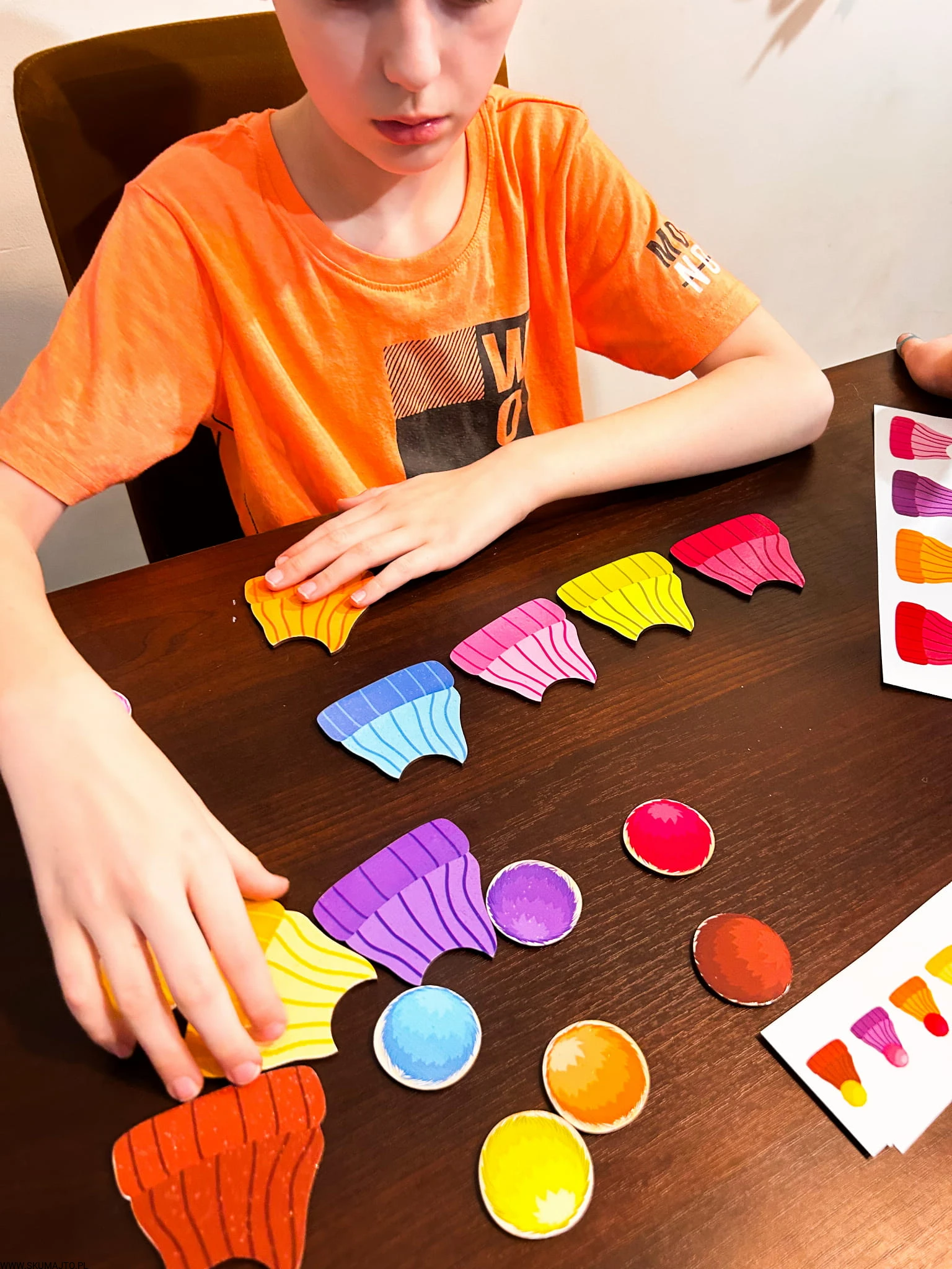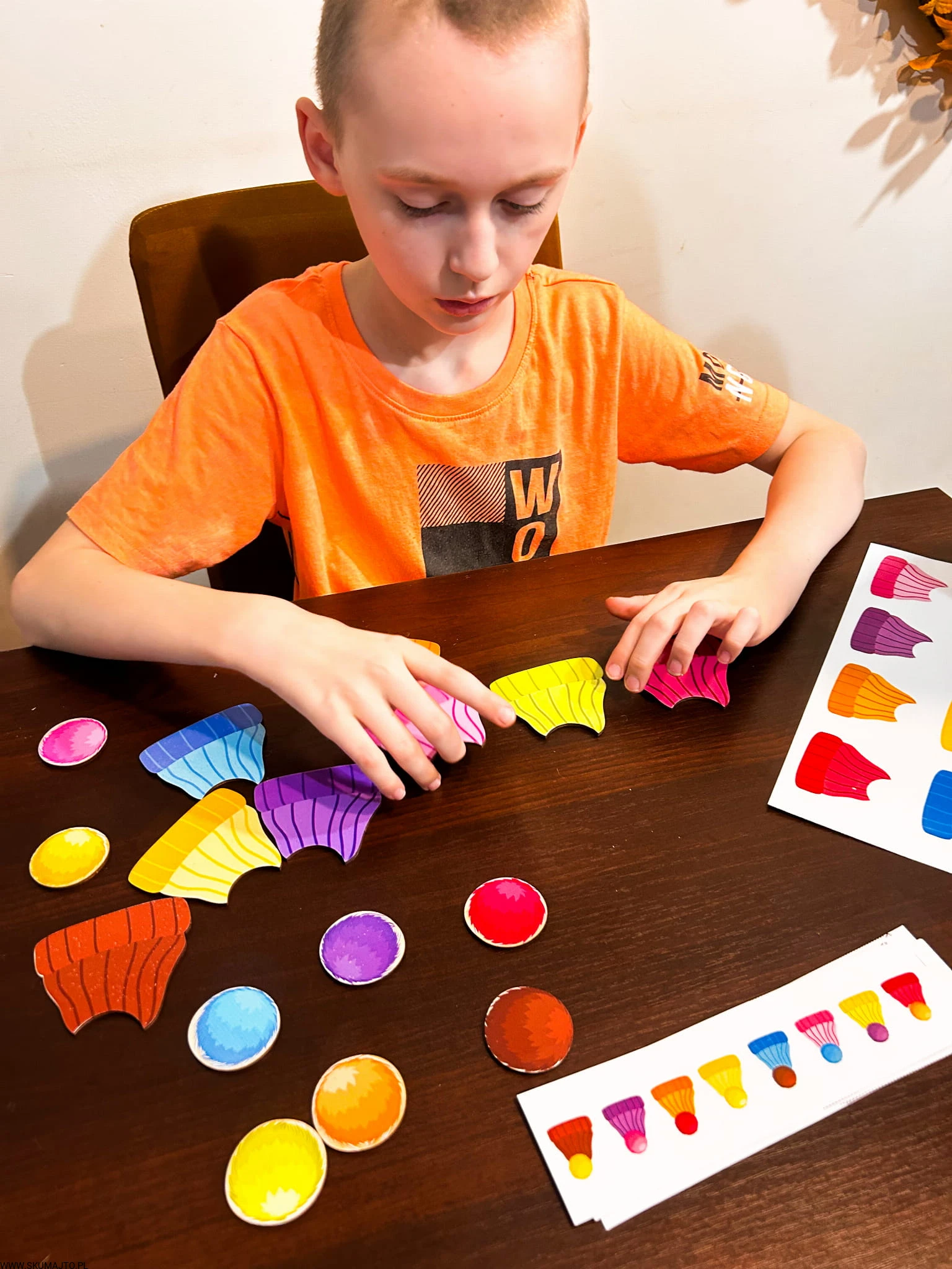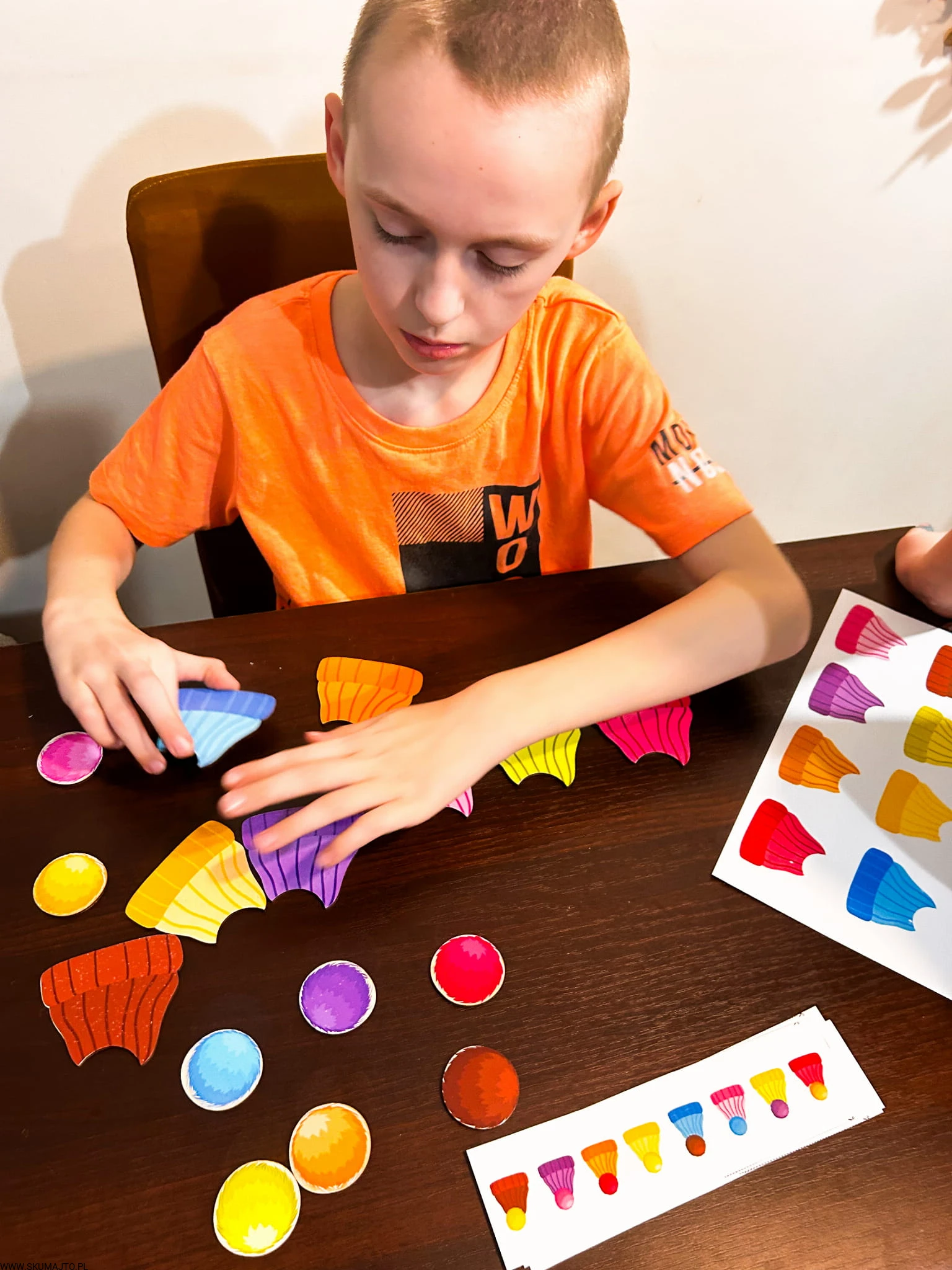 - Rozwijanie spostrzegawczości i logicznego myślenia – dziecko uczy się rozpoznawać kolory, łączyć je w odpowiednie pary i analizować wzory.