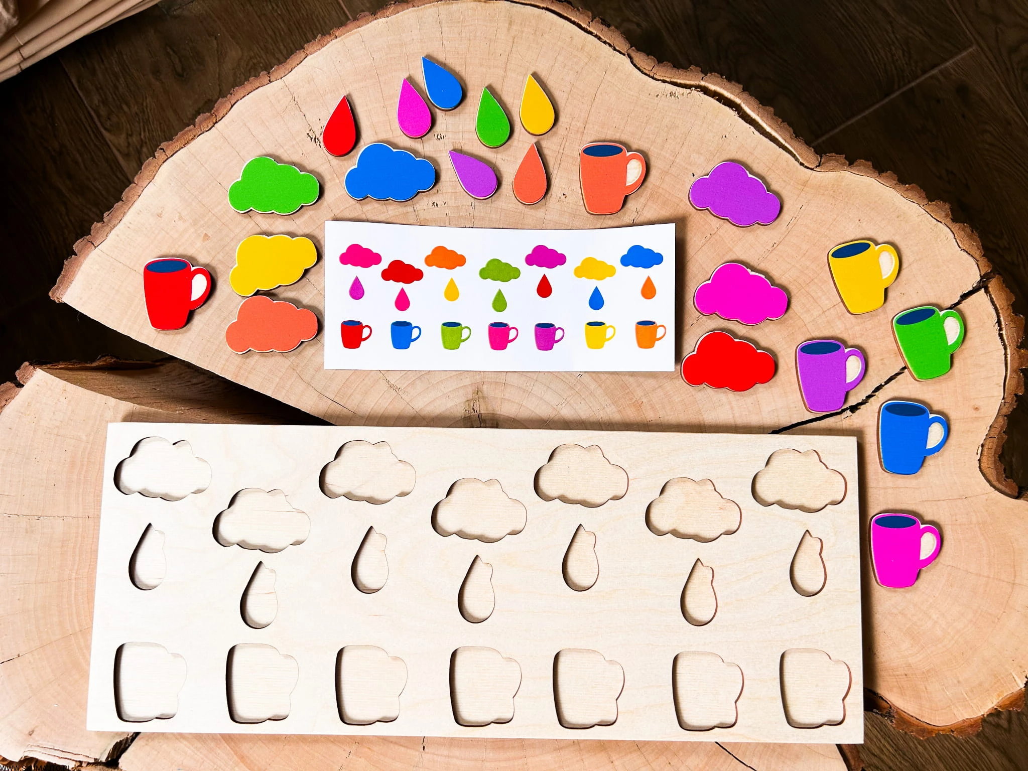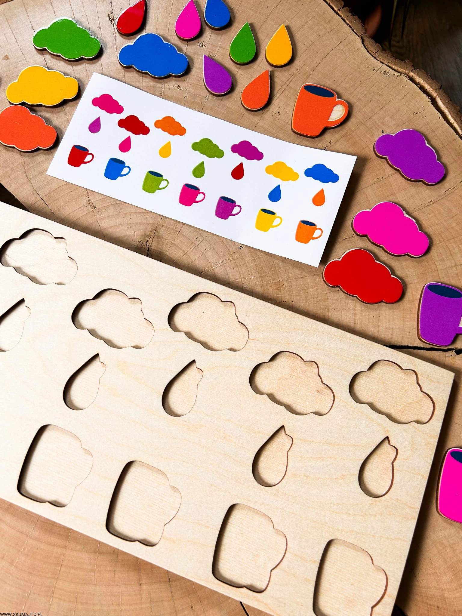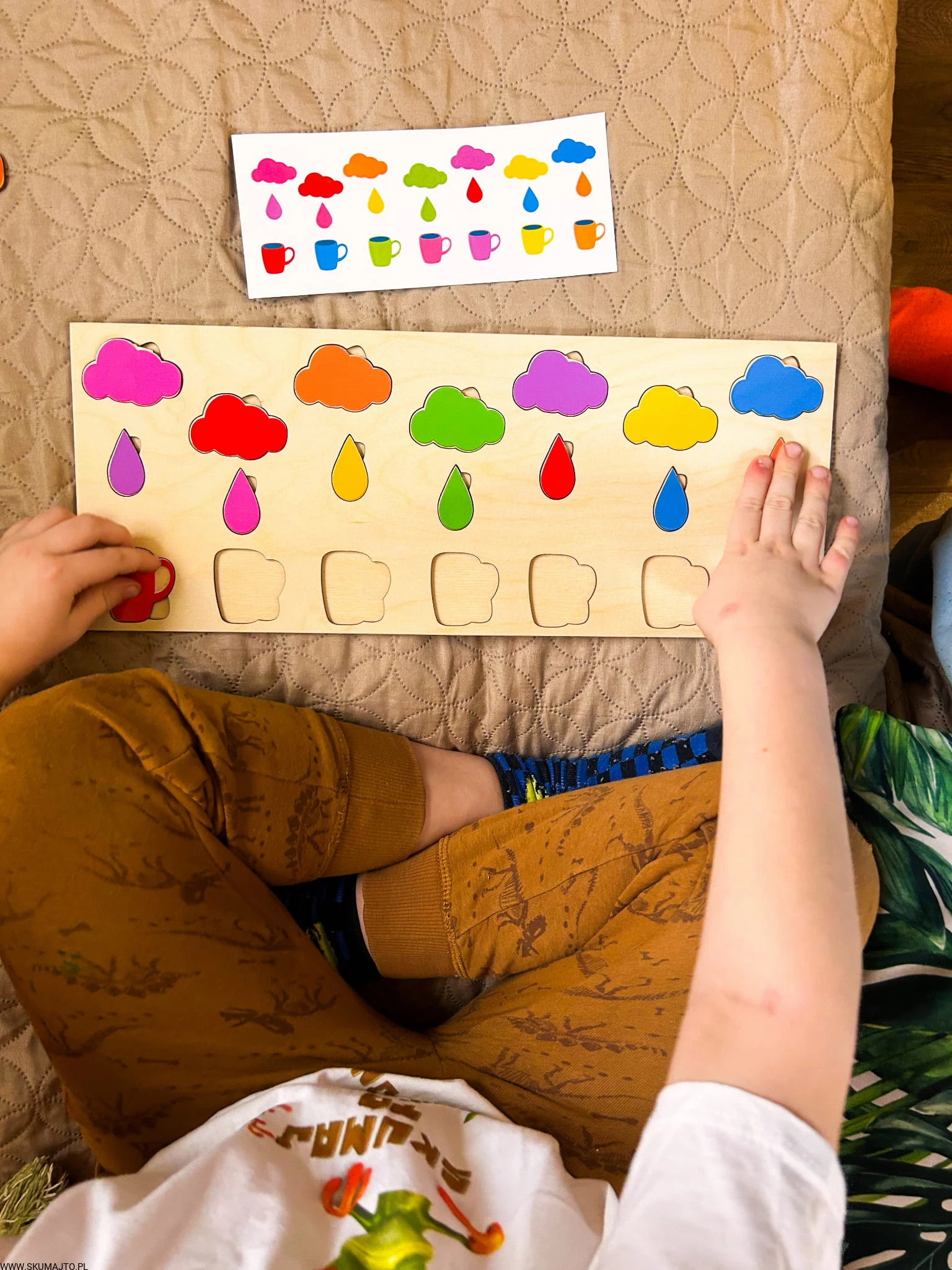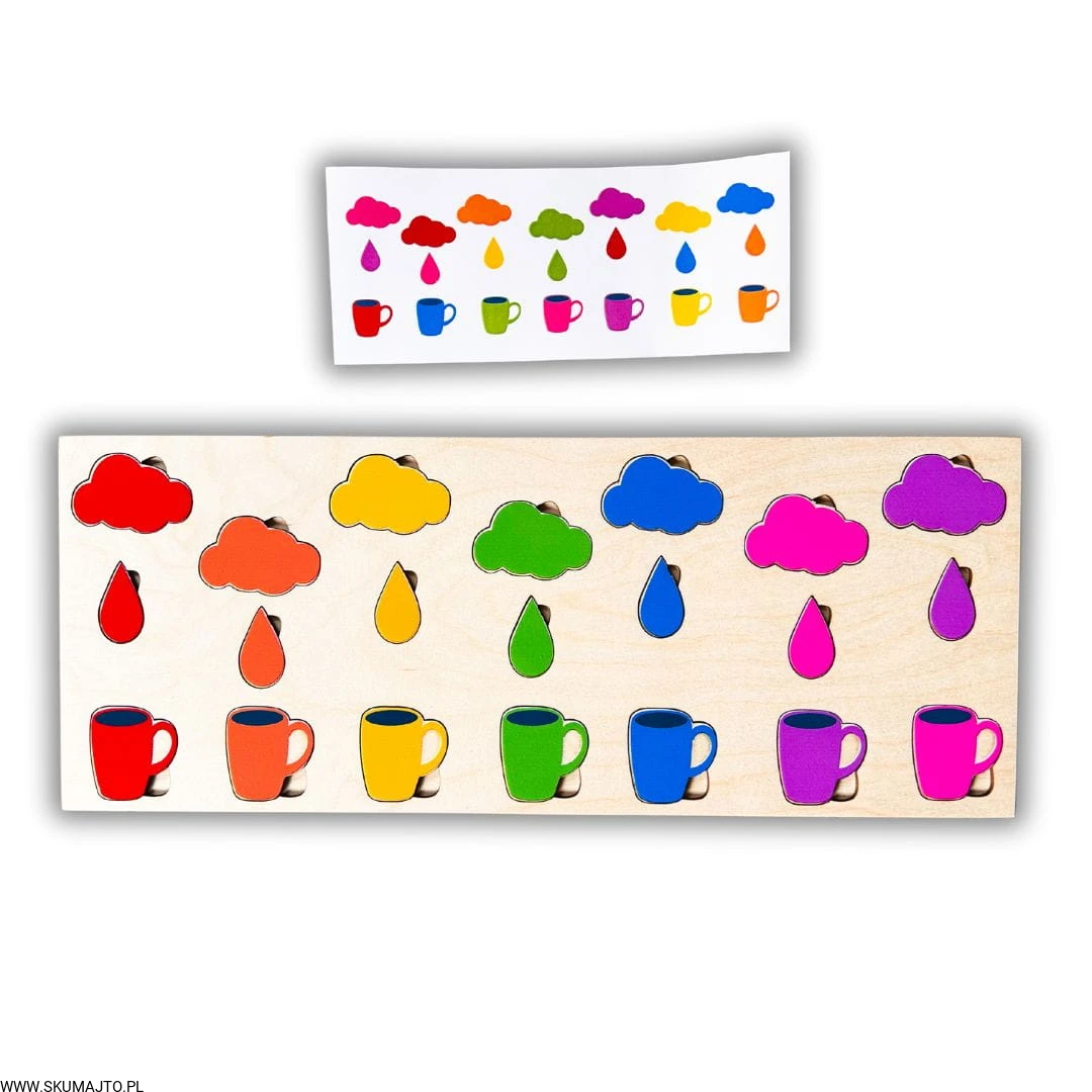 Stymulacja Rozwoju Poznawczego: Układanie kolorowych kubeczków, kropelek deszczu i chmurek na podstawie kart do odwzorowywania stymuluje rozwój percepcji wizualnej i zdolności rozpoznawania wzorów, co jest podstawą logicznego myślenia.