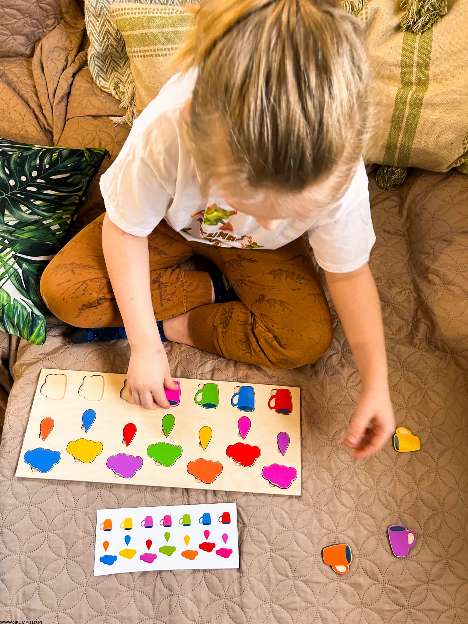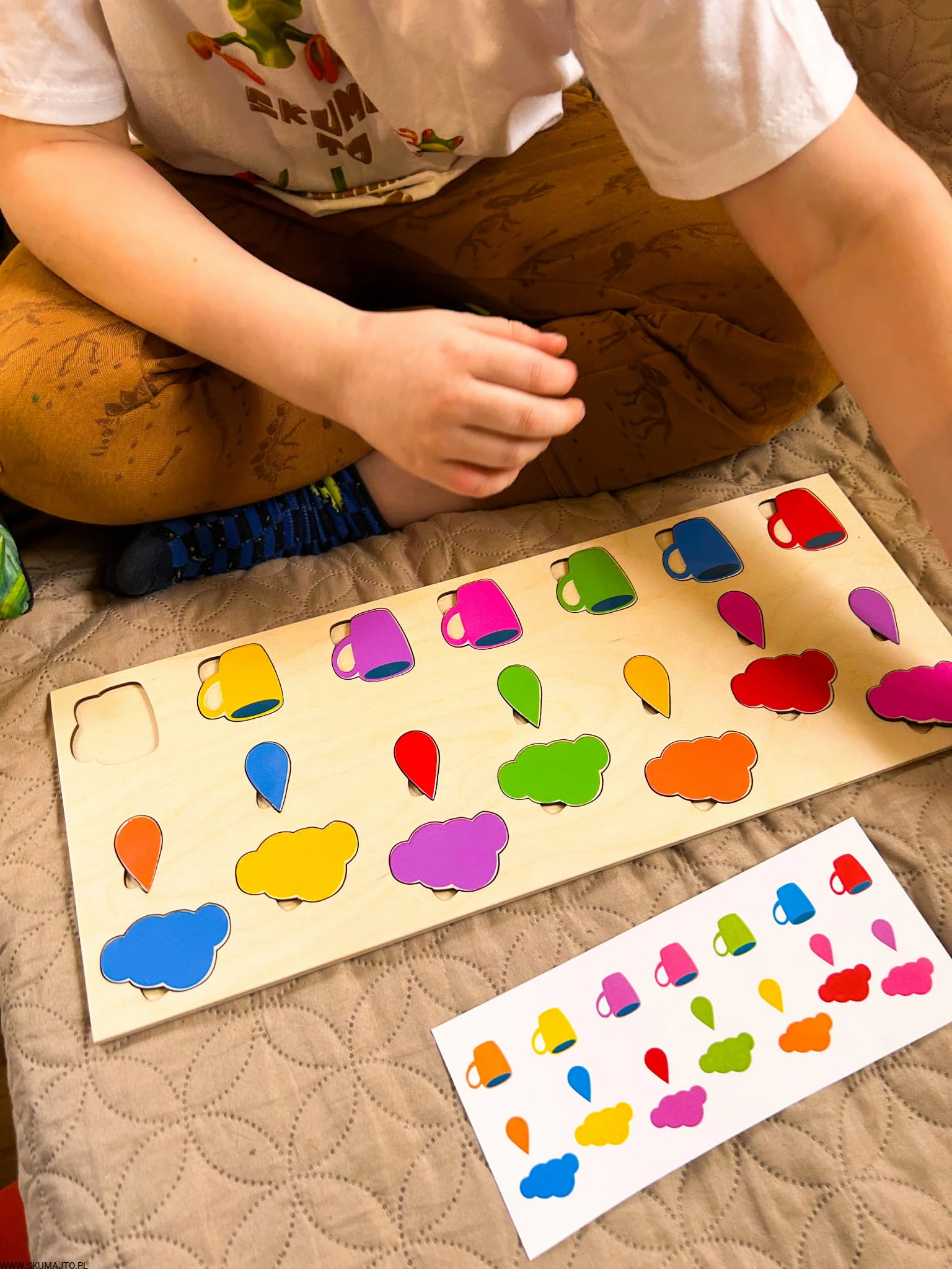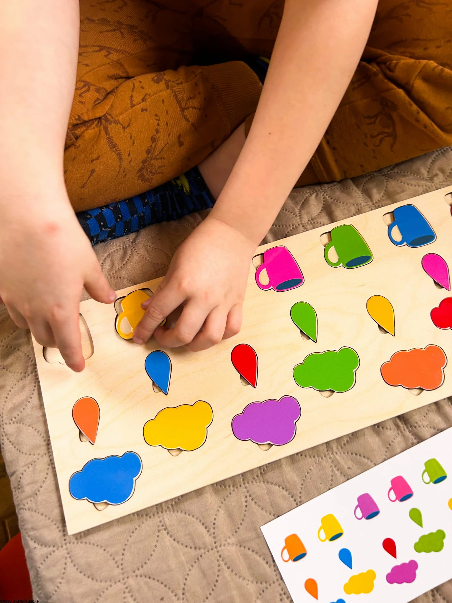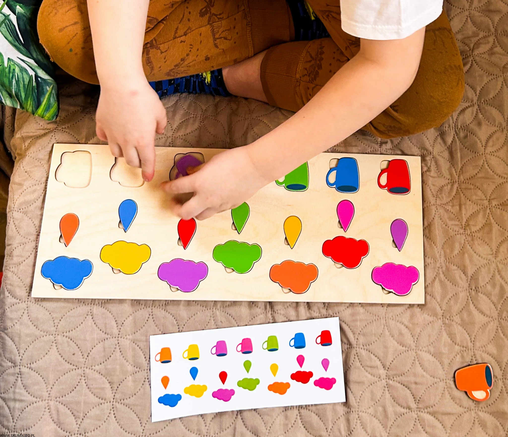 Stymulacja Rozwoju Poznawczego: Układanie kolorowych kubeczków, kropelek deszczu i chmurek na podstawie kart do odwzorowywania stymuluje rozwój percepcji wizualnej i zdolności rozpoznawania wzorów, co jest podstawą logicznego myślenia.