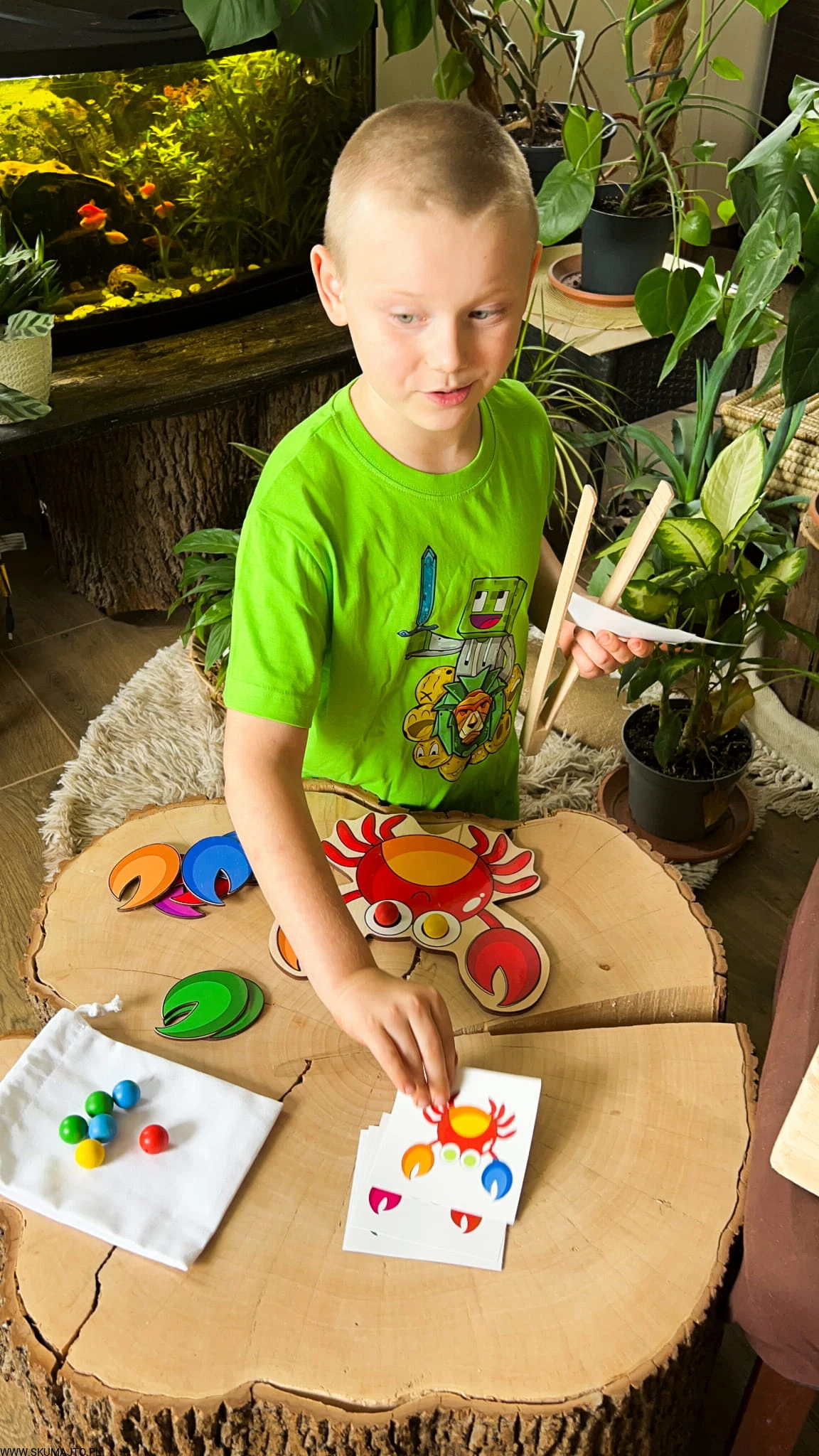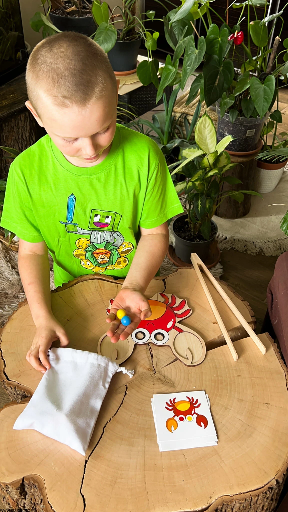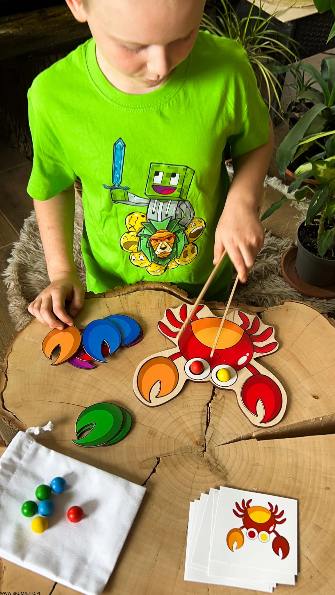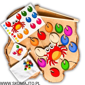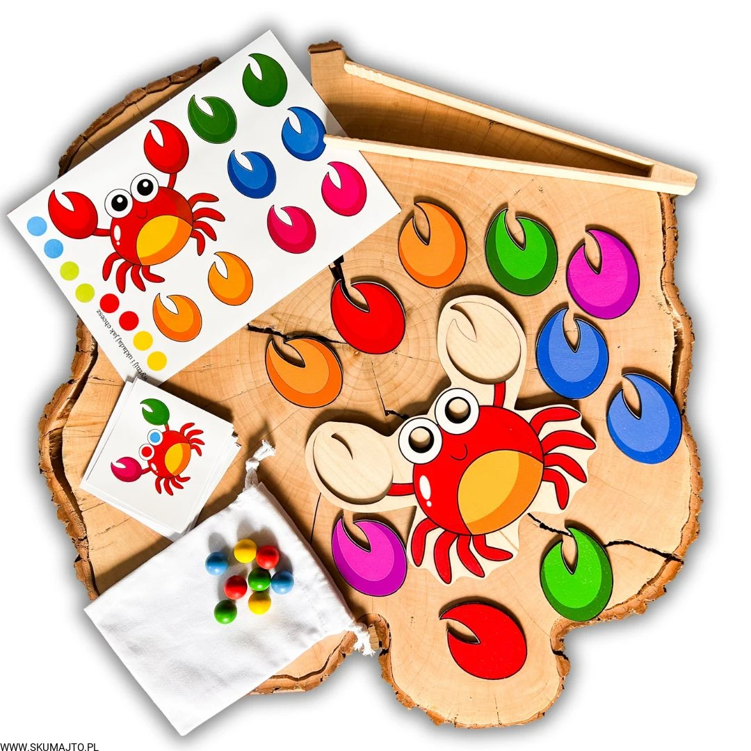 Zestaw Kompletny: W zestawie znajduje się drewniana podstawa o wymiarach 25x25cm, kolorowe szczypce kraba, kulki oraz karty z wzorami do odwzorowywania. Dzięki temu dziecko ma możliwość zabawy na wiele różnych sposobów, co sprzyja wszechstronnemu rozwojowi.