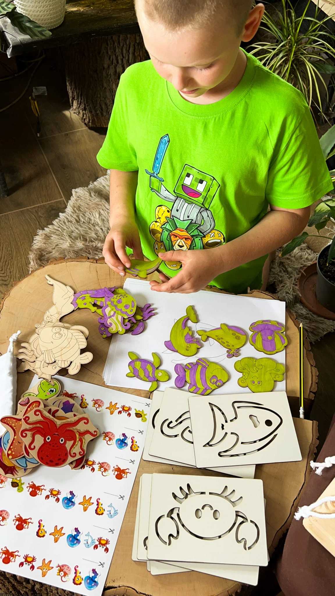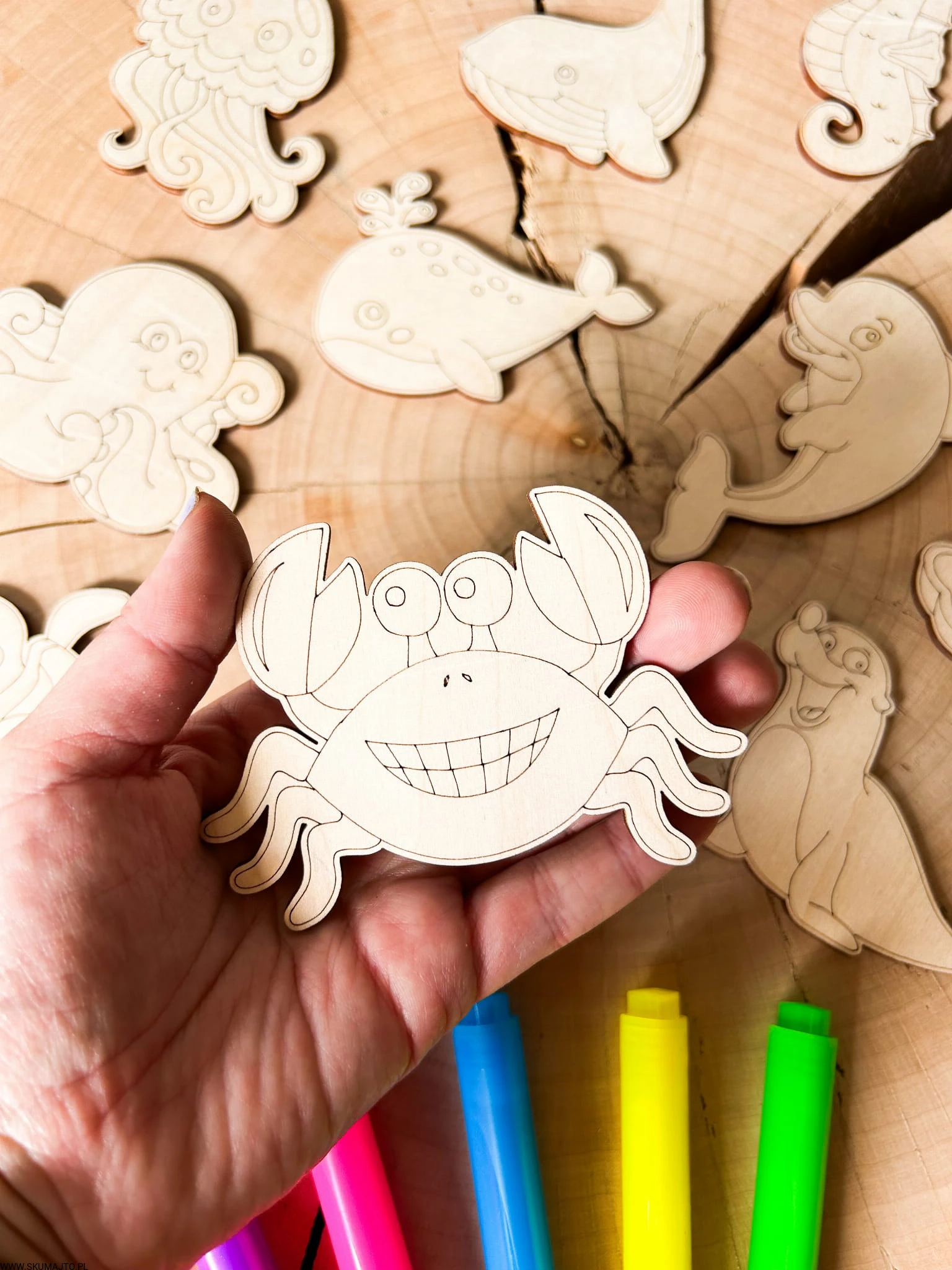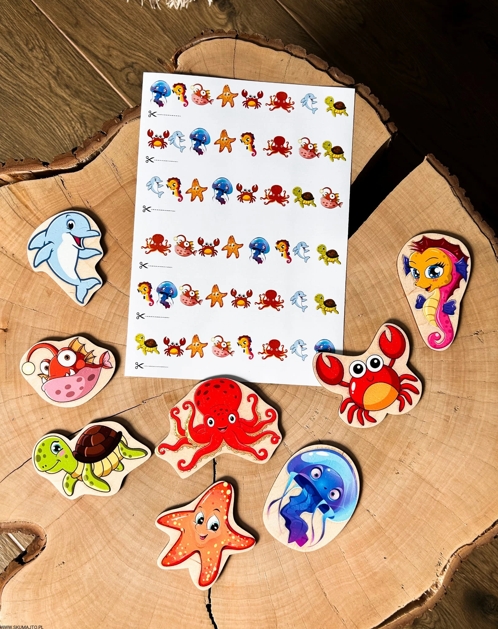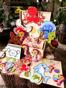 - Zestaw 12 drewnianych tabliczek (ok. 7x7 cm) przedstawiających morskie zwierzęta, które dziecko może pokolorować kredkami, flamastrami lub farbami. W zestawie bawełniany woreczek.