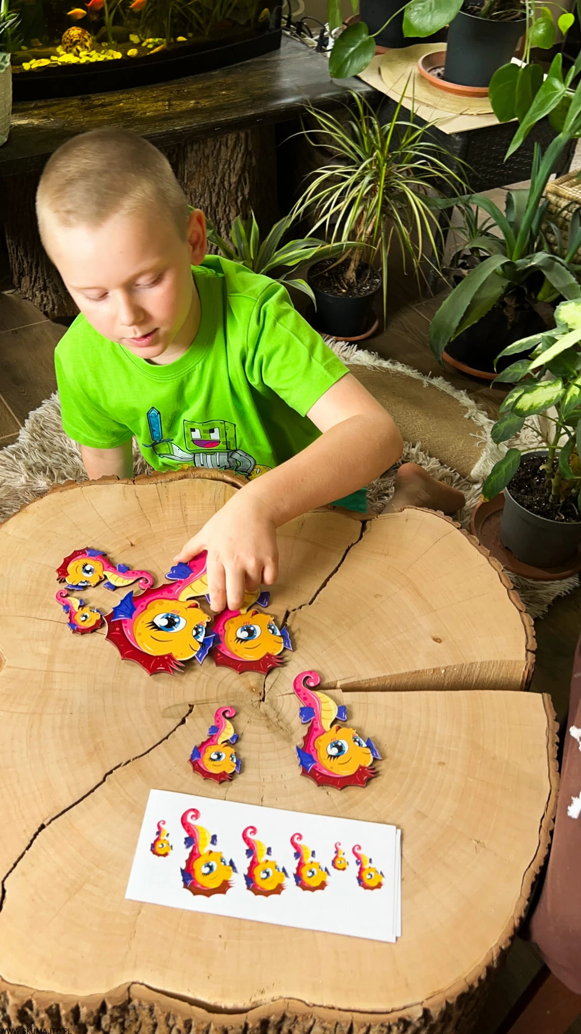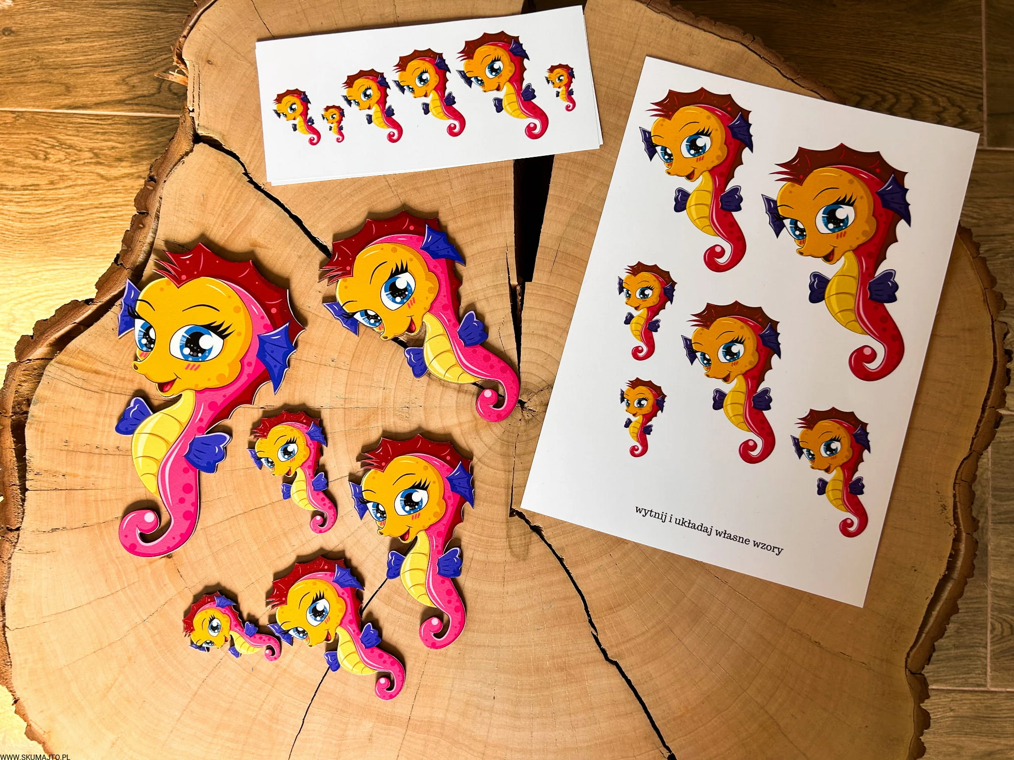 - Zestaw 6 koników morskich o różnej wielkości (od 5 cm do 25 cm). Zadaniem dziecka jest ułożenie koników według kart do odwzorowywania. W zestawie bawełniany woreczek.