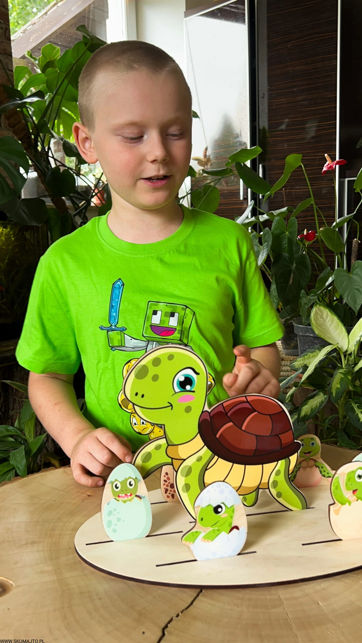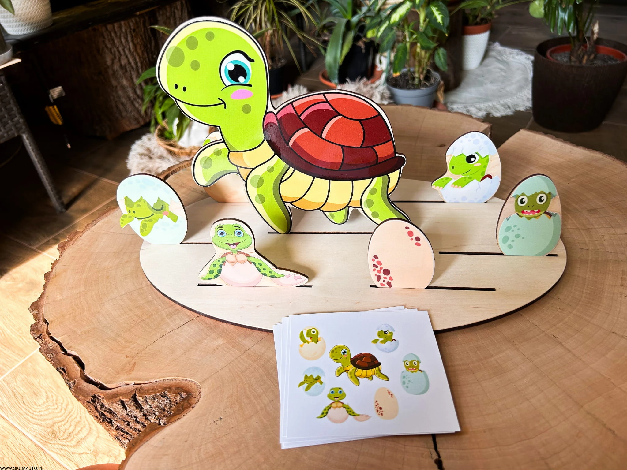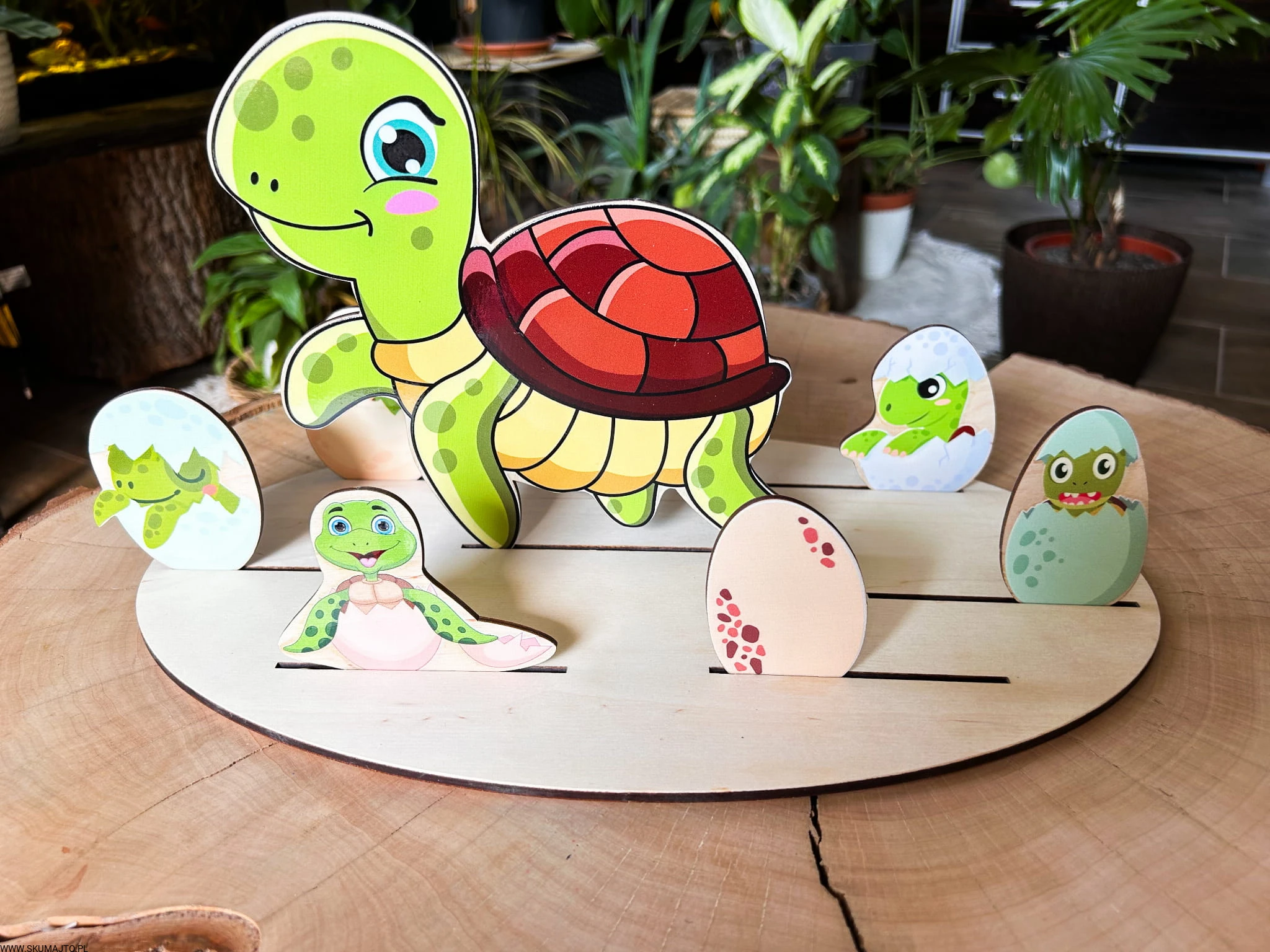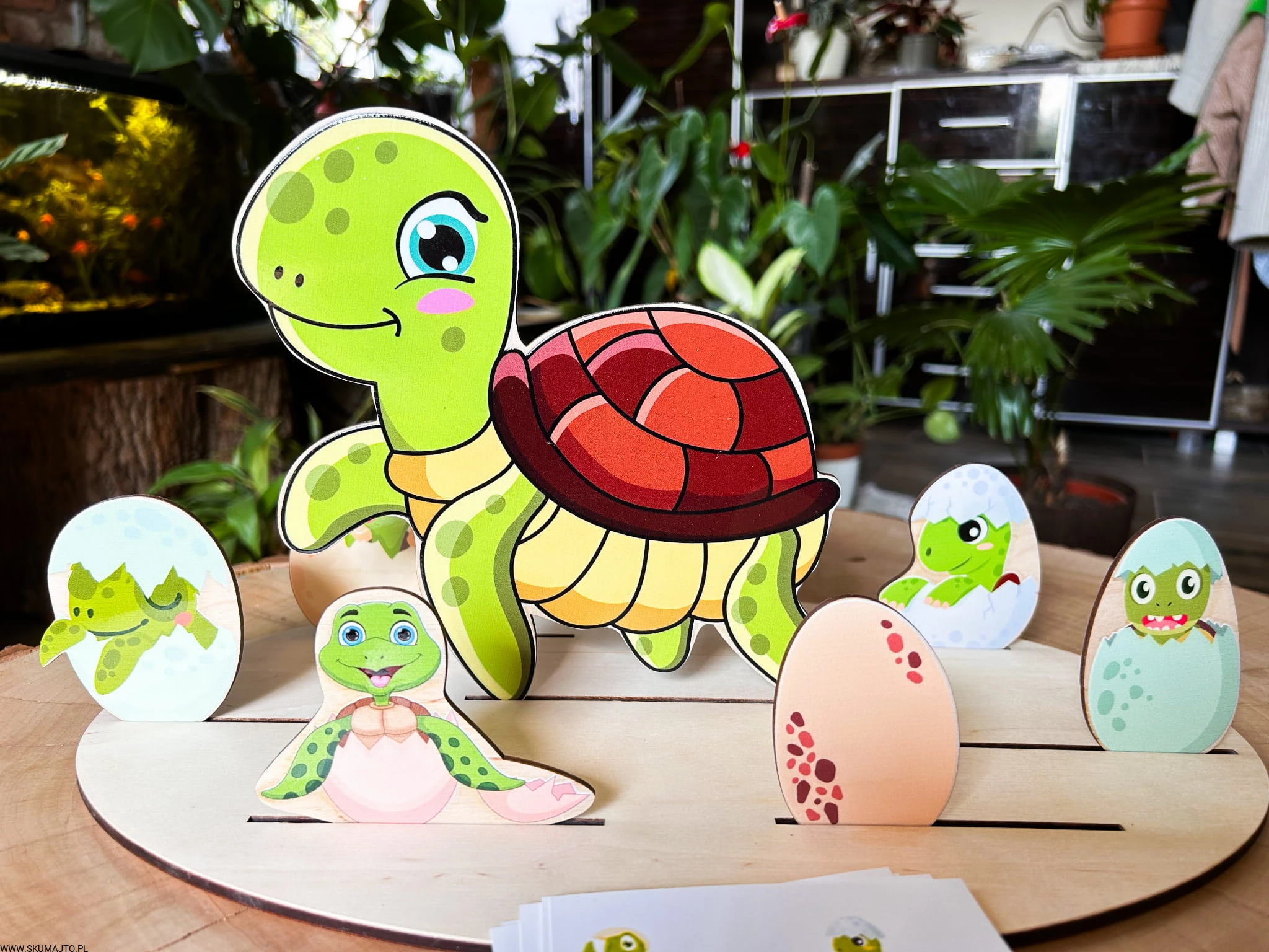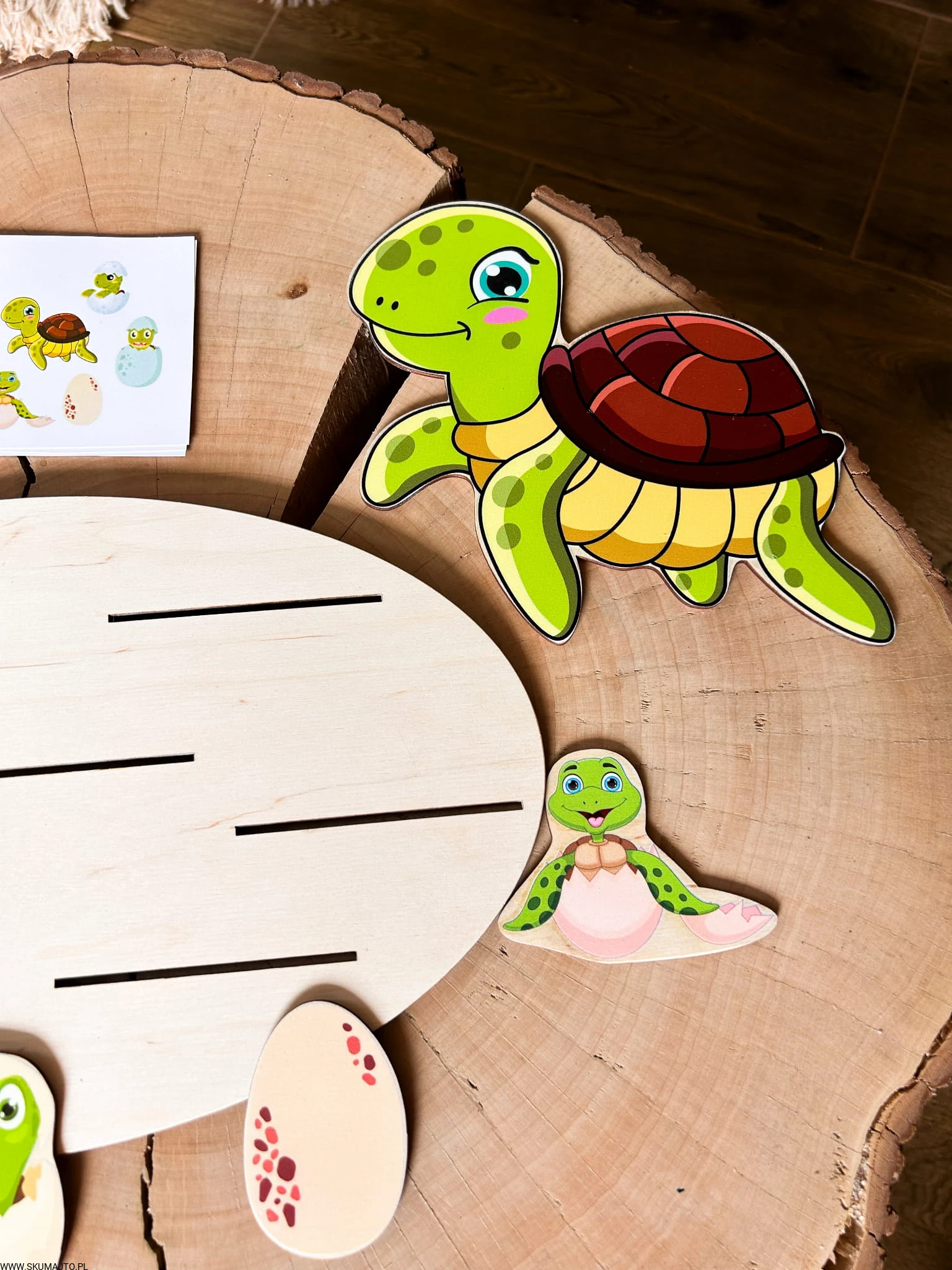 - Zadaniem dziecka jest ułożenie żółwi wykluwających się z jajek wokół dorosłego żółwia. Zestaw zawiera podstawkę (35x25 cm), 6 małych żółwików, dorosłego żółwia i bawełniany woreczek.