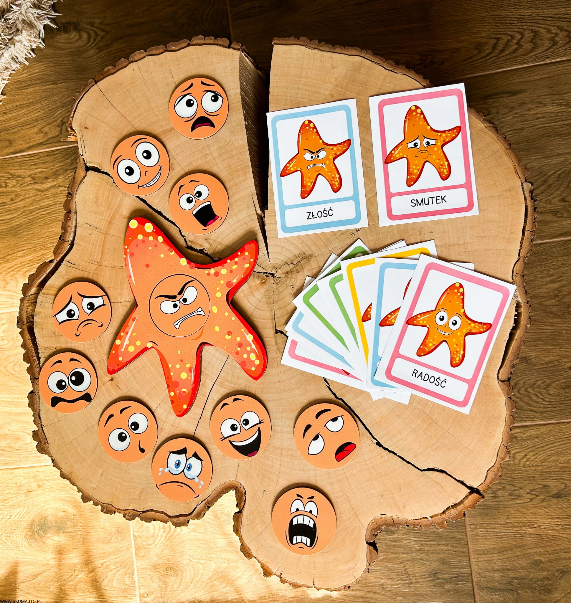 - Zadaniem dziecka jest dopasowanie buziek z emocjami do rozgwiazdy. Zestaw zawiera podstawkę z rozgwiazdą, 11 buziek z emocjami i 11 kart z opisami emocji oraz bawełniany woreczek.