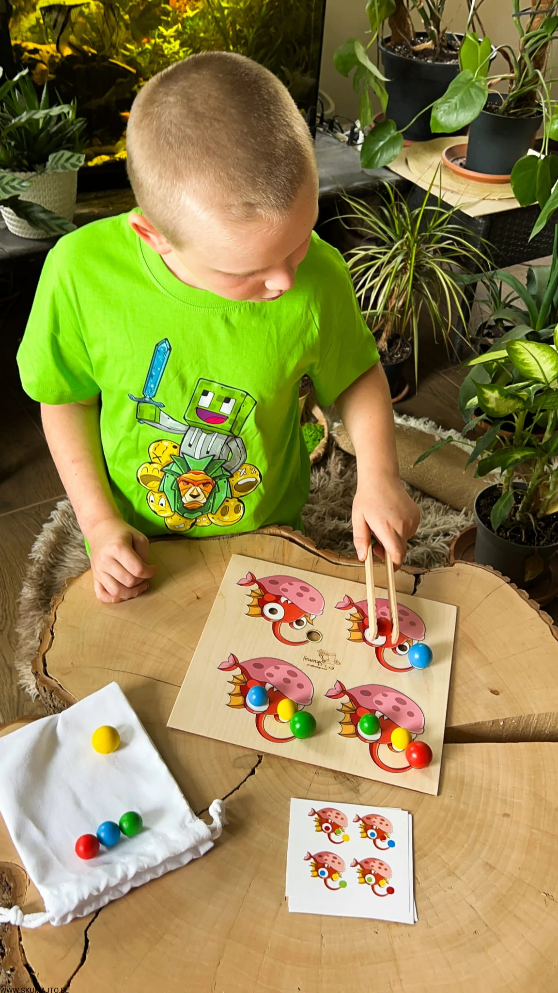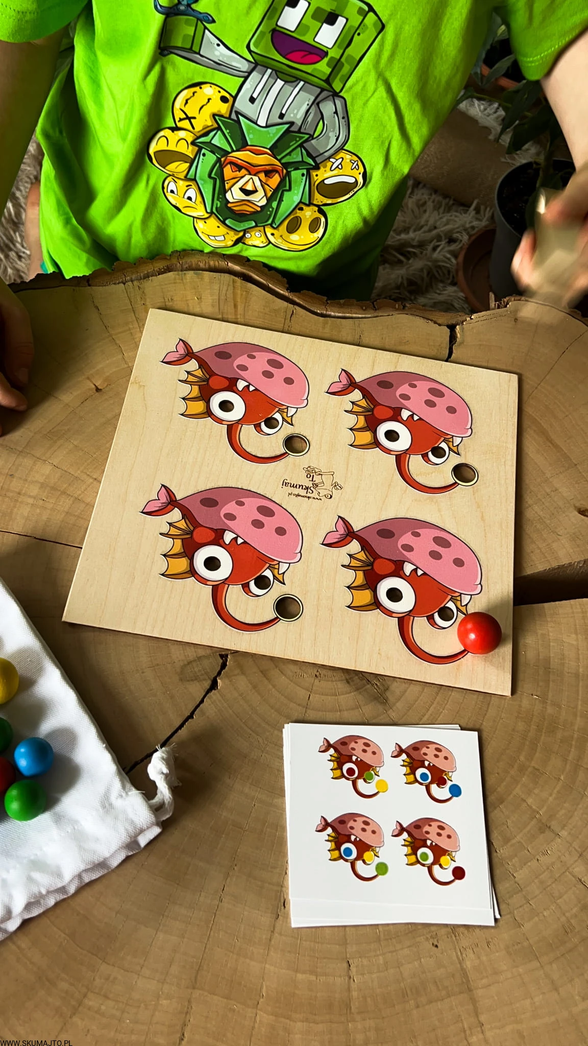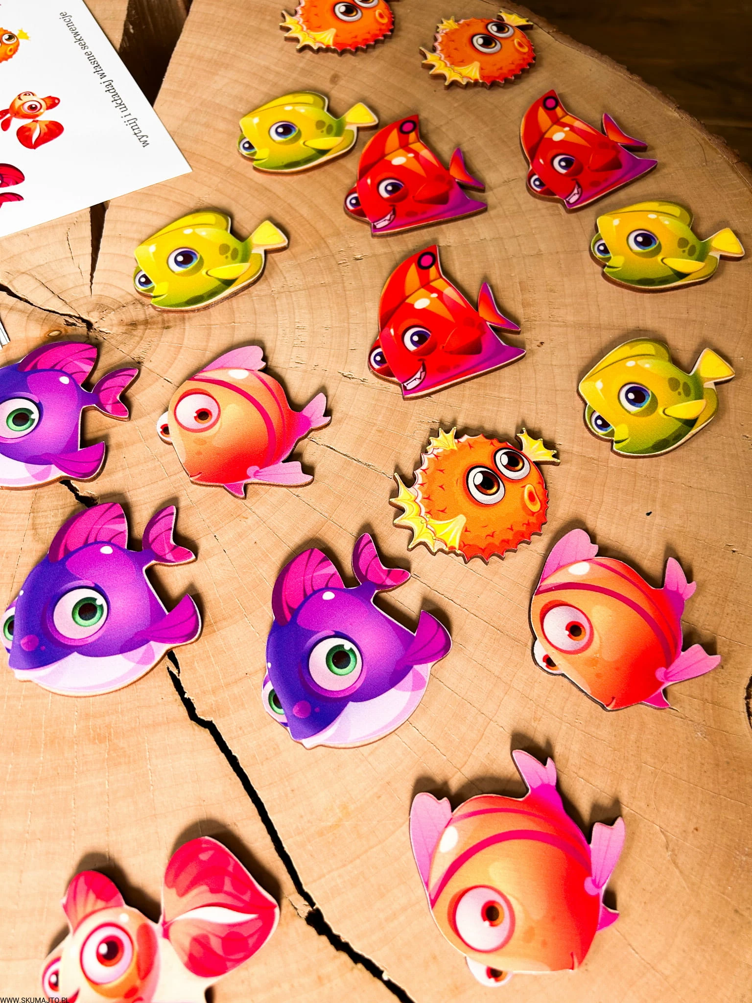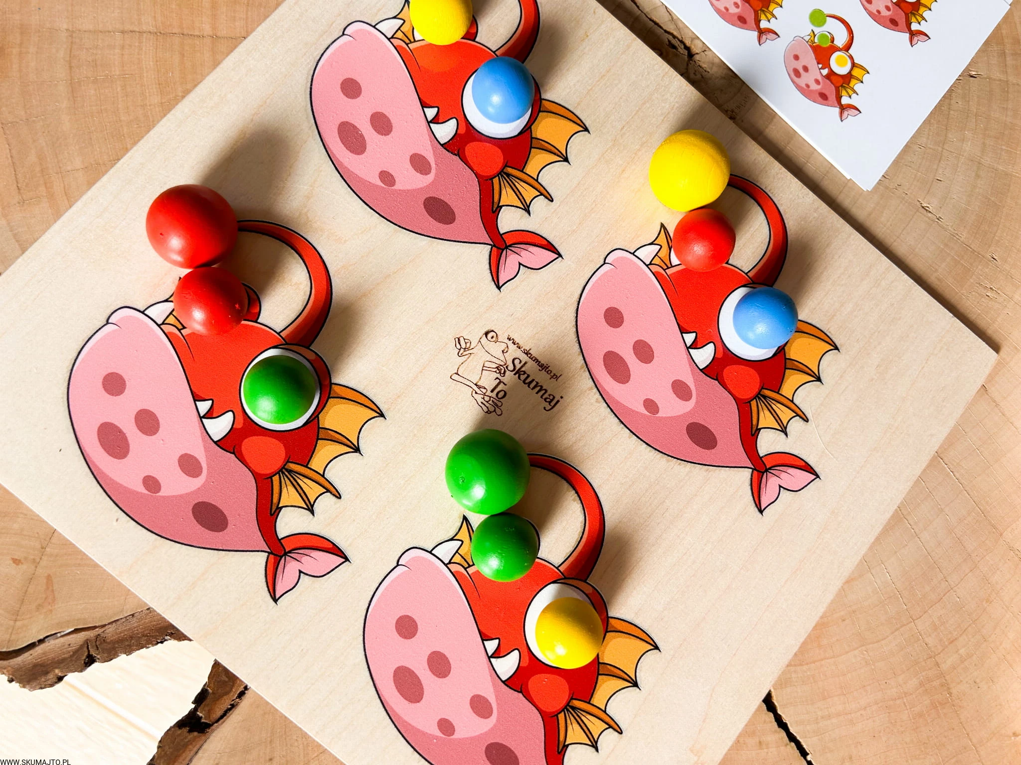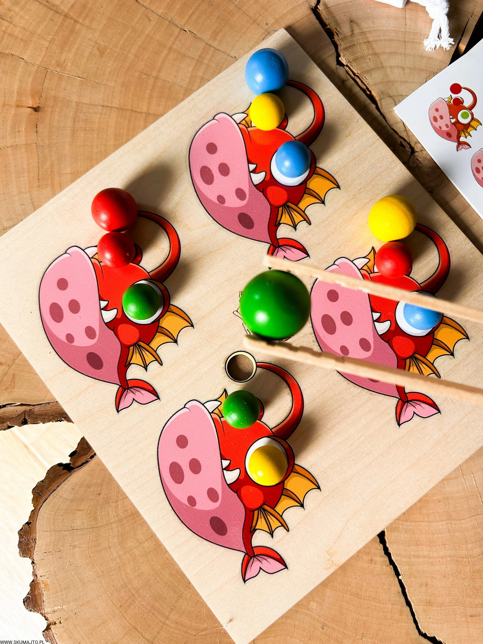 - Zadaniem dziecka jest odwzorowanie układu kolorowych, drewnianych kulek na rybach, zgodnie z dołączonymi kartami. Zestaw zawiera podstawkę z 4 rybami, kolorowe kulki (2 cm), drewniane szczypce oraz bawełniany woreczek.