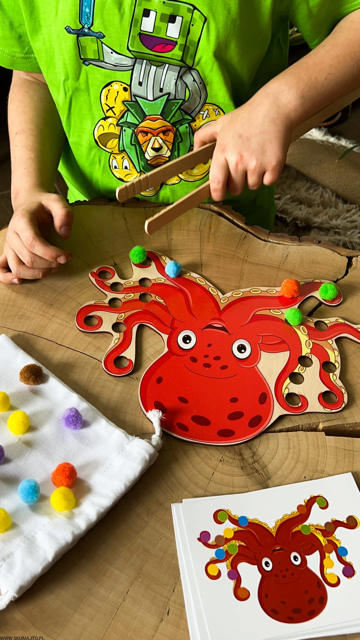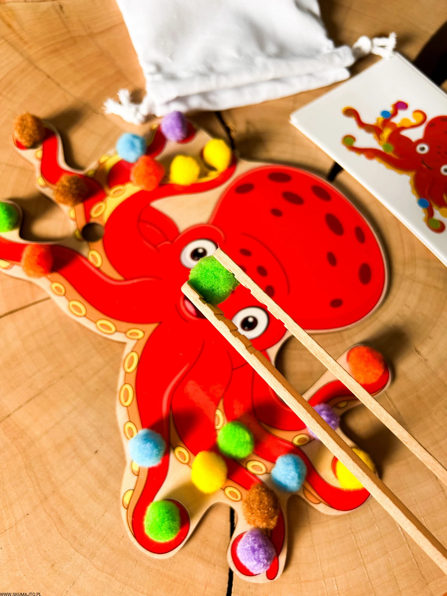 - Zadaniem dziecka jest ułożenie pomponików na ośmiornicy zgodnie z kartami do odwzorowywania. Zestaw zawiera podstawkę (25x25 cm), 20 pomponików, szczypce i bawełniany woreczek.